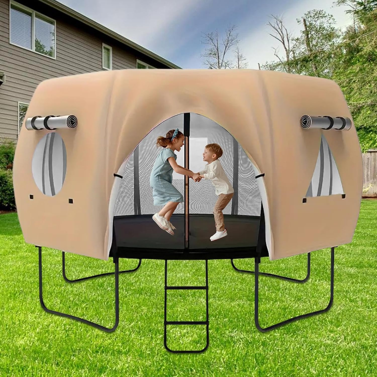 Costruzione : Prodotta con robusto telaio rinforzato e tessuto resistente agli agenti atmosferici per protezione ombreggiante costante e duratura nel Schermo UV e Pioggia: Realizzato per sicurezza all'aperto totale, impedisce la penetrazione 'acqua piovana e protegge dalle radiazioni ultraviolette in diversi ambienti esterni Utilizzo versatile: ad asta curva garantisce installazione sicura su trampolini tondi da 4,2 metri, offrendo copertura affidabile e adattabilità per molteplici applicazioni Comodità d'Uso: Design "posa e usa" permette schermo solare di aprirsi direttamente sul trampolino, offrendo installazione veloce che preserva ed energia per il libero. Circolazione Aria Intelligente: Pannello in rete e copertura trasparente facilitano il flusso d'aria assicurando vista panoramica libera in modo efficace