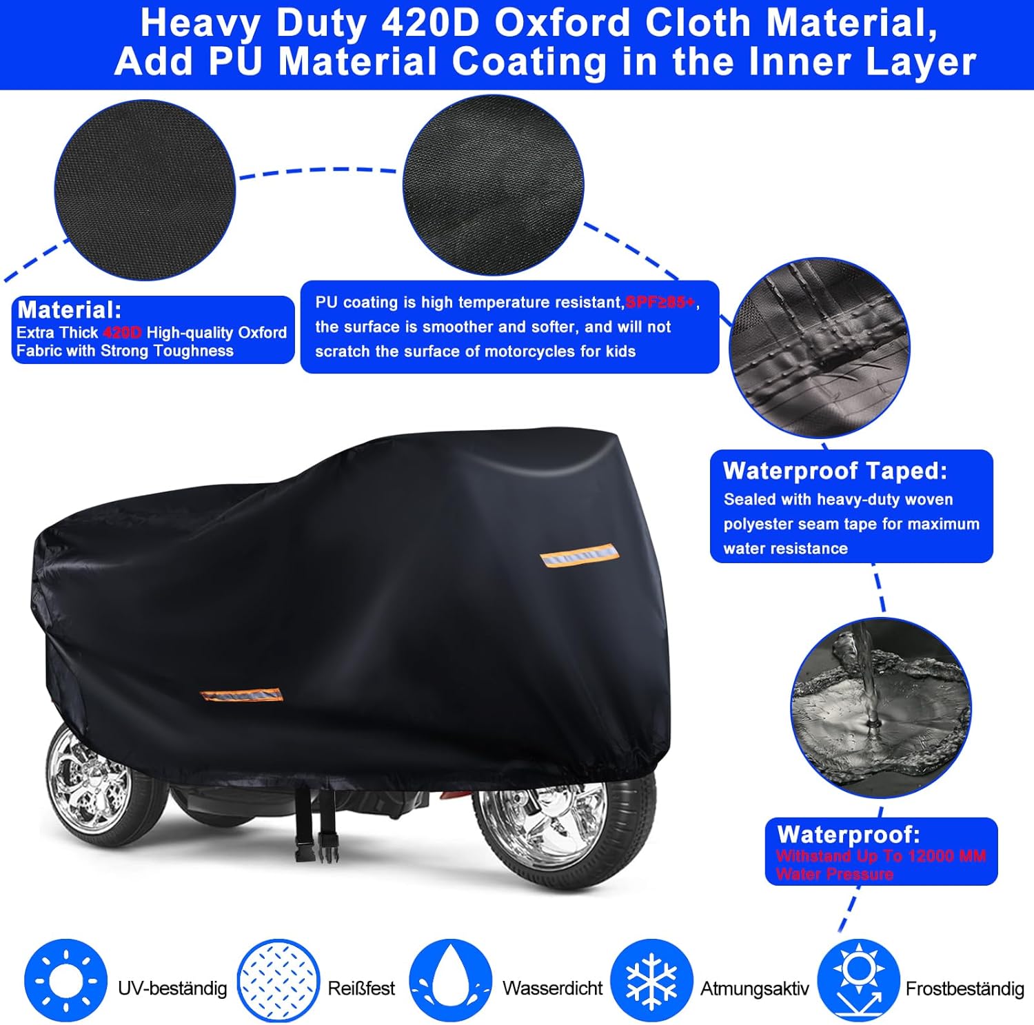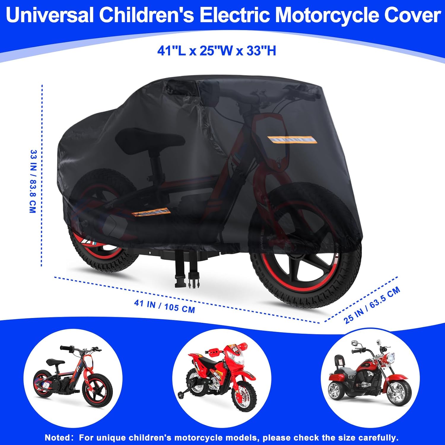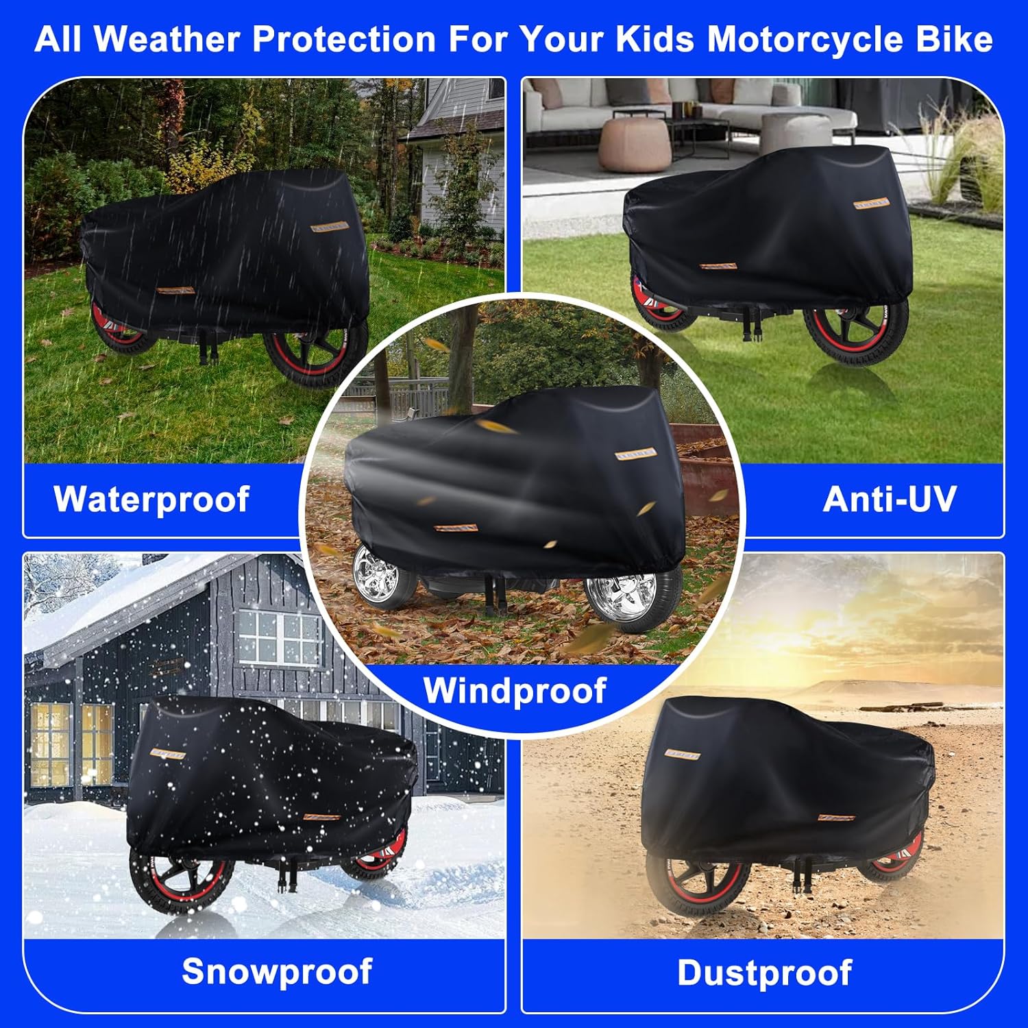 Materiale di alta qualità: il copriauto per bambini è realizzato in tessuto Oxford 420D extra spesso di alta qualità con rivestimento in PU all'interno, in modo che lo strato interno sia extra liscio, morbido e non graffi l'auto elettrica per bambini. Sono state aggiunte strisce impermeabili alle cuciture e, grazie al design con cuciture doppie, può resistere fino a 12.000 mm di pressione dell'acqua e proteggere il telo copriauto universale da pioggia, raggi UV (SPF>70+), polvere, crepe, escrementi di uccelli, foglie cadute ecc. Protezione completa per il telo copriauto giocattolo di grandi dimensioni: fibbie antivento fisse regolabili ed elastiche (al centro), l'auto elettrica per bambini antipioggia può essere fissata saldamente alle ruote motrici anche in caso di tempesta, in modo che il tuo l'auto elettrica per bambini è sicura, affidabile e asciutta. Una copertura per macchinine per bambini che resiste davvero al vento, alla pioggia, al sole e alla neve. Design migliorati: l'orlo elastico anteriore e posteriore si adatta all'auto elettrica per bambini. Con 4 strisce riflettenti ad alta visibilità, aumenta la sicurezza delle moto di notte e previene le collisioni. Copertura universale impermeabile:DIMENSIONI: 105 cm L x 63,5 cm L x 83,8 cm A. Le nostre coperture per giocattoli per bambini sono universali e adatte a giocattoli per auto di diversi stili e marche. Ti consigliamo di misurare le dimensioni del tuo giro elettrico su veicoli per bambini (lunghezza, larghezza e altezza) prima dell'acquisto. Altri servizi: oltre a una copertura per auto giocattolo per bambini di alta qualità, riceverai anche una custodia portatile aggiuntiva per riporla e trasportarla facilmente. NOTA: non installare accessori affilati per veicoli elettrici sul veicolo elettrico da viaggio per bambini, altrimenti si danneggerà la grande copertura dell'auto giocattolo del camion.
