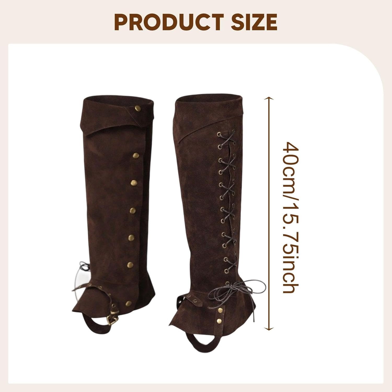 【Facile da indossare】: i copri stivali medievali Steampunk sono dotati di lacci, fibbie o passanti per cintura dal design vintage che conferiscono un aspetto storico pur essendo comodi per l'uso moderno 【Materiale di qualità】: i coprigambe medievali sono realizzati in pregiata pelle garantisce longevità e un'estetica medievale realistica 【Design protettivo】: i copri stivali da pirata offrono una protezione efficace contro graffi e urti durante battaglie o avventure all'aperto, garantendo al contempo un aspetto 【Versatili per vari eventi】: perfetti per cosplay di Halloween, convention di spettacoli teatrali. Questi copriscarpe da pirata sono perfetti anche per attività a tema medievale come equitazione ed escursionismo. 【Vestibilità universale】: i gambali Pirate Leg Gaiters sono progettati in una taglia universale adatta a tutti i formati con una lunghezza di 40 cm/15,75 pollici, adattandosi comodamente a varie misure di piede