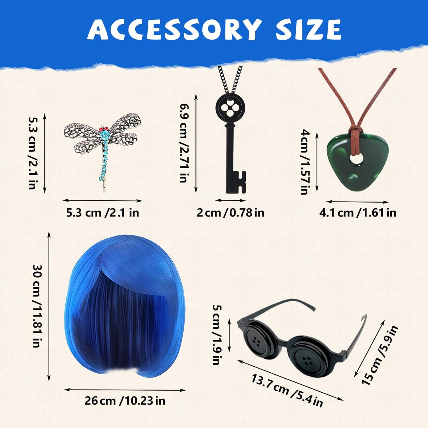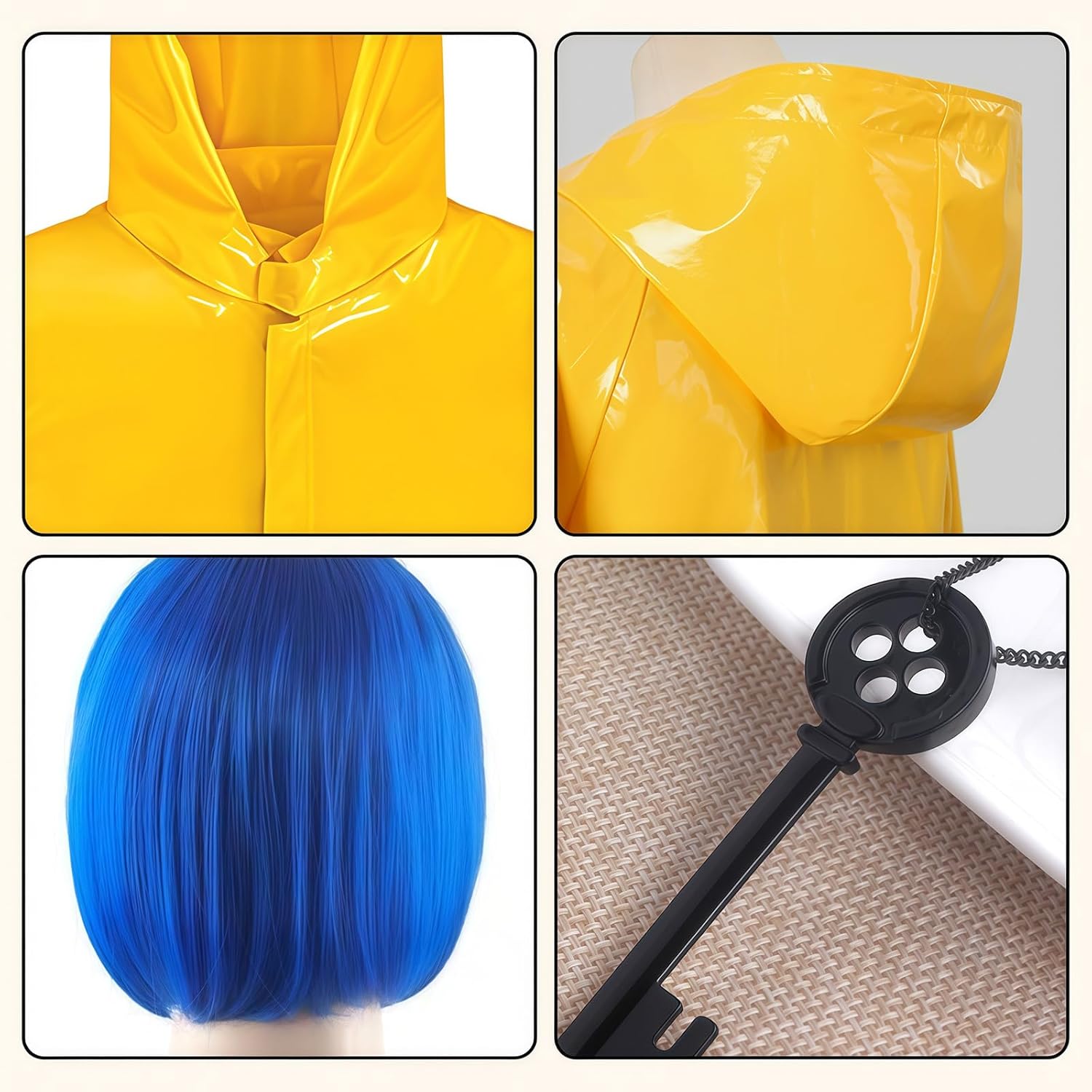 Descrizione prodotto Materiale: fibra di temperatura/resina/poliestere. Dimensioni: circonferenza della testa: 48-52 cm. Giacca antipioggia: M: 115-125 cm, L: 125-135 cm, XL: 135-145 cm. La confezione include: cappotto impermeabile giallo + pantaloni blu + parrucca coralina + forcina libellula + occhiali a bottone + collana chiave + collana con pietra visiva Colore: Giallo/Blu/Verde Occasione: Halloween, feste a tema, cosplay, spettacoli teatrali e altre occasioni Avviso di sicurezza Non adatto a bambini di età inferiore ai 3 anni