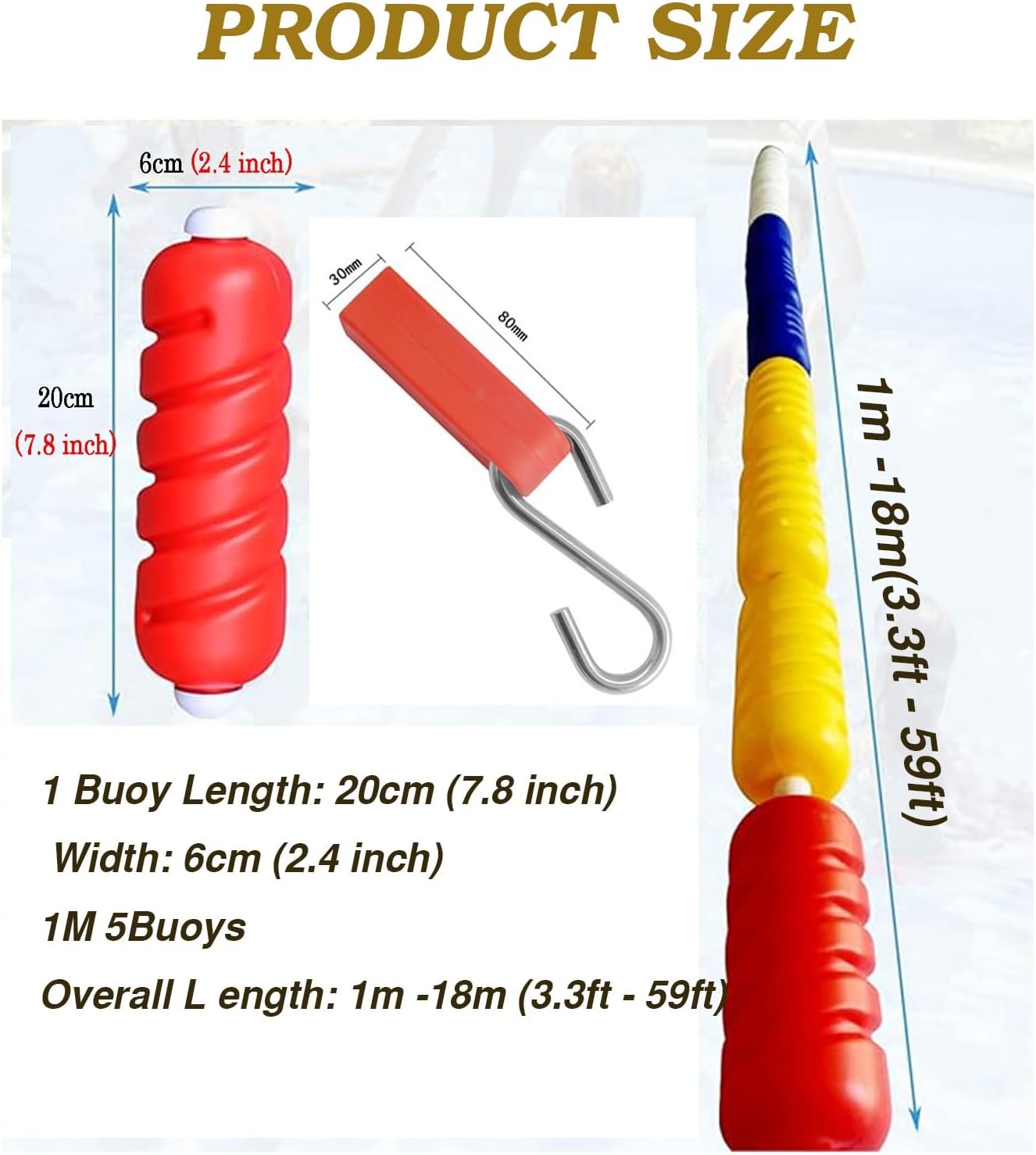 Parametri del prodotto: la linea di boa di sicurezza da 1 m/3,3 piedi ha 5 boe, ciascuna lunghezza della boa: 20 cm/7,8 pollici, larghezza: 6 cm/2,4 pollici. La corda può soddisfare le tue esigenze e quelle della piscina, mentre le boe integrate possono essere spostate per creare un'efficace percezione visiva per i nuotatori. Durevole e duraturo: la corda è progettata con due materiali, nylon resistente e filo di acciaio, e le boe sono realizzate in polietilene molto duro, che è leggero, galleggiante e molto stabile. Ma non si spezzeranno e non sbiadiranno a causa dell'esposizione alla luce solare e all'acqua e possono essere utilizzate per lungo tempo. Design ad alta visibilità: le 5 boe per piscina hanno colori altamente visibili e sono facili da vedere anche da lontano. Ciò garantisce che la corda di sicurezza della piscina sia chiaramente visibile ai nuotatori, ricordando loro i confini e aiutando a prevenire collisioni o accessi non autorizzati alle aree riservate della piscina. Facile da installare: la linea di boa di sicurezza adotta ganci in acciaio inossidabile, che è più semplice e più conveniente da installare. Dopo il fissaggio, è molto stabile e non si allenta. Maggiore sicurezza in piscina: la nostra corda di sicurezza per piscina con boe è progettata per fornire ulteriore sicurezza alla tua piscina. Utilizza boe dai colori vivaci e corde resistenti per formare una barriera trasparente che separa l'acqua bassa da quella profonda, impedendo ai nuotatori giovani e inesperti di entrare in acque profonde, contribuendo a ridurre il rischio di incidenti e a garantire un ambiente di nuoto sicuro.