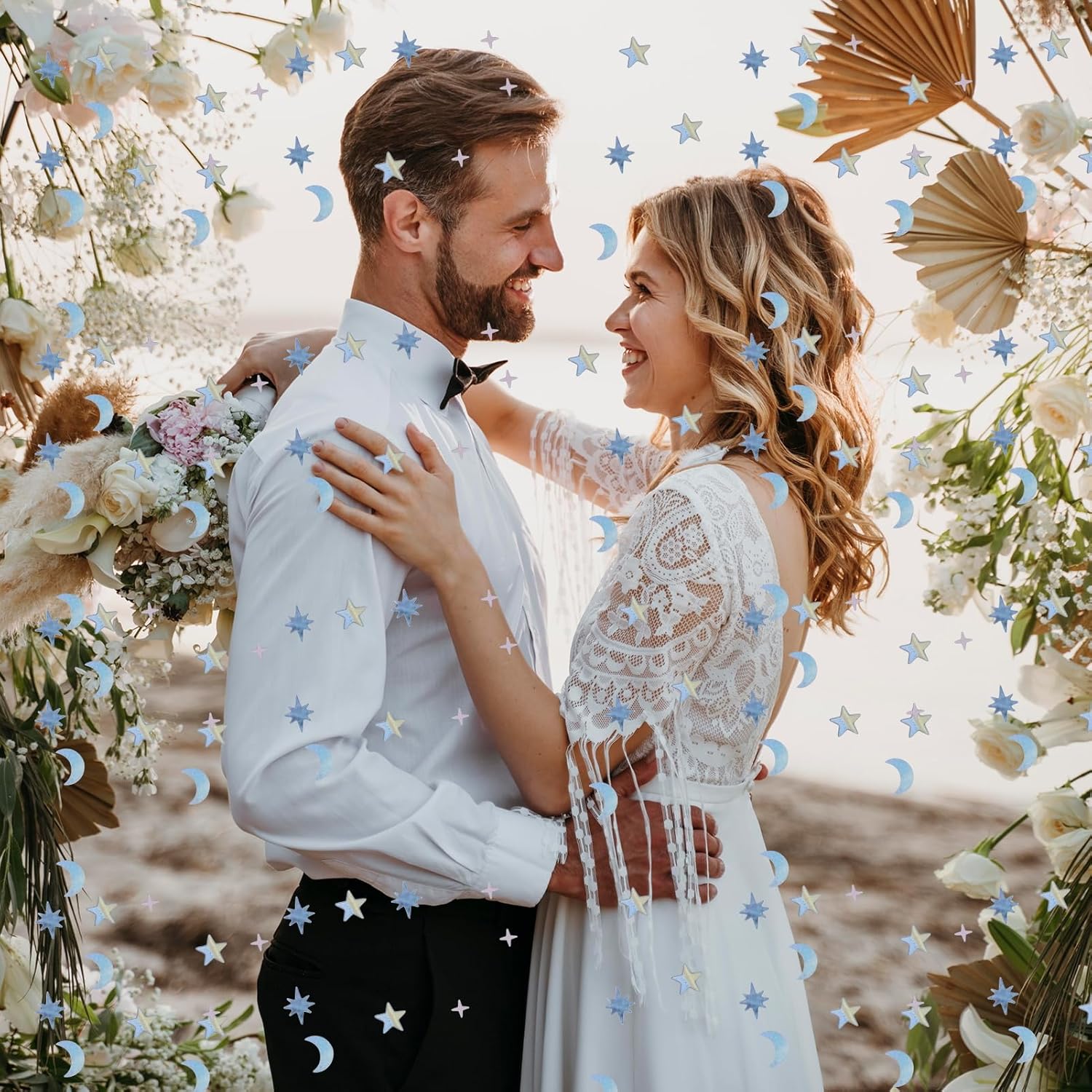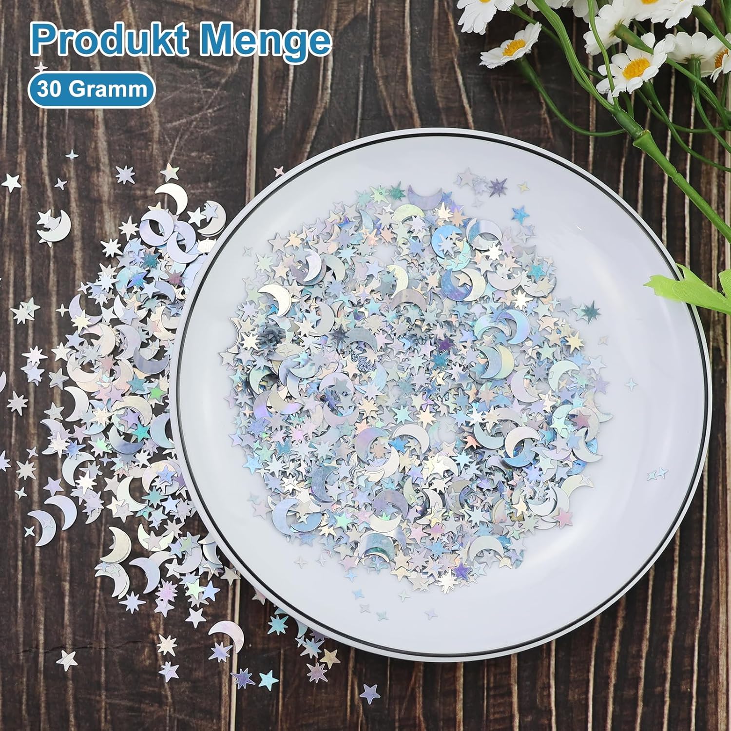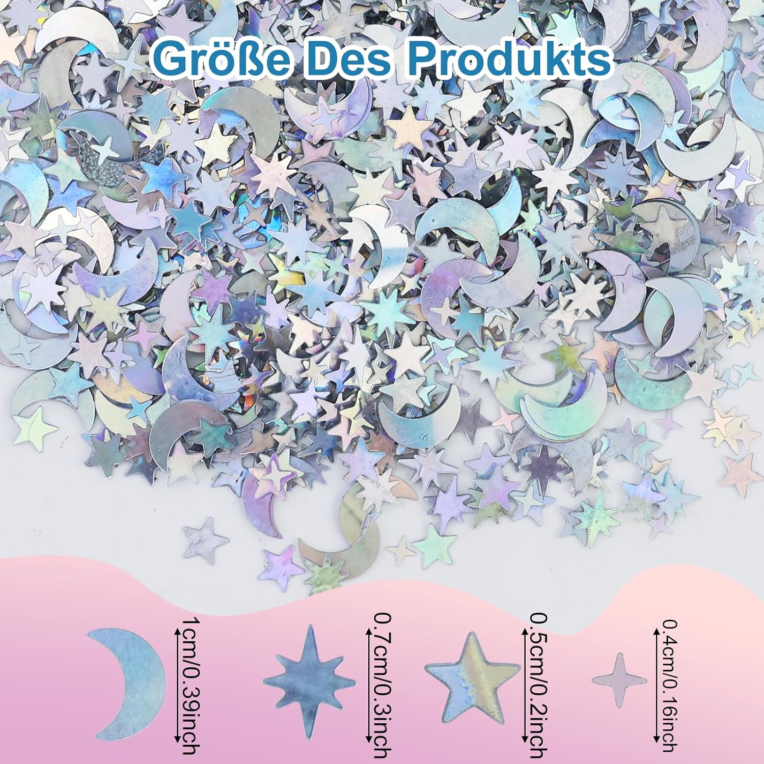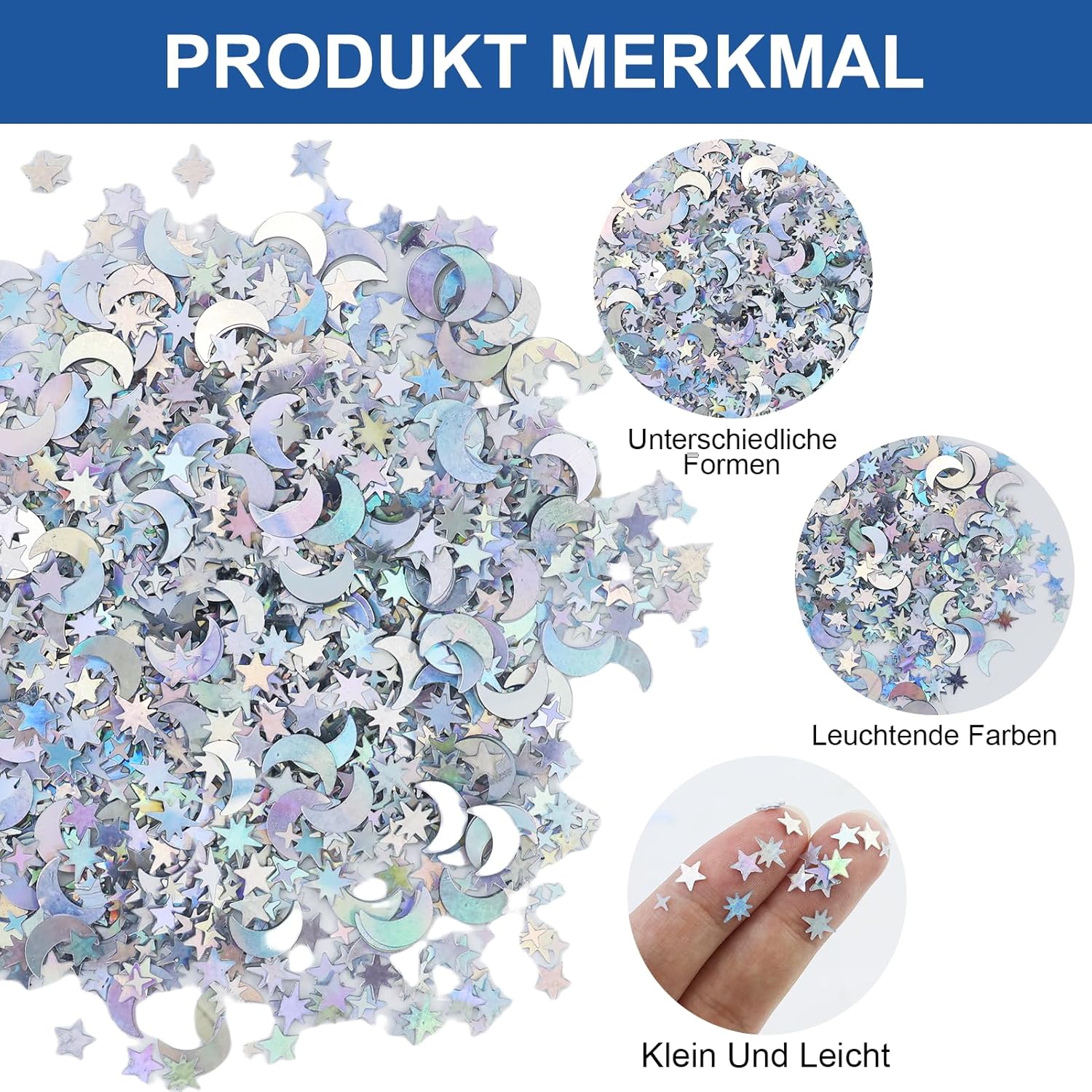 ELENCO CONFEZIONI: La confezione contiene 30g di confetti, circa 4000 pezzi. La quantità è sufficiente per soddisfare le tue esigenze di uso quotidiano e decorazione. MATERIALE DI ALTA QUALITÀ: i nostri prodotti sono realizzati in materiale PVC di alta qualità. Ha una superficie liscia, leggera e può essere utilizzata ripetutamente. DESIGN ECCELLENTE: I nostri coriandoli adottano diversi design a forma di stella e luna, sono colorati e possono brillare sotto la luce. APPLICAZIONE VERSATILE: puoi usarlo per lavori di artigianato, scrapbooking, scatole regalo e anche per compleanni, feste, matrimoni, ecc. FACILE DA TRASPORTARE: è leggero e il trasporto diventerà molto semplice. Puoi usare una piccola borsa per portarlo sul corpo e usarlo quando necessario.