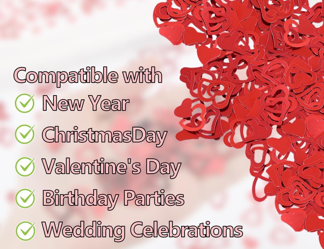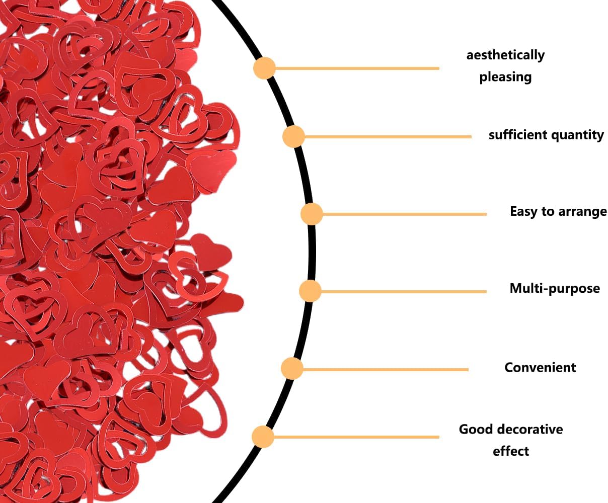 [Set di coriandoli]: questo set contiene circa 15 grammi di coriandoli rossi con una dimensione di 13 mm. La quantità di confetti è moderata, quindi puoi utilizzarli in piccole feste, celebrazioni o altre occasioni per creare un'atmosfera speciale. [Design a forma di cuore]: il design a forma di cuore aggiunge romanticismo e unicità alla celebrazione. Ogni coriandolo a forma di cuore ha un taglio fine e contorni chiari, mostrando una lavorazione meticolosa e dettagli squisiti. [Materiali di alta qualità]: realizzati con materiali di alta qualità per garantirne qualità e durata. Sono realizzati con cura con consistenza e lucentezza eccellenti e non sono facili da deformare o rompere. Ciò significa che puoi conservare e utilizzare questi coriandoli per lungo tempo, donando bellezza duratura a molteplici celebrazioni. [Facile da usare]: puoi cospargere i coriandoli direttamente sul tavolo, sulla confezione delle decorazioni per la festa, oppure metterli in palloncini o spargerli nel luogo della festa, creando facilmente un effetto di celebrazione romantico. Non sono necessarie operazioni complicate o preparativi aggiuntivi per decorare rapidamente la tua festa. [Usi multipli]: che si tratti di San Valentino, matrimoni, feste di compleanno o altre occasioni romantiche, questi coriandoli possono aggiungere un'atmosfera romantica e felice alla tua celebrazione. Puoi abbinarli e utilizzarli in modo creativo secondo necessità per creare uno stile di celebrazione unico. A causa del lungo tempo di trasporto della merce, ti preghiamo di contattarci in tempo se la merce è danneggiata.