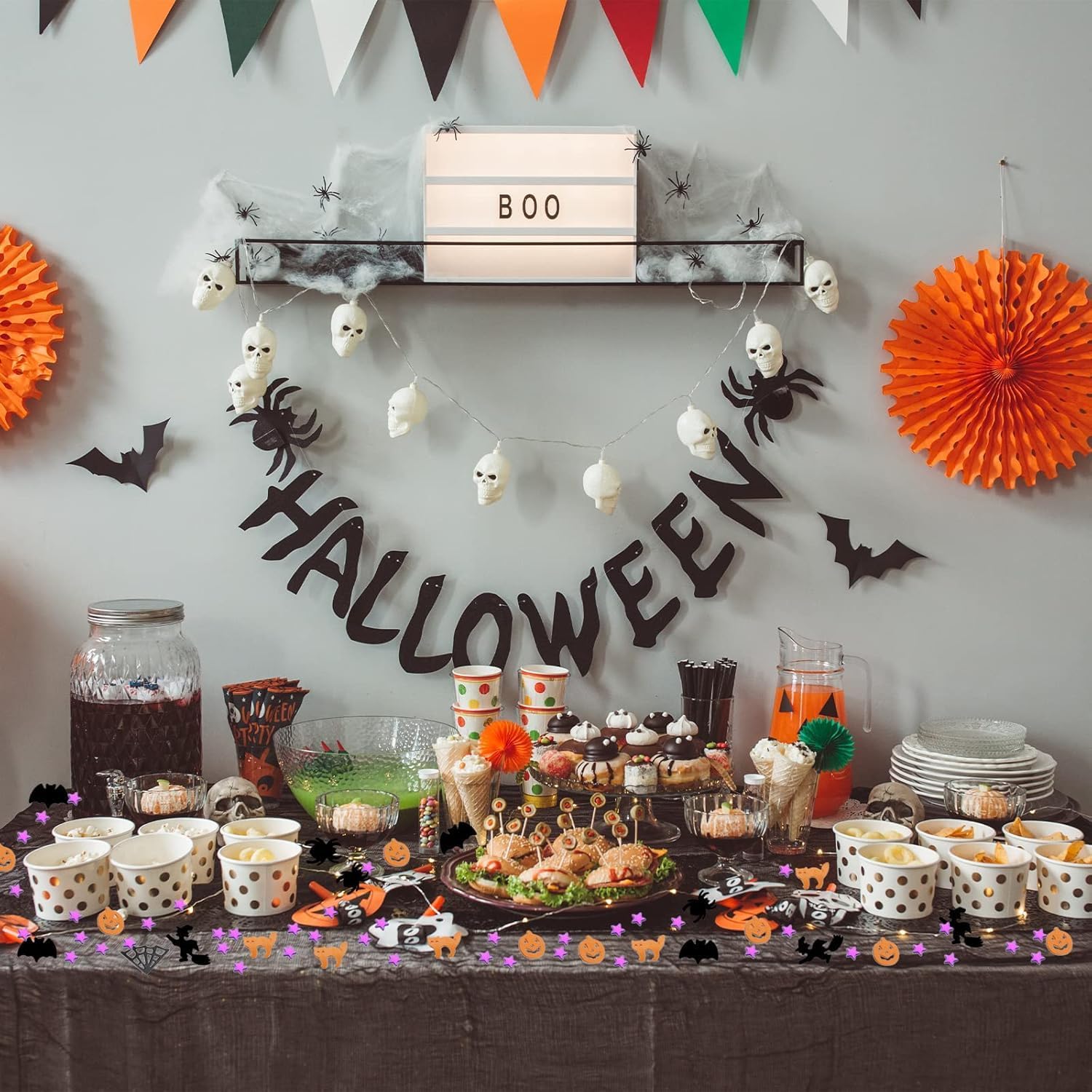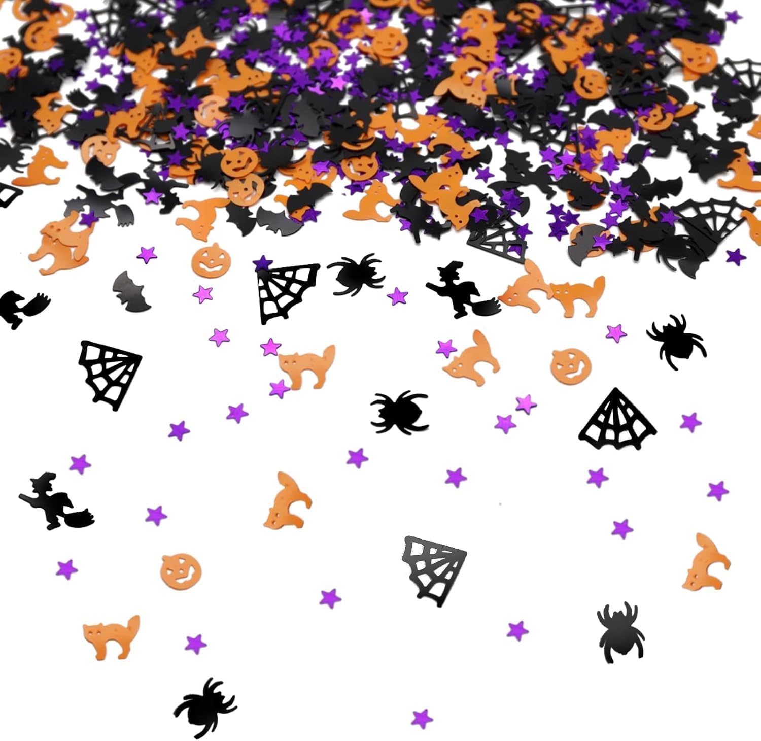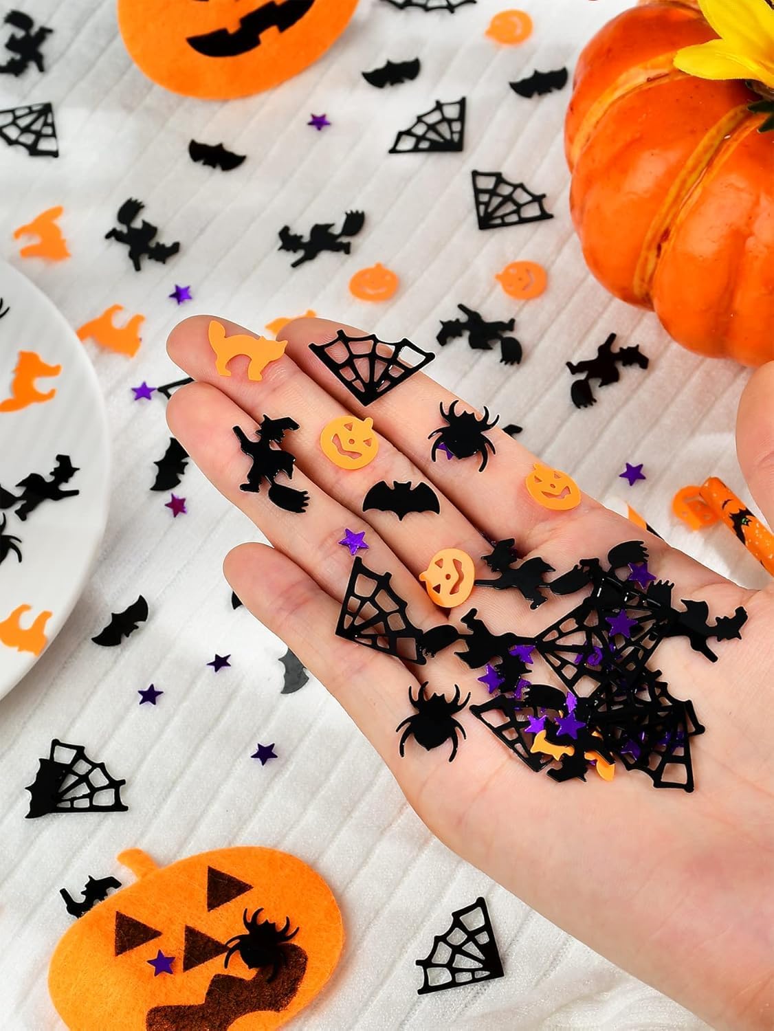 Informazioni sulla confezione: coriandoli di Halloween da 30 g/confezione, ca. 1600 pezzi in totale, i coriandoli di Halloween sono paillettes fronte-retro, ottimi accessori per feste. Design di elementi festivi: zucche, ragni, streghe, ragnatele, stelle, scheletri, pipistrelli sono perfetti per le decorazioni della tavola di Halloween. Dolcetto o scherzetto: spargi le caramelle di Halloween sul tavolo, lanciale in aria per le foto, cospargile sul pavimento. Può essere utilizzato anche per scrapbooking e artigianato. Riempi scatole regalo/bottiglie trasparenti. Biglietto d'invito decorativo, biglietto di Halloween. Crea una forte atmosfera di decorazione di Halloween. Riutilizzabili: questi coriandoli sono realizzati con pellicola in rilievo per evidenziare meglio i dettagli del design, mantenendo la propria forma. Più spessi e pesanti dei coriandoli di carta velina, impermeabili e riutilizzabili. Colori: arancione, nero, bianco, viola e arancione, perfetti per decorare la tavola della festa di Halloween. Abbinali ad altre decorazioni di Halloween come palloncini, striscioni e altro ancora.