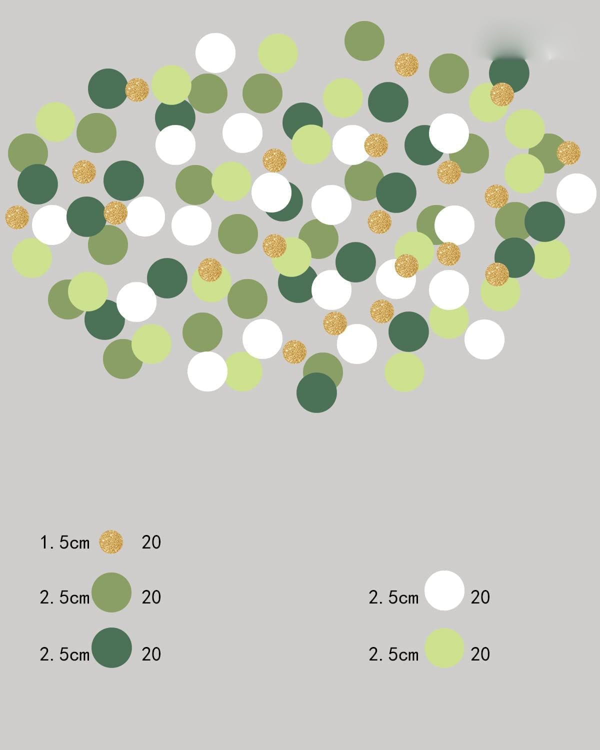 I coriandoli sono realizzati con cura e attenzione a mano. Materiale: realizzato con carta design di alta qualità. Dimensioni: cerchio piccolo 1,5 cm, quantità 20 pezzi. Cerchio grande 2,5 cm, quantità 80 pz. Porta la tua tavola da festa al livello successivo! Spargi i nostri coriandoli in oro verde di alta qualità al tuo prossimo evento e dai ai tuoi ospiti i dettagli che meritano. Disposizione perfetta del tavolo per il tuo baby shower. Può anche essere utilizzato come abbellimento per i tuoi progetti di artigianato nel verde, creazione di biglietti, inclusa la prenotazione di rottami. Ci saranno tantissime decorazioni, inviti e persino album! Abbiamo varie decorazioni per ghirlande di coriandoli disponibili per il baby shower
