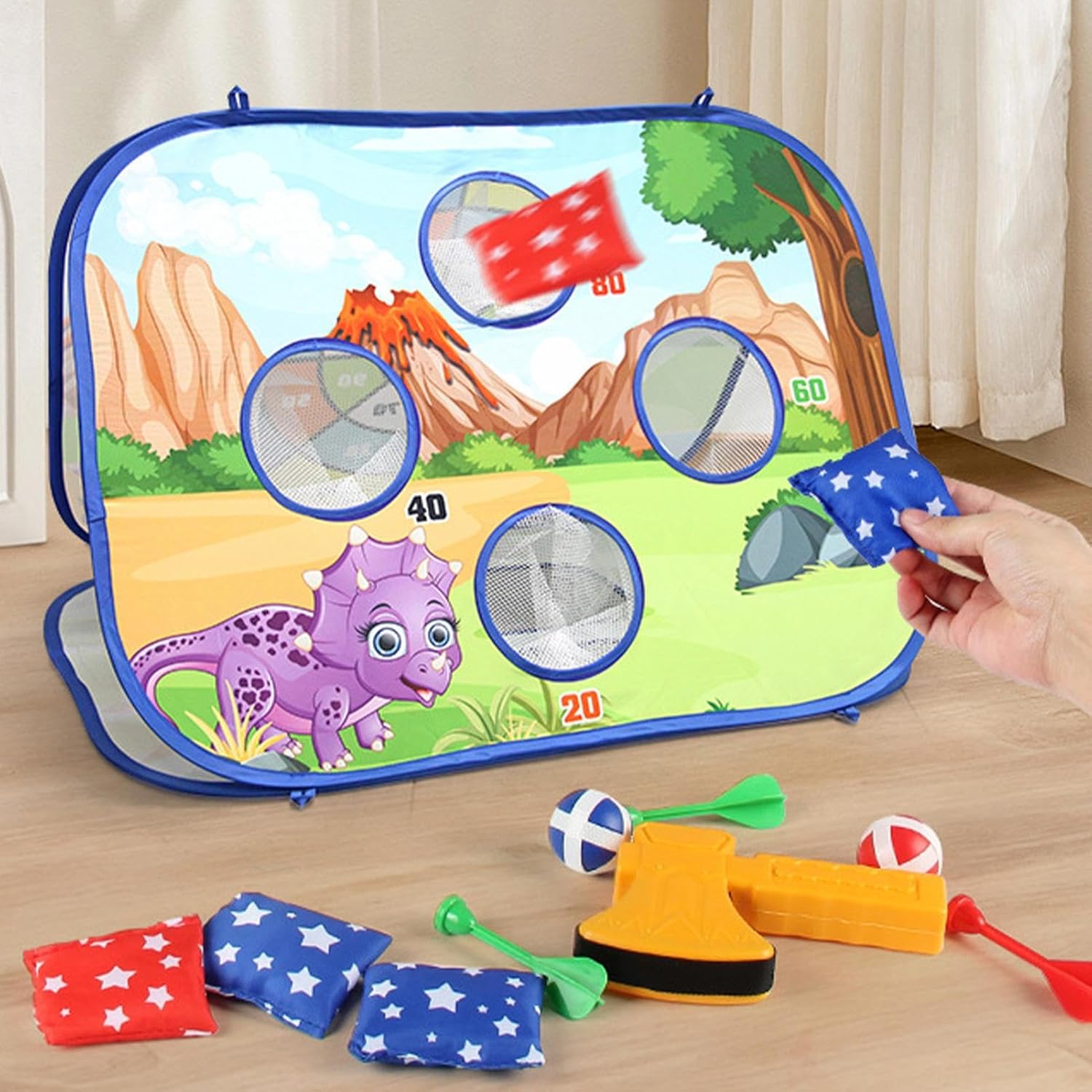 This foldable cornhole game set is designed specifically for young kids, encouraging active play and hand-eye coordination through fun bean bag tossing indoors or outdoors Includes a lightweight and portable cornhole board with colorful targets, making it easy to set up in the living room, backyard, playroom, or even at a birthday party or picnic Made from kid-safe and durable materials, this interactive toss game is suitable for ages 3–8, offering hours of screen- entertainment for both boys and girls Encourages social play and cooperation, making it a great team activity for siblings, classmates, or family game nights, improving , balance, and motor skills The easy fold-and-store design allows for hassle- storage and travel, perfect for taking the fun on road trips, vacations, or school events for nonstop action and smiles