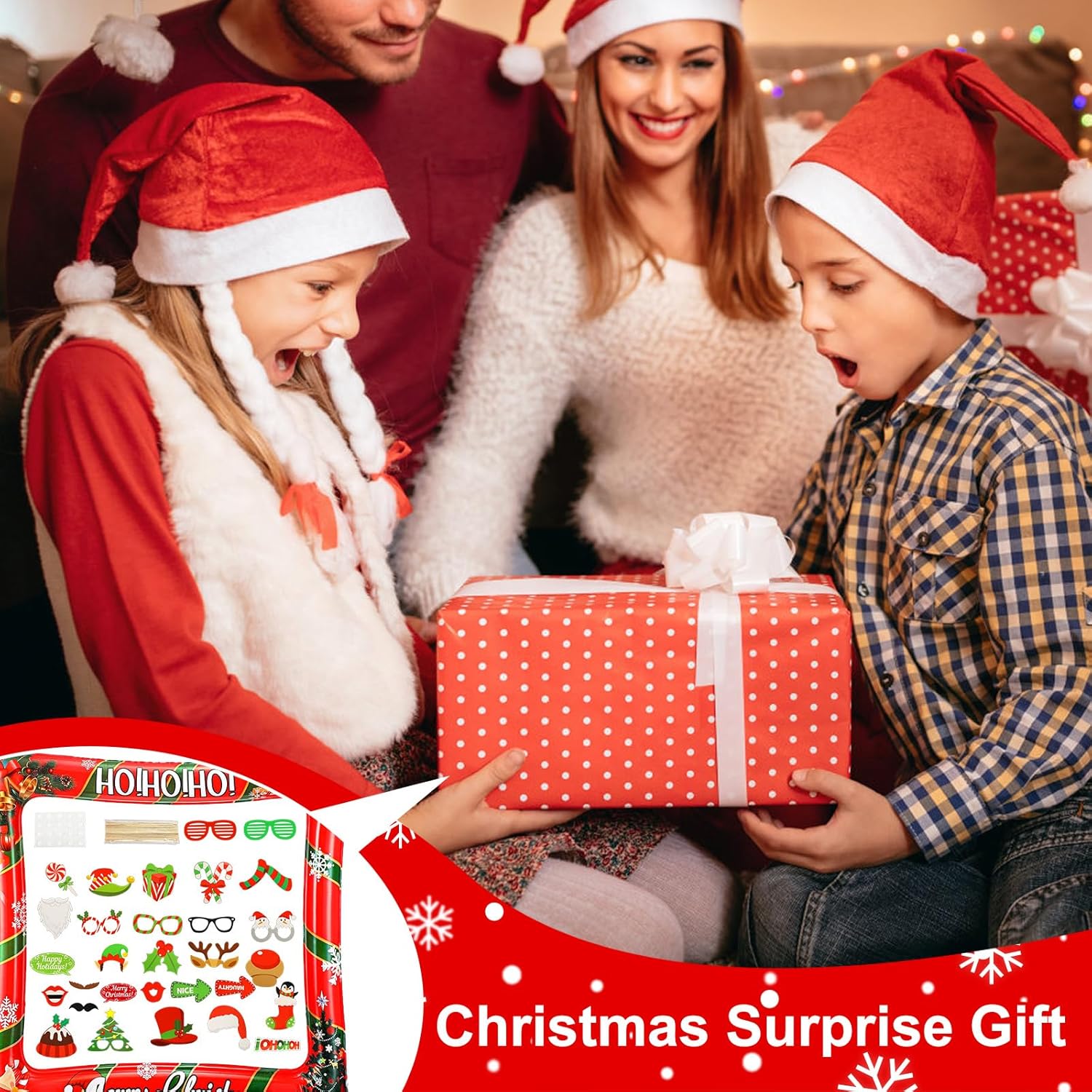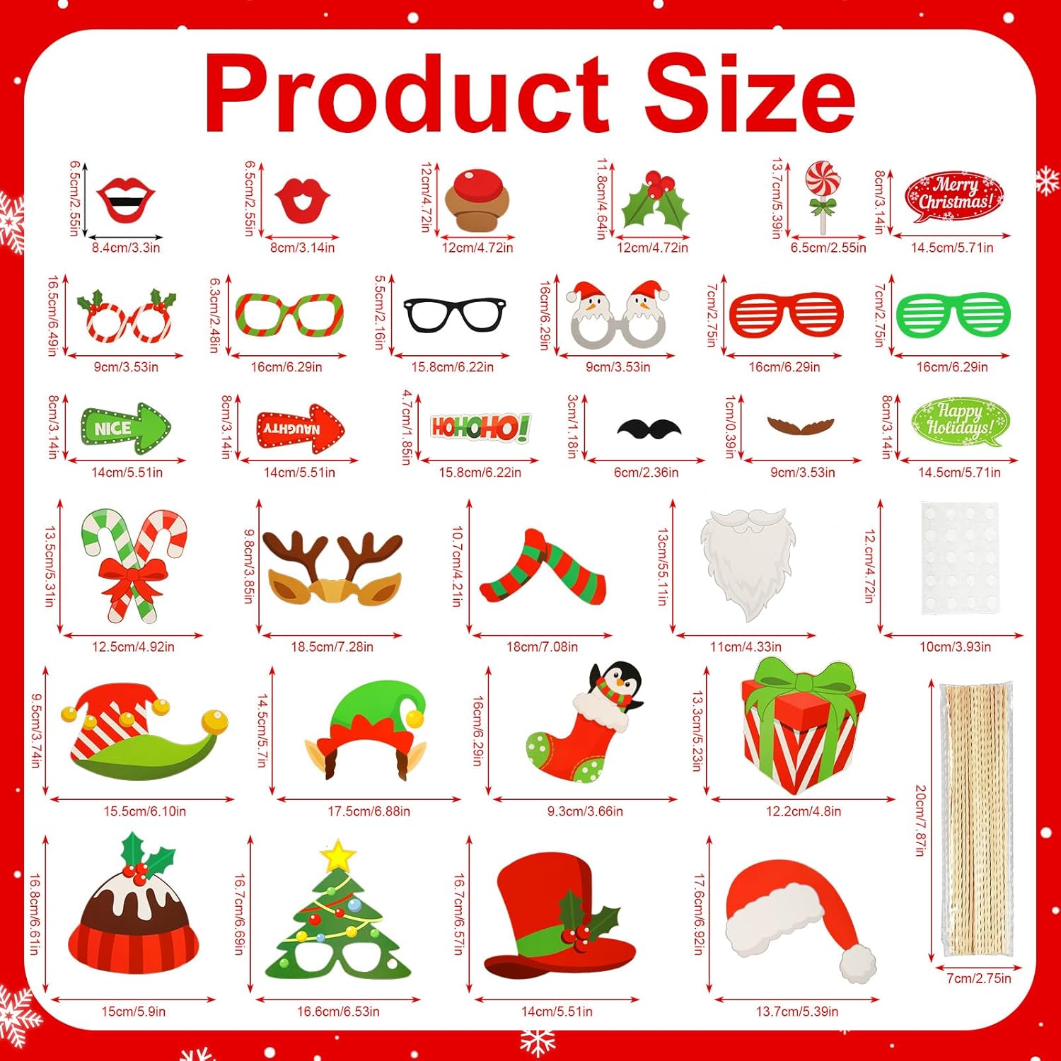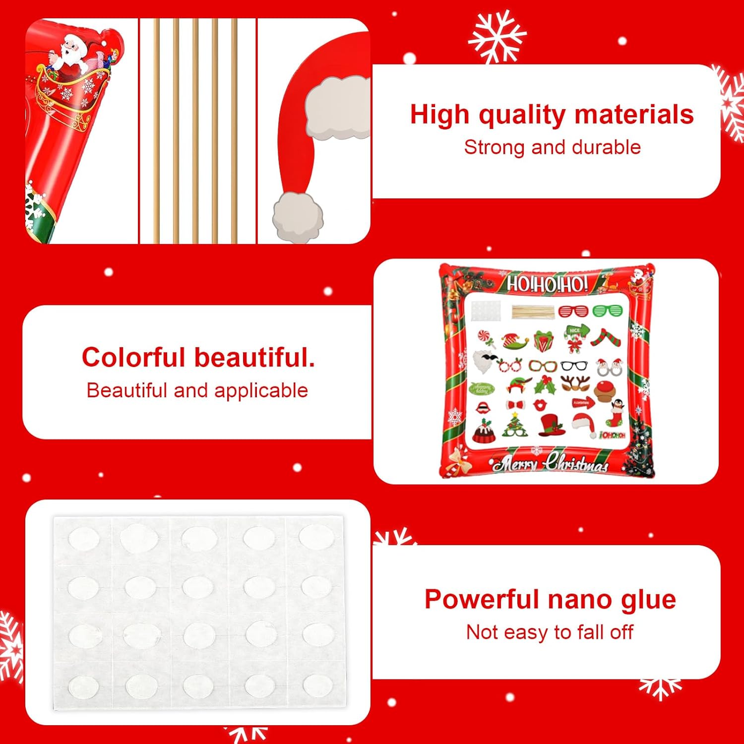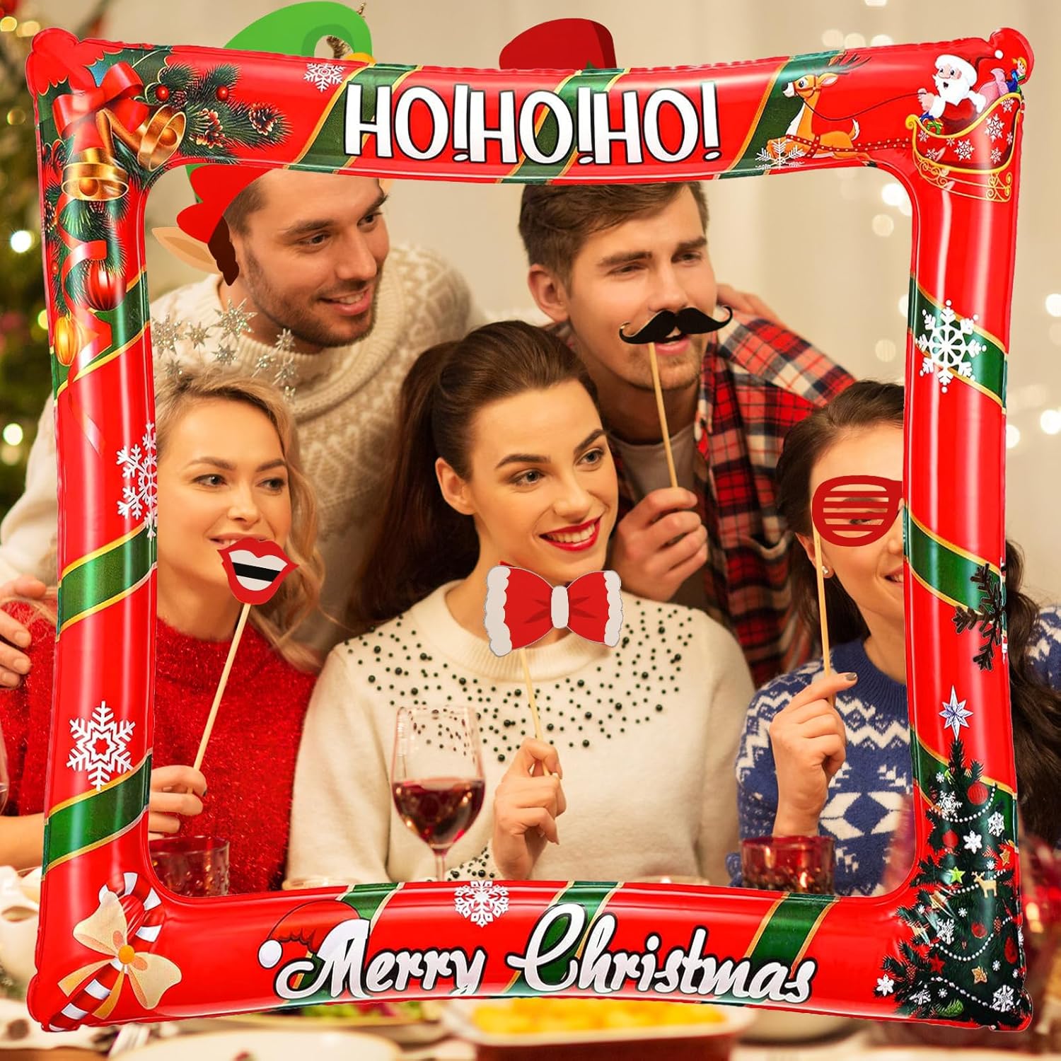 ✨【Cornice Portafoto Gonfiabile Natalizia di Alta Qualità】Il set per feste fotografiche è realizzato in PVC di alta qualità, robusto, leggero, inodore e colorato. È sicuro da usare e facile da tenere in mano per i bambini. Gli accessori per foto natalizie sono realizzati in cartone e bastoncini di bambù di alta qualità, atossici, durevoli e resistenti agli strappi. Questi Puntelli di Photo per Feste di Natale sono stampati professionalmente con colori vivaci che non sbiadiscono facilmente. ✨【Design Accattivanti】Questo Fotografica Puntello per Feste di Natale presenta una varietà di splendidi design e stili per soddisfare tutte le esigenze delle tue feste, tra cui cappelli di Babbo Natale, corna di renna, copricapi, occhiali, labbra rosse, baffi, scatole regalo, lecca-lecca e altri oggetti di scena a tema per cabine fotografiche. La classica combinazione di colori rosso, bianco e verde del set di Decorazione per Photo Booth di Natale è accattivante e si abbina perfettamente al tema natalizio. ✨【Facile da Montare】È possibile utilizzare una pompa ad aria portatile per gonfiare la cornice e sigillarla, quindi posizionarla nella posizione corretta e posare per la foto. Utilizzando gli adesivi biadesivi trasparenti inclusi e i bastoncini di legno lisci, è possibile assemblare rapidamente e facilmente gli oggetti di scena per rendere le foto più suggestive. ✨【Set di Accessori per Photo Booth per Feste di Natale】Riceverai una cornice selfie che misura 75 x 65 x 6,3 cm/29,52 x 25,59 x 2,48" e 32 oaccessori per foto natalizi, sufficienti per soddisfare le tue esigenze decorative. Il set di cornice gonfiabile per selfie è uno sfondo ideale per foto e selfie con la famiglia e gli amici, aggiungendo un'atmosfera divertente alle tue feste e festival. ✨【Adatto a Varie Occasioni】Il bellissimo set di cornice per selfie può aiutarti a scattare foto uniche e catturare i tuoi momenti felici con la tua amata famiglia e i tuoi amici. È adatto per occasioni come feste di Natale, riunioni di famiglia natalizie, feste per bambini e festeggiamenti di Capodanno. (Quando non in uso, si prega di sgonfiare la cornice per un migliore utilizzo la prossima volta)