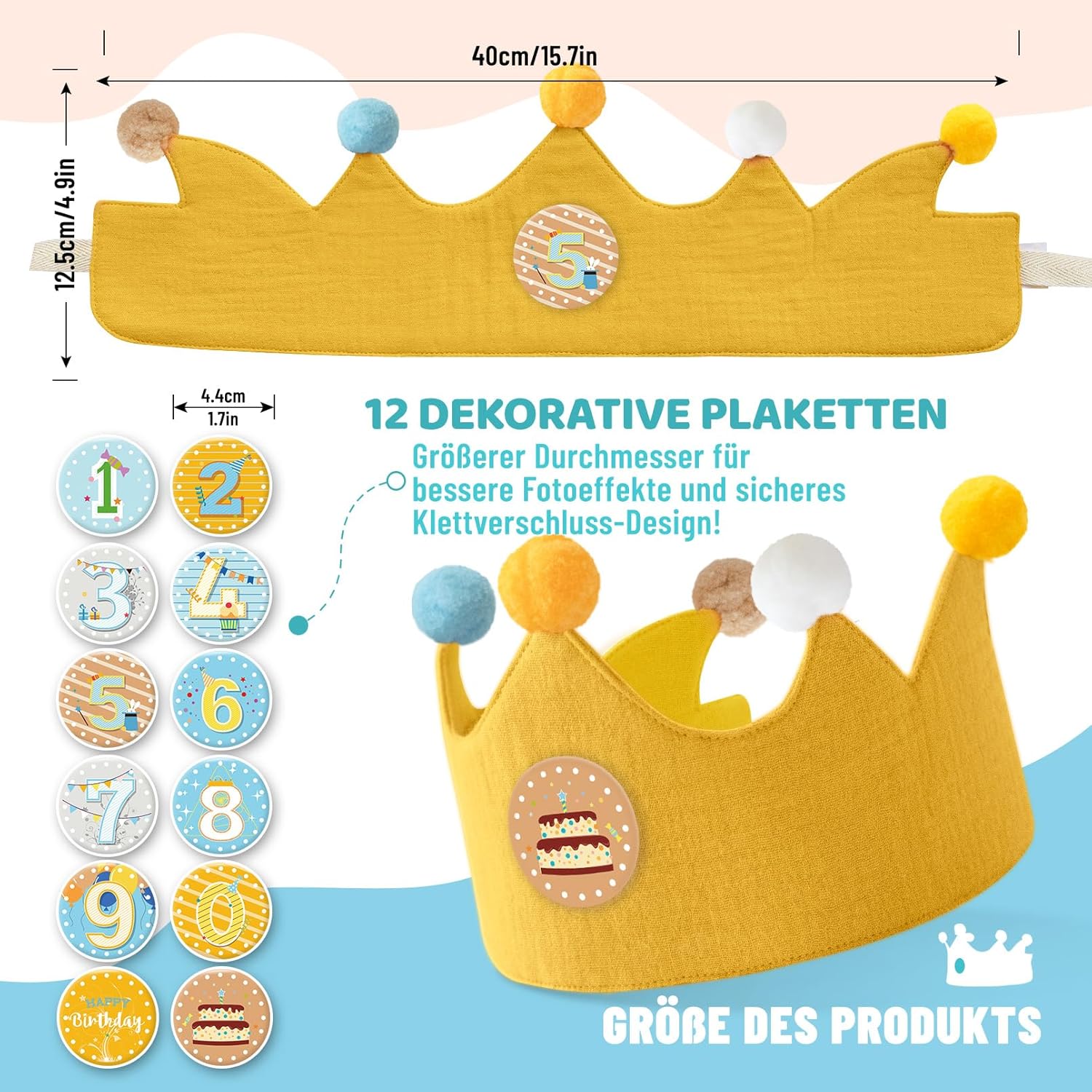 Corona di compleanno, corona di compleanno per bambini con chiusura in velcro, distintivo con numero 0-9, adatta per feste di compleanno, corona di compleanno per ragazze e ragazzi