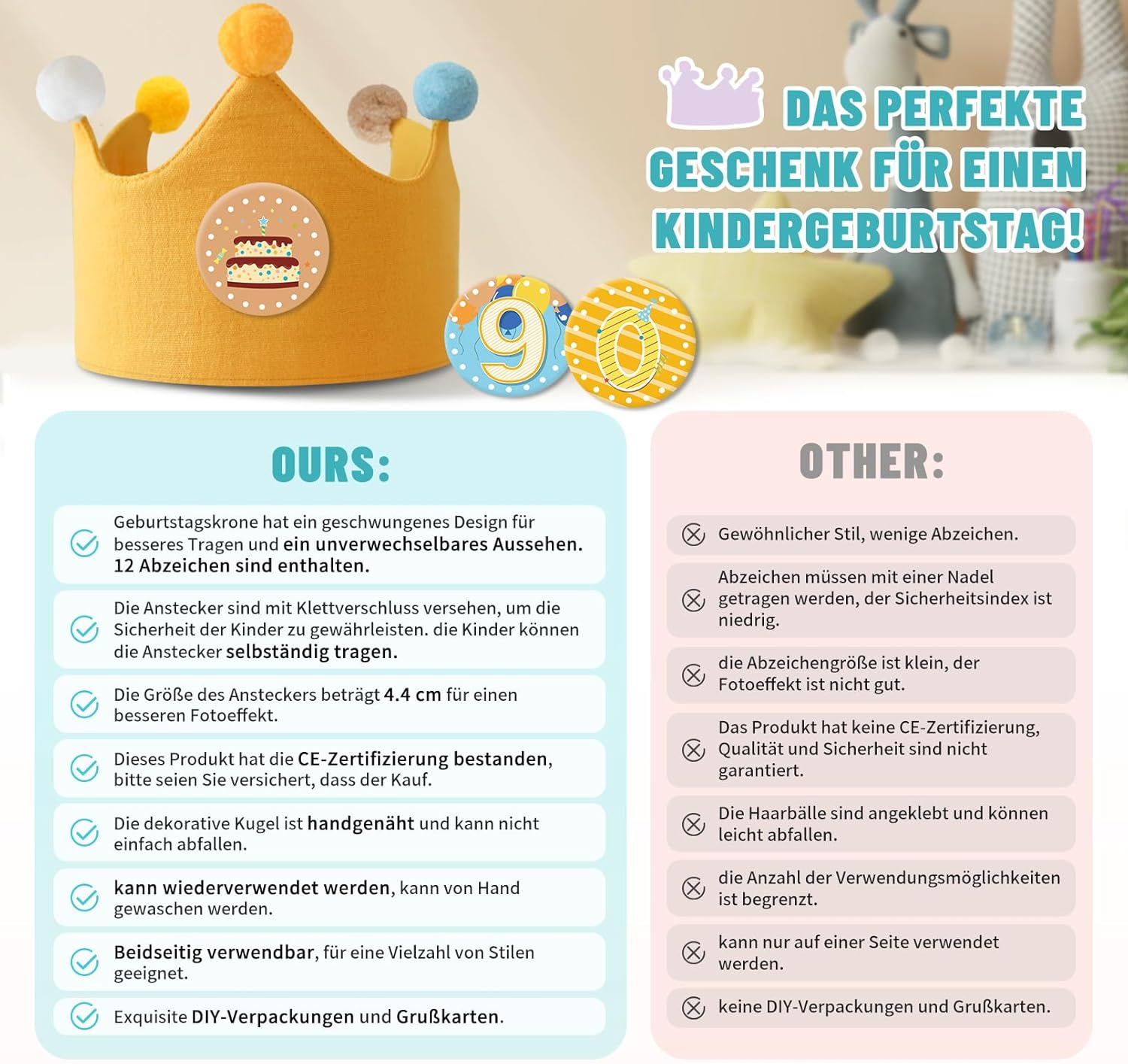 Super süß und Qualität echt klasse. Lässt sich einfach der Kopfgröße anpassen. Meiner Tochter hat die Krone sehr gefallen und kann sich noch bis zum 10 Geburtstag erfreuen.