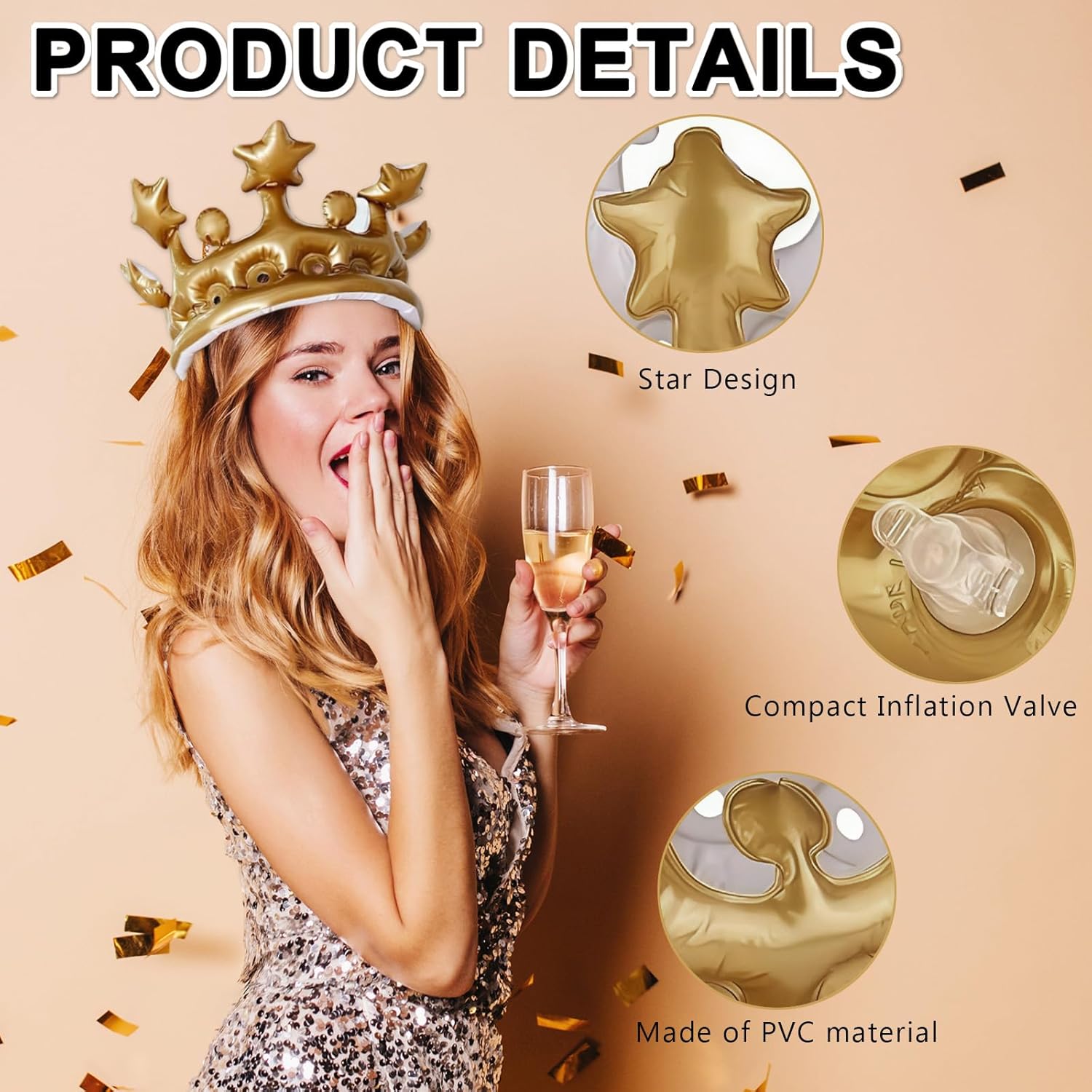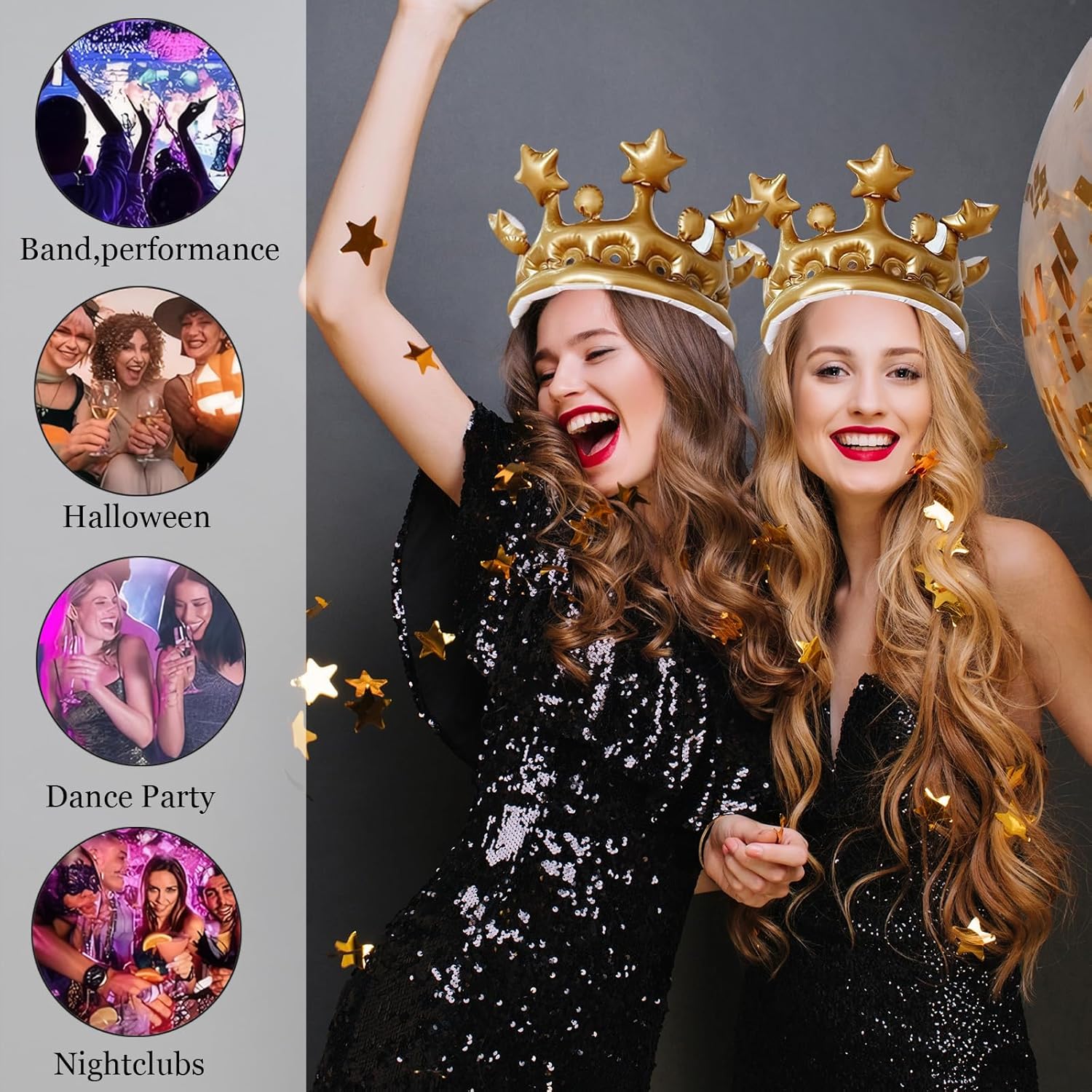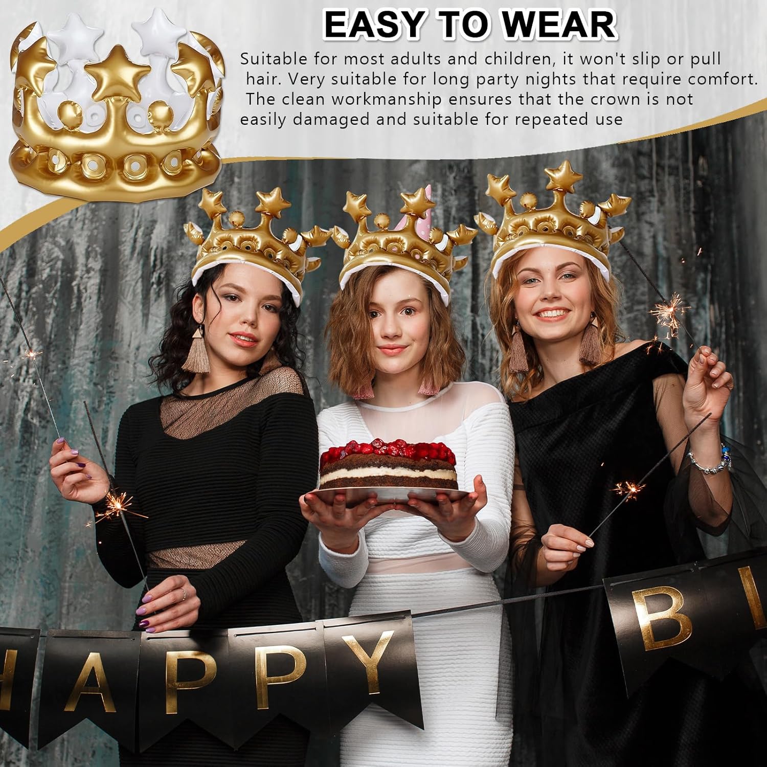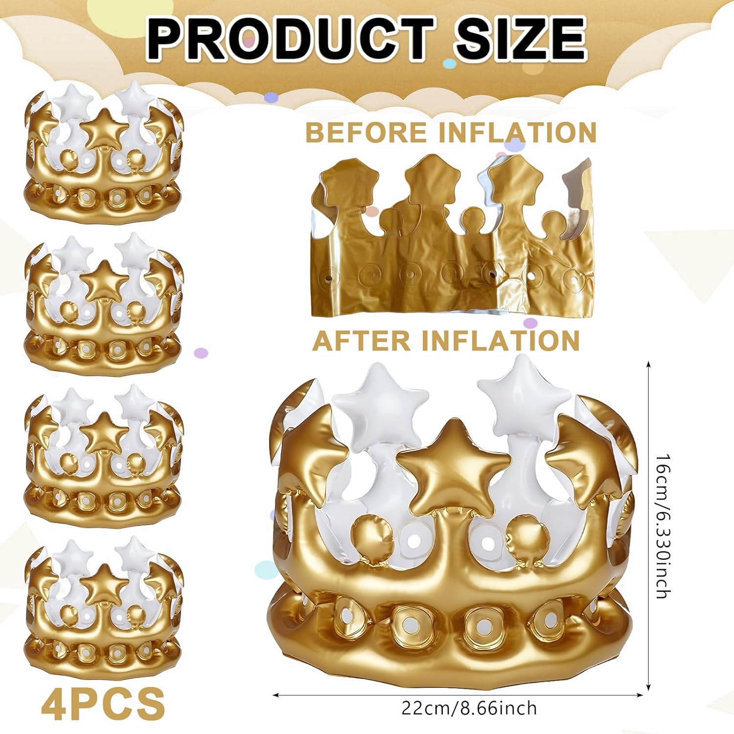 Queste corone gonfiabili da festa sono realizzate in PVC di alta qualità, garantendo una durata eccezionale e una resistenza agli strappi, pur rimanendo incredibilmente leggere e facili da indossare. La plastica morbida e flessibile si adatta perfettamente alla forma della testa senza provocare fastidi, offrendo un comfort ideale anche per un uso prolungato durante eventi come feste di compleanno, carnevale o spettacoli a tema. Ogni corona è progettata per essere gonfiata in pochi secondi senza l’uso di pompe complicate, rimanendo ben sigillata per tutta la durata dell’evento. Il diametro di 22 cm e l’altezza di 16 cm la rendono perfetta per la maggior parte delle teste di adulti e bambini, senza stringere o tirare i capelli. Un accessorio ideale per sentirsi protagonisti in ogni festa. Queste corone gonfiabili decorative sono ideali per una vasta gamma di eventi: compleanni, Halloween, feste scolastiche, addii al nubilato, giochi di ruolo o semplici momenti divertenti in famiglia. Il loro design brillante e appariscente aggiunge un tocco regale e spiritoso a qualsiasi outfit, rendendole l’accessorio perfetto per foto memorabili. Il pacchetto include 4 corone gonfiabili, permettendo a più persone di partecipare al divertimento. Che si tratti di una festa per bambini o di un evento tematico per adulti, ogni membro del gruppo potrà indossare la propria corona, favorendo l’interazione sociale e creando un’atmosfera allegra e inclusiva. Un’opzione economica e festosa per animare ogni tipo di celebrazione. Oltre a essere un accessorio per feste, queste corone gonfiabili rappresentano un gioco creativo per rafforzare i legami familiari. I genitori possono usarle per giocare insieme ai bambini, stimolando l’immaginazione e creando momenti preziosi. La forma divertente e la leggerezza del materiale le rendono ideali anche come gadget per animatori o come premio nelle feste.