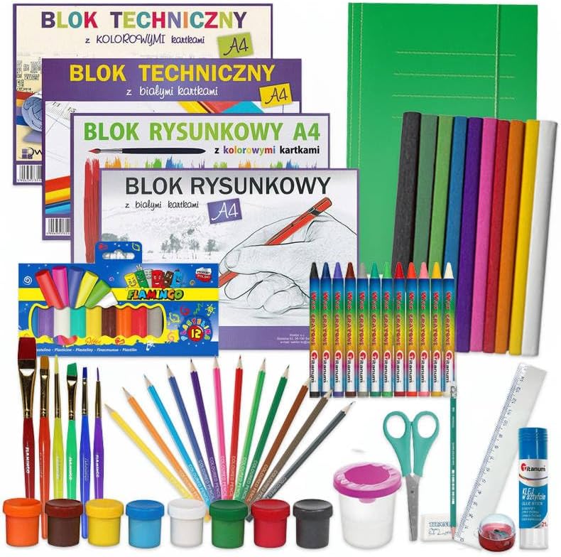 Set XXL da 18 pezzi per la scuola Include 4 blocchi di disegno e tecnici Pastelli a cera, matita, plastilina Set completo di strumenti di pittura Accessori scolastici: forbici, colla, righello