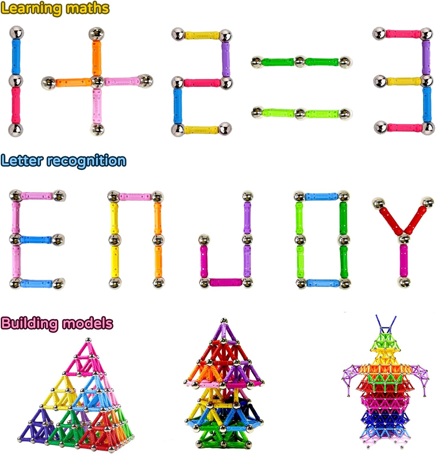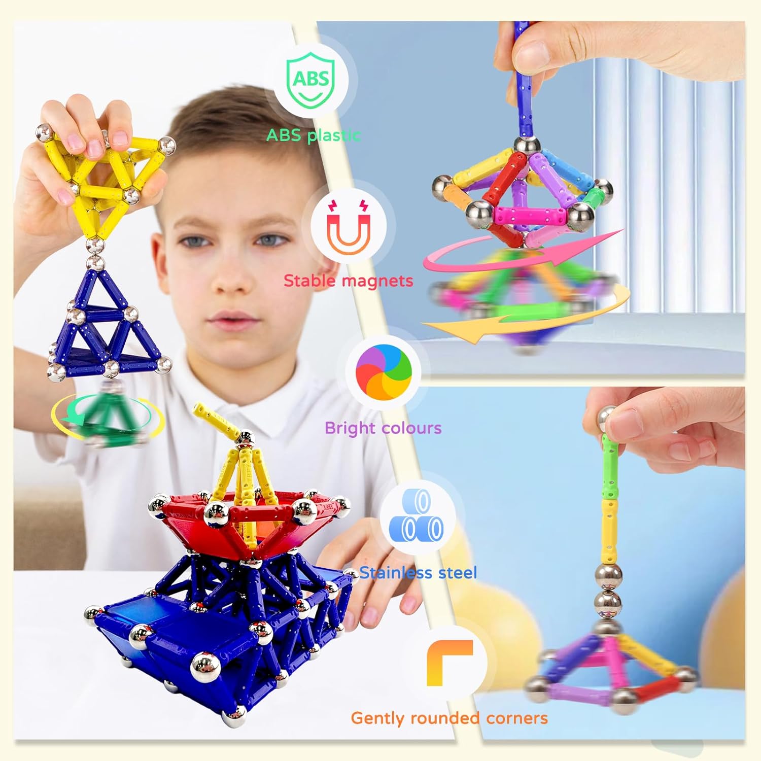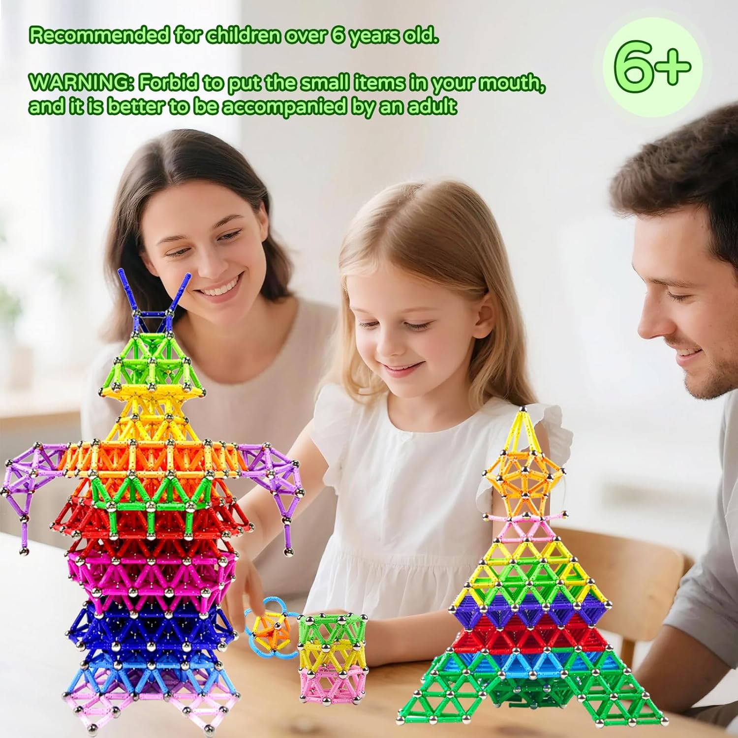 Set di 170 blocchi magnetici: il nostro set di costruzioni magnetiche include 10 colori diversi, 120 aste colorate e 50 perline. Il prodotto è semplice e facile da assemblare e i bambini possono usare la loro immaginazione e creatività per costruire tutti i tipi di forme piatte e modelli 3D. Ragazzi e ragazze di età compresa tra 6, 7, 8, 9 e 10 anni possono godere del piacere di costruire giocattoli. Utilizzare preferibilmente sotto la supervisione di un adulto. Non mettere i piccoli pezzi in bocca! Materiali di alta qualità: questi blocchi magnetici sono realizzati in plastica ABS di alta qualità e sicura, con bei colori che attirano immediatamente l'attenzione dei bambini. La superficie liscia e i bordi arrotondati garantiscono la massima sicurezza durante l'uso da parte dei bambini. La loro struttura solida rende i blocchi resistenti alle cadute e durevoli e impedisce la fuoriuscita di piccoli elementi. I bambini possono così sviluppare il loro universo architettonico a loro piacimento, senza preoccuparsi della loro salute e sicurezza. Giocattoli educativi STEM montessori: I nostri giochi magnetici combinano istruzione e intrattenimento. Promuovono lo sviluppo di abilità importanti nei bambini, come il pensiero logico, il pensiero spaziale, le capacità motorie e la capacità di risolvere i problemi. Allo stesso tempo, stimolano la creatività e l'immaginazione dei bambini attraverso giochi semplici e consentono loro di iniziare la matematica, la tecnologia e le scienze naturali mentre si divertono. Adatto per giocare ovunque e in qualsiasi momento: i nostri giocattoli da costruzione magnetici sono forniti in una scatola rigida, compatta ed elegante, che può essere portato ovunque. Che si tratti di un'attività familiare o come strumento didattico in classe, questo set magnetico è un must per tutti coloro che apprezzano i giocattoli creativi ed educativi. Può anche essere portato al parco, in una colonia di vacanza o anche in viaggio per trascorrere il tempo. È un tesoro perfettamente portatile! Il regalo idea: che si tratti di un compleanno, Natale o di rientro a scuola, il nostro set di giocattoli amorevoli è il regalo perfetto per far brillare gli occhi dei bambini. Adatto a ragazzi e ragazze dai 6 anni in su, offre innumerevoli opportunità di costruzione ed esplorazione, combinando istruzione e intrattenimento.