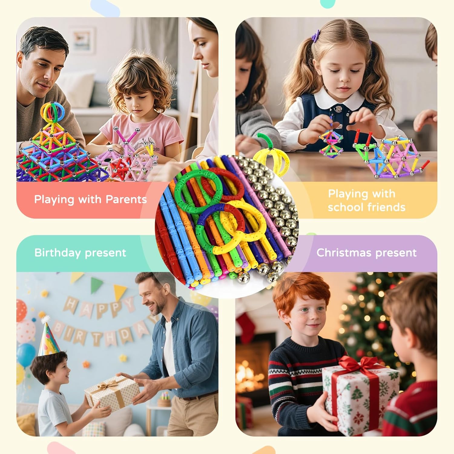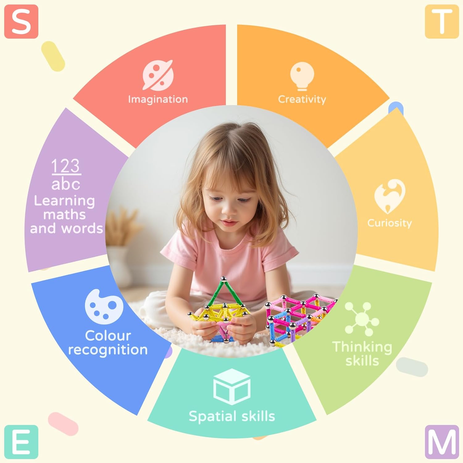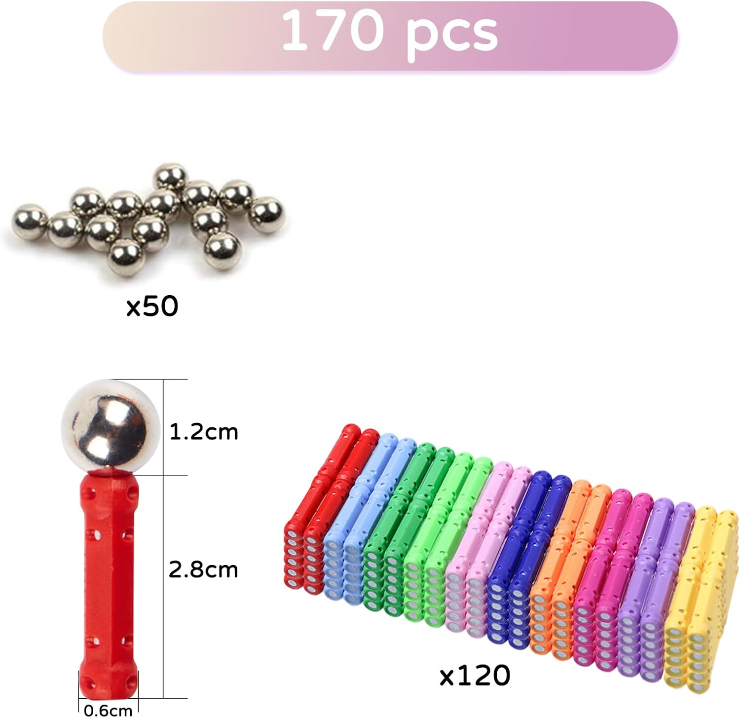Set di 170 blocchi magnetici: il nostro set di costruzioni magnetiche include 10 colori diversi, 120 aste colorate e 50 perline. Il prodotto è semplice e facile da assemblare e i bambini possono usare la loro immaginazione e creatività per costruire tutti i tipi di forme piatte e modelli 3D. Ragazzi e ragazze di età compresa tra 6, 7, 8, 9 e 10 anni possono godere del piacere di costruire giocattoli. Utilizzare preferibilmente sotto la supervisione di un adulto. Non mettere i piccoli pezzi in bocca! Materiali di alta qualità: questi blocchi magnetici sono realizzati in plastica ABS di alta qualità e sicura, con bei colori che attirano immediatamente l'attenzione dei bambini. La superficie liscia e i bordi arrotondati garantiscono la massima sicurezza durante l'uso da parte dei bambini. La loro struttura solida rende i blocchi resistenti alle cadute e durevoli e impedisce la fuoriuscita di piccoli elementi. I bambini possono così sviluppare il loro universo architettonico a loro piacimento, senza preoccuparsi della loro salute e sicurezza. Giocattoli educativi STEM montessori: I nostri giochi magnetici combinano istruzione e intrattenimento. Promuovono lo sviluppo di abilità importanti nei bambini, come il pensiero logico, il pensiero spaziale, le capacità motorie e la capacità di risolvere i problemi. Allo stesso tempo, stimolano la creatività e l'immaginazione dei bambini attraverso giochi semplici e consentono loro di iniziare la matematica, la tecnologia e le scienze naturali mentre si divertono. Adatto per giocare ovunque e in qualsiasi momento: i nostri giocattoli da costruzione magnetici sono forniti in una scatola rigida, compatta ed elegante, che può essere portato ovunque. Che si tratti di un'attività familiare o come strumento didattico in classe, questo set magnetico è un must per tutti coloro che apprezzano i giocattoli creativi ed educativi. Può anche essere portato al parco, in una colonia di vacanza o anche in viaggio per trascorrere il tempo. È un tesoro perfettamente portatile! Il regalo idea: che si tratti di un compleanno, Natale o di rientro a scuola, il nostro set di giocattoli amorevoli è il regalo perfetto per far brillare gli occhi dei bambini. Adatto a ragazzi e ragazze dai 6 anni in su, offre innumerevoli opportunità di costruzione ed esplorazione, combinando istruzione e intrattenimento.