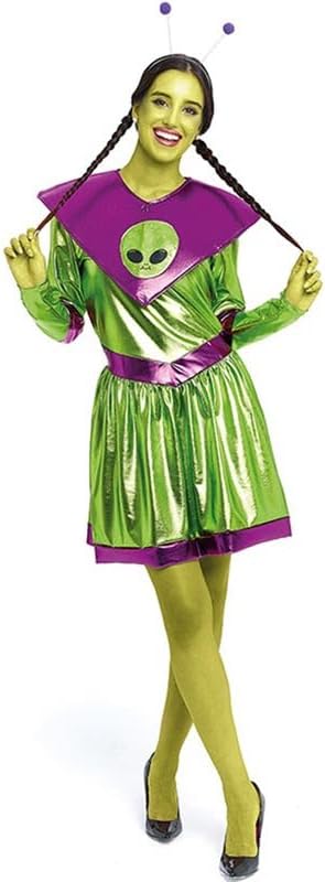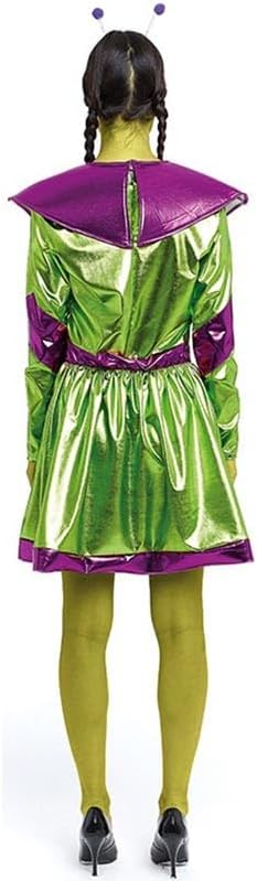 Costume da alieno verde e viola da donna. Include fascia antenne, collo e vestito. Non include pistola, collant o calzature