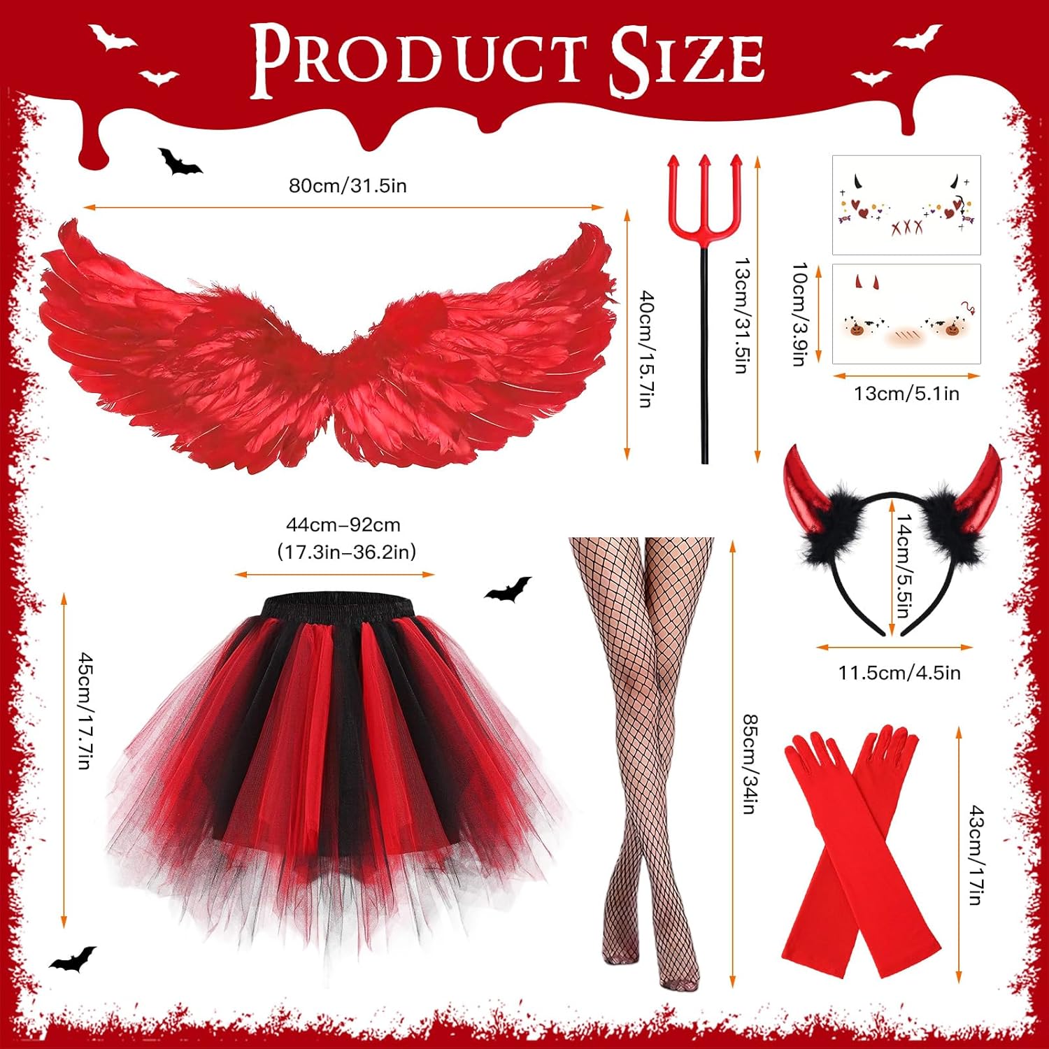Un disfraz muy completo, viene con las alas, diadema, medias, cetro, guantes, falda y han sido tan detallistas que hasta han puesto unas pegatinas para maquillarse. La verdad que está muy bien para Halloween , solo debes añadirle una camiseta.