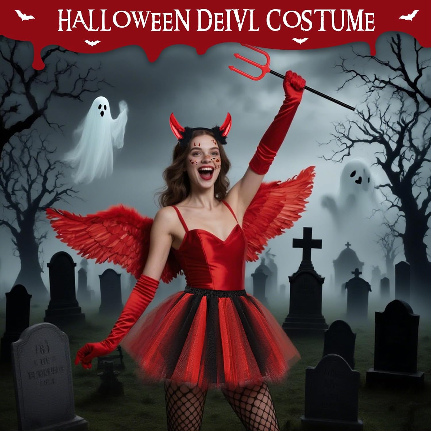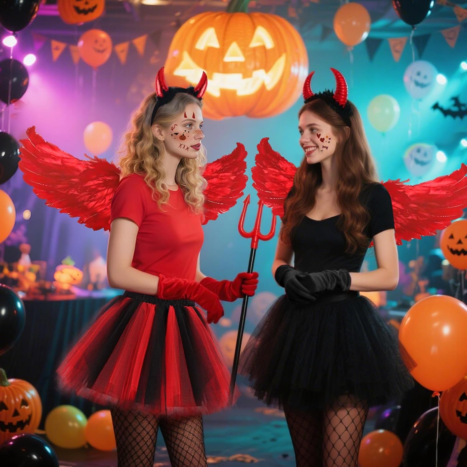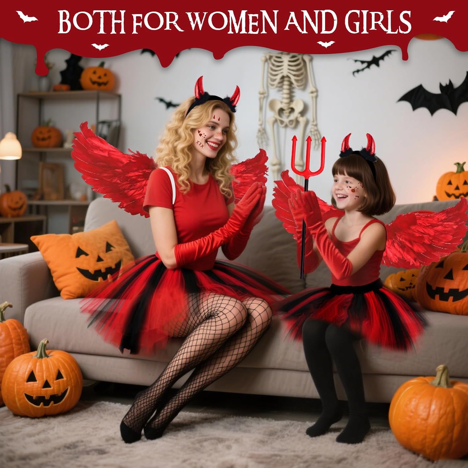 Costume Angelo Halloween Costume Donna con Ali Rosse Corna Forcone Diavolo Guanti Calze a Rete e Gonna Tutù, Ali Angelo Rosse Costume Diavolo per Adulto Bambino Feste di Halloween Carnevale