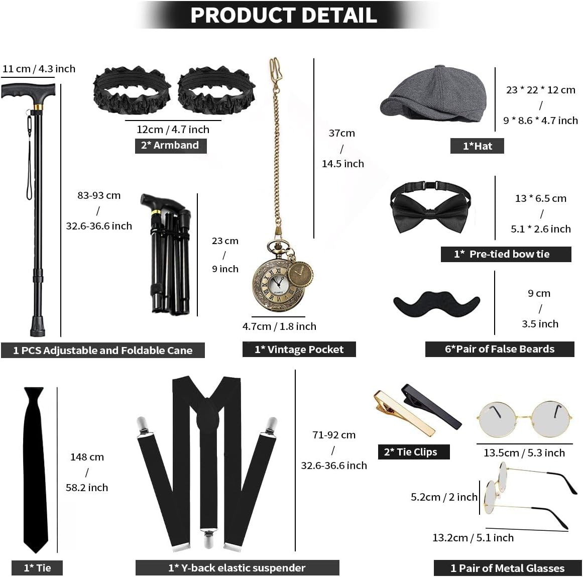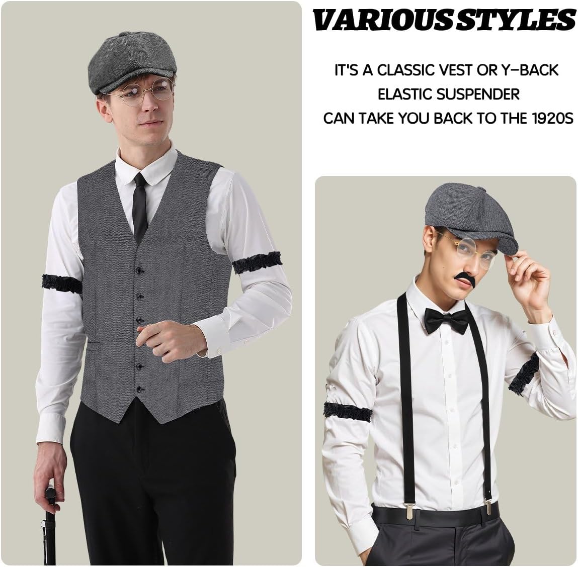 Costume da uomo anni '20 con accessori. Gli accessori anni '20 sono ideali per una vasta gamma di feste a tema con cui si possono affrontare. Che si tratti di giochi di ruolo, Halloween, Carnevale, attirerà l'attenzione su di sé. Costume vintage anni '20 che rende voi e il vostro partner un punto focale in una festa.