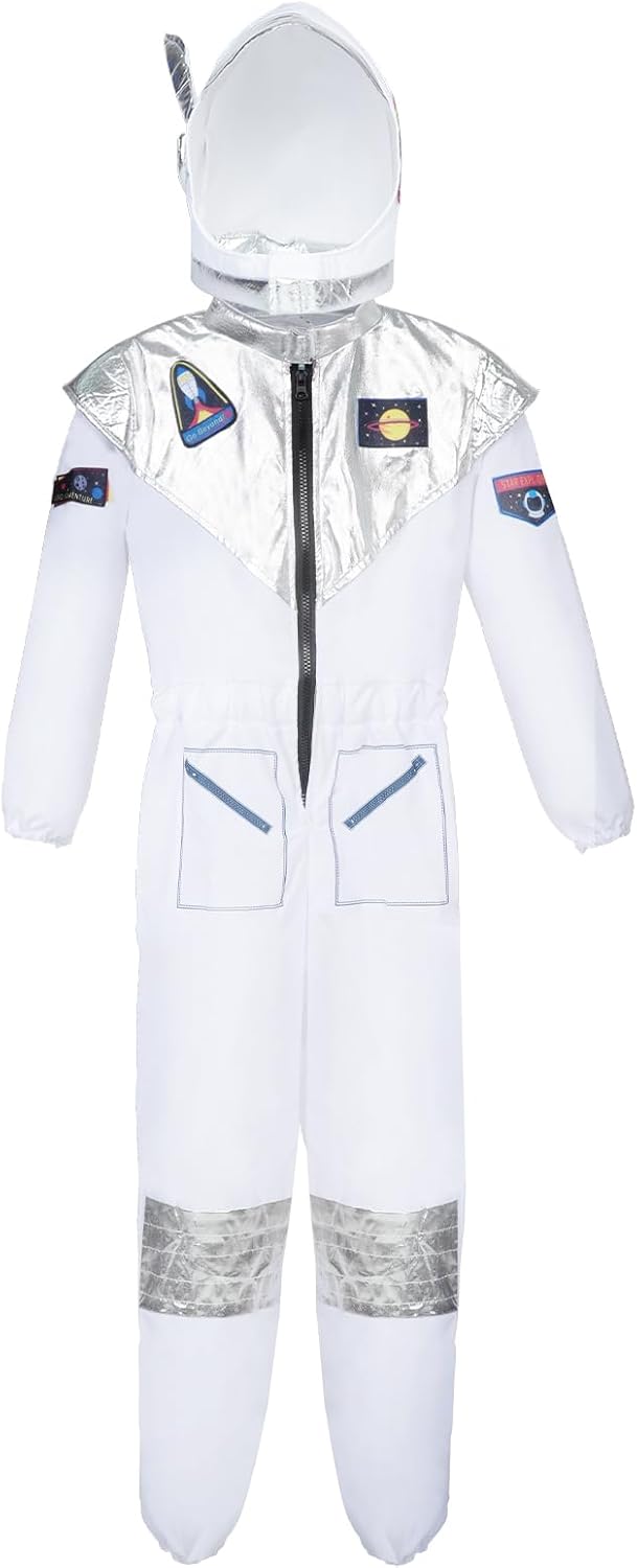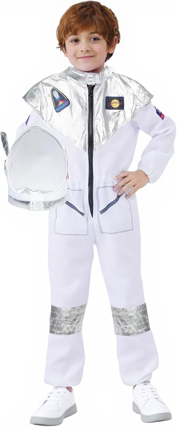 【Set Costume da Astronauta】Il costume da astronauta presenta un colletto e un petto argentati lucidi e include un casco spaziale e una tuta da astronauta. Questo è un meraviglioso costume da gioco di ruolo per il tuo piccolo, pronto per portarti in una missione spaziale sulla Luna! 【Design unico ed elegante】Questa tuta spaziale per bambini è facile da indossare, con una chiusura a cerniera sul davanti e un elastico in vita per proteggere dall'aria fredda. I polsini e le gambe dei pantaloni sono elasticizzati. Realizzata in tessuto di alta qualità, è leggera, traspirante, morbida, confortevole e consente una vasta gamma di movimenti. 【Ben fatta】Il casco della tuta spaziale è realizzato in materiale morbido per un maggiore comfort, rendendolo facile da indossare e togliere per il tuo bambino. Crea un'esperienza di esplorazione spaziale immersiva per i bambini. 【Regalo perfetto per bambini】Sorprendi il tuo bambino con questo costume da astronauta. È un fantastico regalo di compleanno che ispirerà il suo amore per lo spazio e accenderà il suo sogno di diventare un astronauta. 【Occasioni applicabili】Questo costume da astronauta è adatto per la giornata della carriera scolastica, compleanni, feste di compleanno spaziali, visite al museo spaziale, Halloween, carnevali, feste in maschera, Natale, giochi di ruolo scolastici, cosplay, fotografia natalizia, spettacoli teatrali e abbigliamento quotidiano.