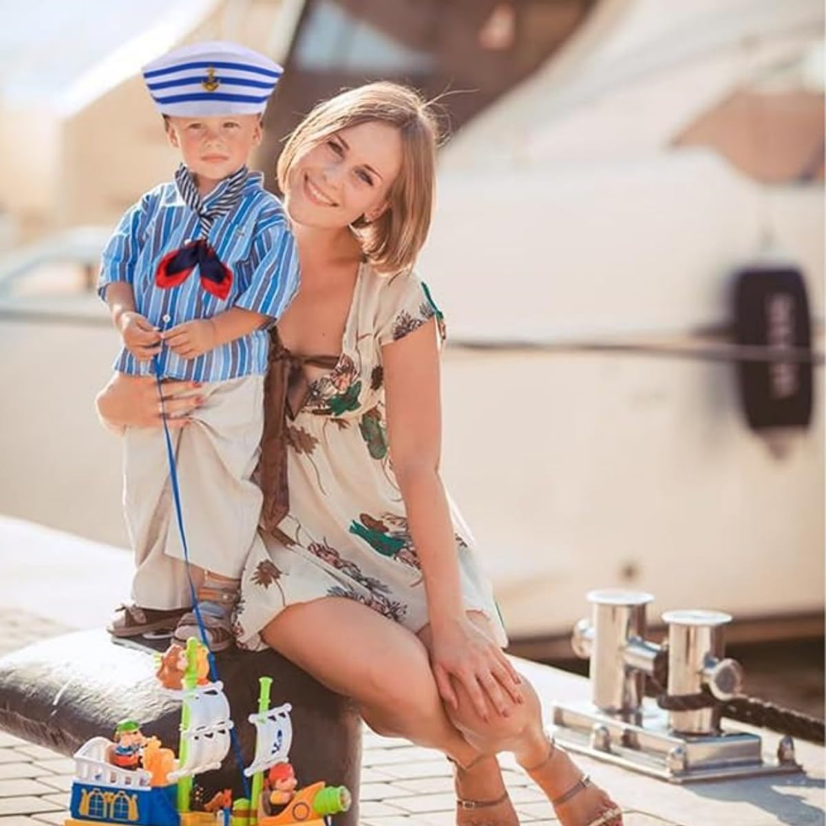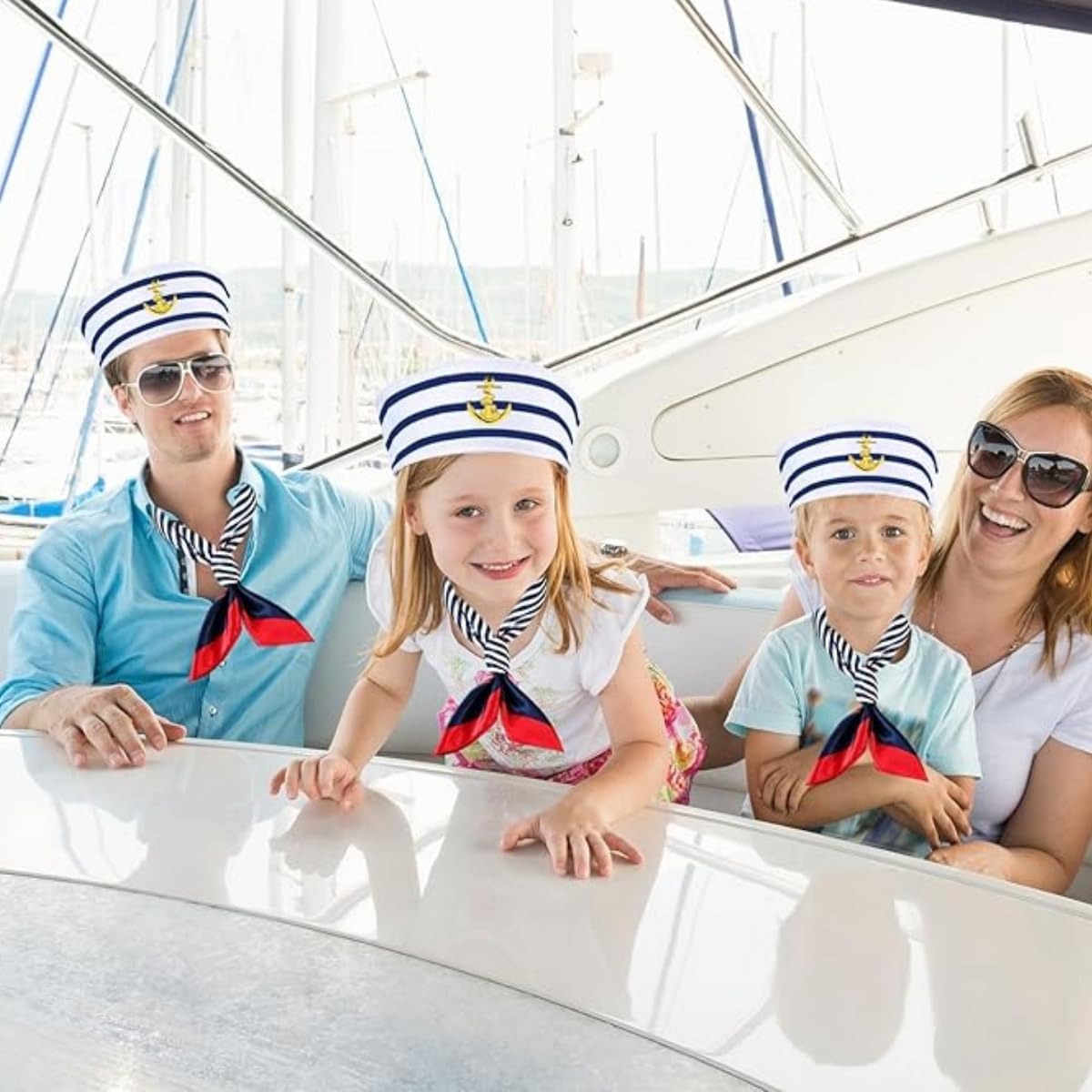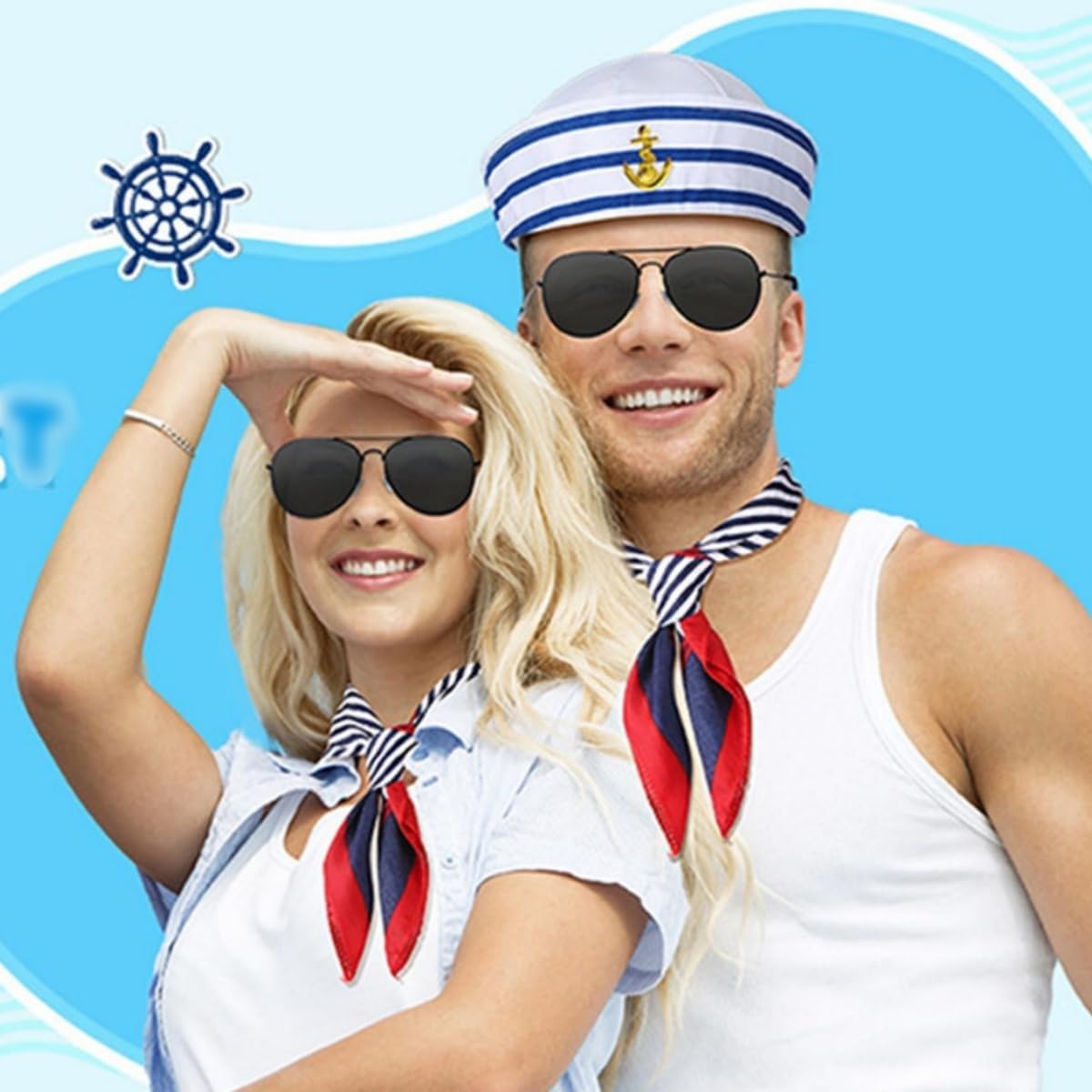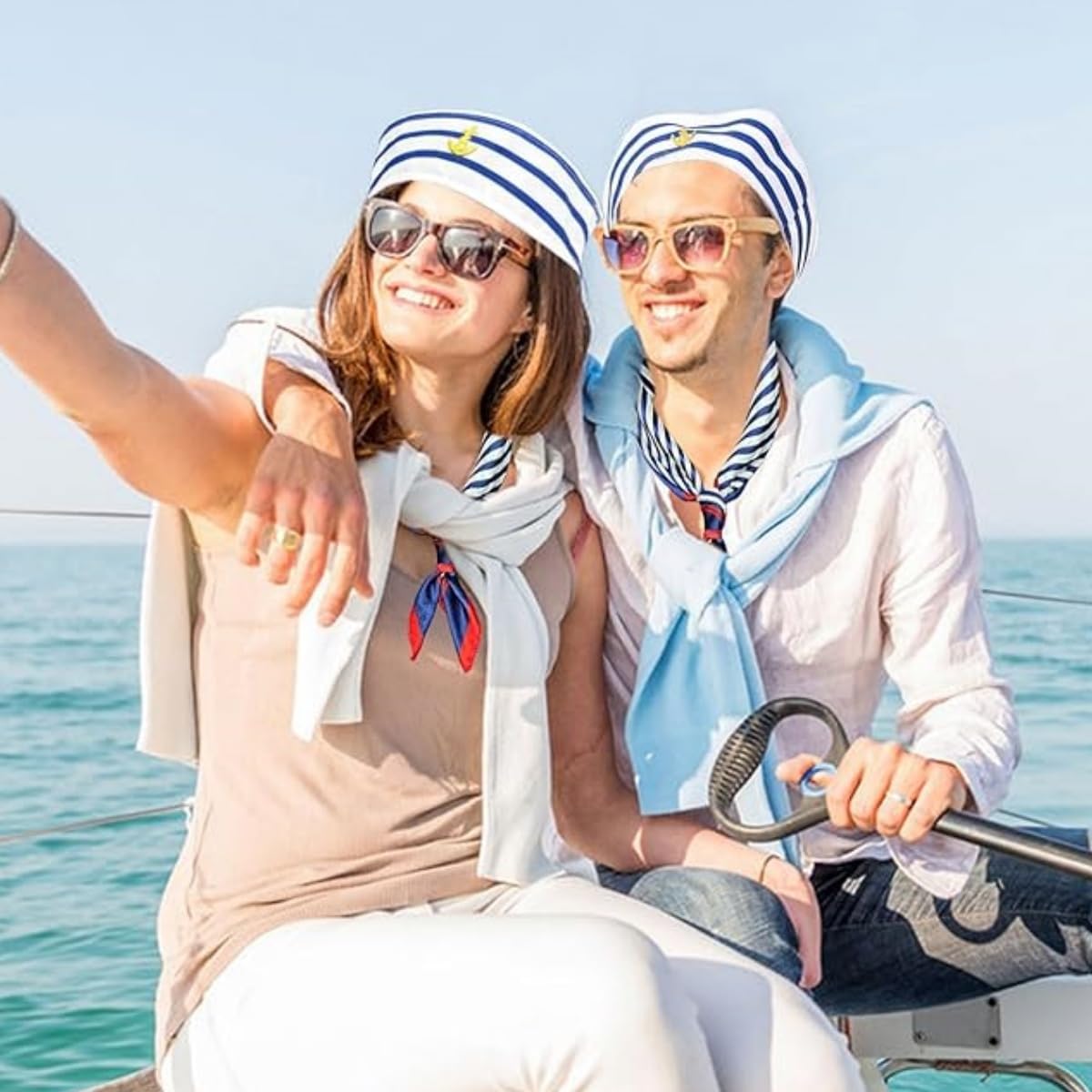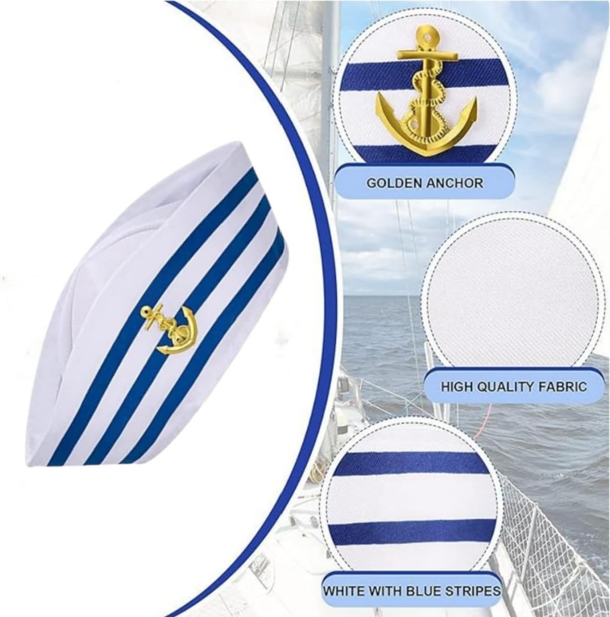 Design autentico dal fascino marittimo: il set costume da capitano marinaio contiene **1 cappello da marinaio a righe blu e bianche** e **1 sciarpa quadrata a righe** (50x50 cm). Colori marittimi: classica combinazione di blu e bianco per un vero look da marinaio. Attenzione ai dettagli: **Il cappello presenta un **motivo a barca a vela** sulla tesa, la sciarpa colpisce per i bordi netti e le cuciture resistenti. Mix di materiali: misto cotone e poliestere (cappello) e morbida sciarpa in poliestere – traspirante e delicato sulla pelle Vestibilità regolabile per adulti e adolescenti: circonferenza del cappello 52-59 cm: regolazione della taglia integrata (ad es. con forcina) Sciarpa come multiuso: usa la sciarpa da 50x50 cm come sciarpa, copricapo o accessorio decorativo. Leggero e portatile, ideale per lunghe feste o eventi cosplay Perfetto per tutte le occasioni nautiche: che si tratti di carnevale, feste a tema o teatro: Il clou del costume:** Diventa capitano alle feste in barca, agli eventi pirata o ai matrimoni marittimi. Adatto per cosplay:** Accessori realistici per anime, Sailor Moon o personaggi marini. Adatto all'uso quotidiano:** Abbina cappello e sciarpa a jeans o blazer per uno stile retrò casual Pratico e facile da pulire: Lavabile in lavatrice: ** Facile da pulire : il colore rimane brillante anche dopo ripetuti lavaggi. Antipiega:** La sciarpa in poliestere mantiene la sua forma anche con un uso intensivo. Salvaspazio:** Design piatto per una facile conservazione in armadi o valigie Regalo ideale per gli amanti della marineria: pronto all'uso: non richiede montaggio, basta disimballarlo e iniziare a festeggiare! Perfetto come regalo dell'ultimo minuto per compleanni o addii al celibato: ordina ora