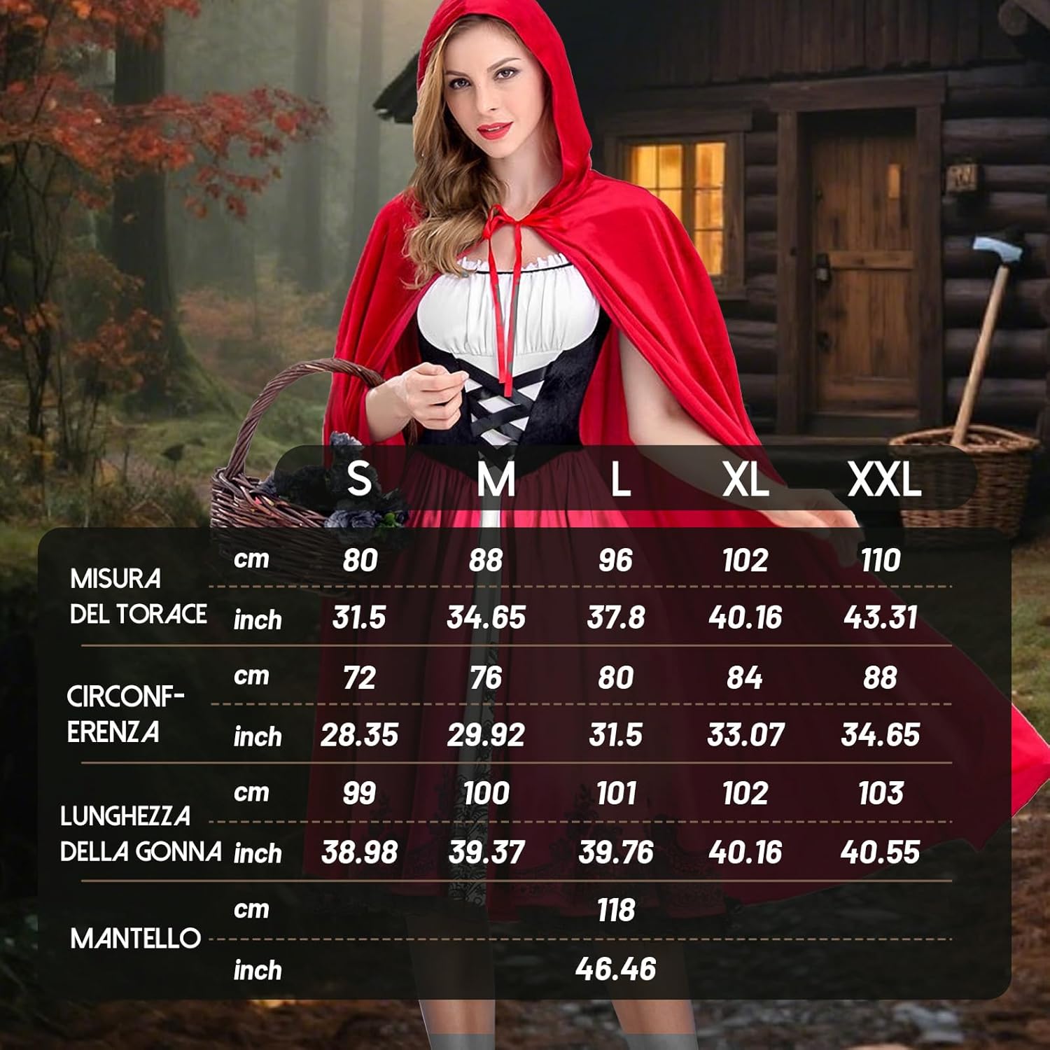 Descrizione prodotto Il perfetto vestito da fiaba di Cappuccetto Rosso, la gonna slim di media lunghezza può farti brillare sia indossata da sola che abbinata a un mantello da strega. Oltre a indossarla alle feste, puoi anche indossare la gonna da sola nella vita di tutti i giorni. misurare: S: Busto 80 cm/31,5in, Vita 72 cm/28,35in, Lunghezza gonna 99 cm/38,98in, Lunghezza mantello 118 cm/46,46in; M: Busto 88 cm/34,65in, Vita 76 cm/29,92in, Lunghezza gonna 100 cm/39,37in, Lunghezza mantello 118 cm/46,46in; L: Busto 96 cm/37,8in, Vita 80 cm/31,5in, Lunghezza gonna 101 cm/39,76in, Lunghezza mantello 118 cm/46,46in; XL: Busto 102 cm/40,16in, Vita 84 cm/33,07in, Lunghezza gonna 102 cm/40,16in, Lunghezza mantello 118 cm/46,46in; 2XL: Busto 110 cm/43,31in, Vita 88 cm/34,65in, Lunghezza gonna 103 cm/40,55in, Lunghezza mantello 118 cm/46,46in Avviso: 1. Si prega di controllare le immagini o la tabella delle taglie sopra prima dell'acquisto; 2. A causa della misurazione manuale, c'è un errore di 1-3 cm che è normale; 3. A causa dei diversi monitor, potrebbero verificarsi degli errori; 4. Lavabile in lavatrice, non candeggiare. Avviso di sicurezza Non lavabile in lavatrice, non candeggiare, non stirare, non asciugare a tamburo.