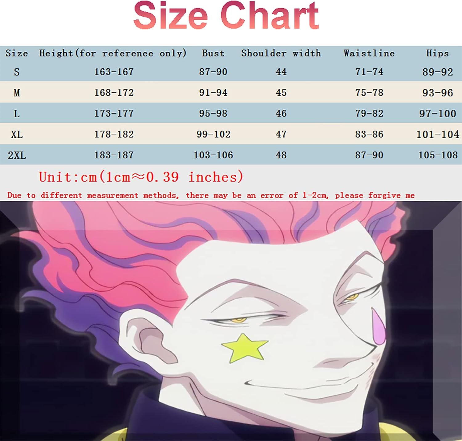 COSTUME HUNTER×HUNTER- Questo è il costume dei personaggi dell'anime “HUNTER×HUNTER”, interamente basato sul prototipo del personaggio. Questo prodotto include tutti i vestiti e gli accessori mostrati nell'immagine, il che è l'ideale per gli appassionati di giochi di ruolo, JOHLCR è qui per servirti INTRODUZIONE ALLE TAGLIE - La tabella delle taglie dettagliata è mostrata nell'immagine per te. Se hai domande sulla taglia o sull'abbigliamento, inviaci un'e-mail. Forniamo un servizio clienti professionale per servirti tutto il giorno MATERIALE AMICO DELLA PELLE - Il materiale principale dell'indumento è cotone + fibra di poliestere, il tessuto è morbido e non danneggia la pelle, puoi indossarlo in qualsiasi stagione SUGGERIMENTI - Ci sono più costumi cosplay tra cui scegliere nel nostro negozio. Puoi abbinarli in base alle tue esigenze. Se desideri acquistare altri costumi, faccelo sapere via e-mail e ti aiuteremo. UTILIZZO IN DIVERSI SCENARI - I migliori regali per feste in maschera, feste a tema, carnevali, giochi di ruolo, notti di Halloween, spettacoli teatrali, ecc.