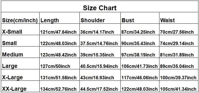 Tabella delle taglie: XS: lunghezza 121 cm; spalle cm 36; busto 87 cm; circonferenza vita 70 cm; Taglia S: lunghezza 122 cm; spalle cm 37,5; busto 90 cm; circonferenza vita 74 cm; Taglia M: lunghezza 123 cm; spalle cm 39; busto 97 cm; circonferenza vita 81 cm Taglia L: lunghezza 127 cm; spalle cm 40,5; busto 106 cm; circonferenza vita 89 cm; Taglia XL: lunghezza 131 cm; spalle cm 43; busto 117 cm; circonferenza vita 100 cm Taglia XXL: lunghezza 134 cm; spalle cm 44,5; busto 122 cm; circonferenza vita 105 cm; A causa delle differenze nelle impostazioni del monitor, i colori effettivi del prodotto potrebbero essere leggermente diversi dalle immagini mostrate. Si prega di fare riferimento al progetto reale per la precisione.