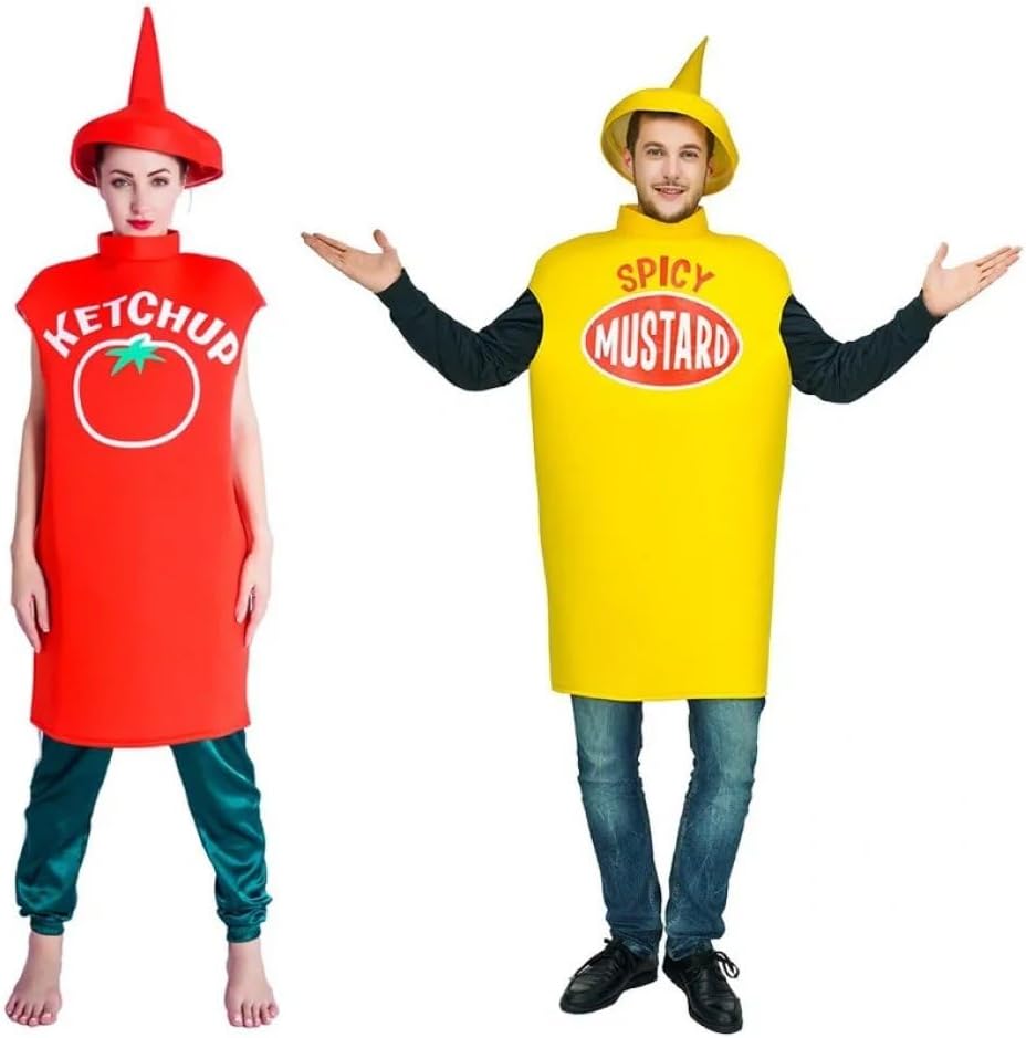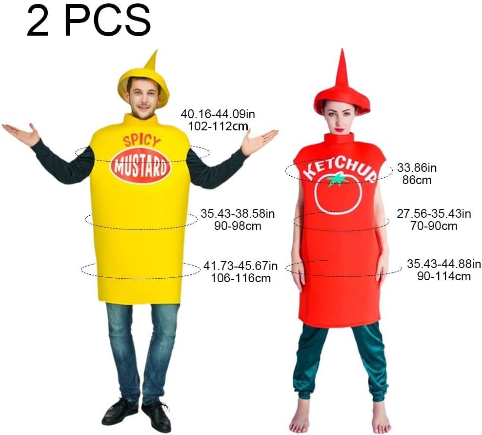 Costume divertente unico! Indossare i costumi è facile e veloce! I set di costumi sono unisex adatti alla maggior parte degli adolescenti adulti. Costume di coppia perfetto! Ideale per Halloween, feste a tema e feste in maschera. Questo set include un costume da ketchup senape. Costume da fumetto di alta qualità che farà sicuramente molte risate.
