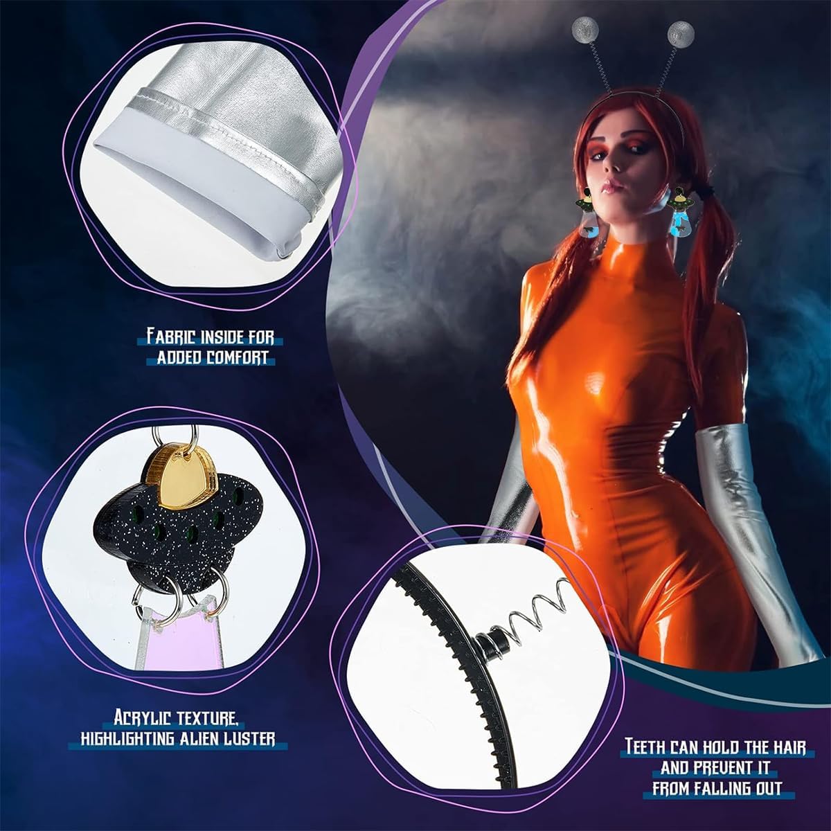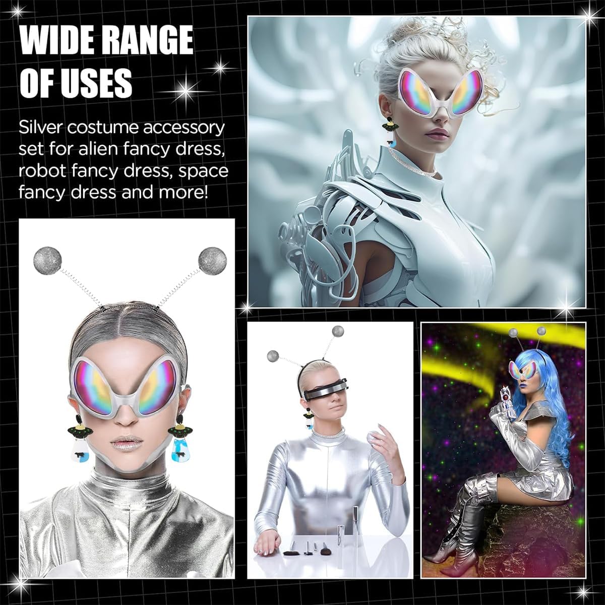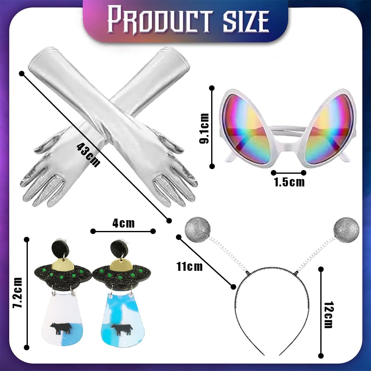 Regalo divertente: questo set di occhiali da sole alieni può essere un regalo divertente per bambini, famiglia e amici, e la struttura della montatura degli occhiali è adatta per la maggior parte delle persone, può creare molto divertimento e risate per te, la tua famiglia e i tuoi amici, trascorrendo un buon tempo insieme. Il pacchetto include: 1 x fascia per capelli aliena 1 paio di orecchini alieni 1 paio di occhiali da sole 1 paio di guanti Materiale: ABS Colore: argento Dimensioni: Fascia per capelli: 12*10 cm Occhiali: 14,5*9,1 cm Guanti: 43 cm Orecchini: 4*7,2 cm Nota: Si prega di controllare attentamente le dimensioni prima dell'acquisto. A causa dei diversi display, i colori potrebbero essere leggermente diversi.