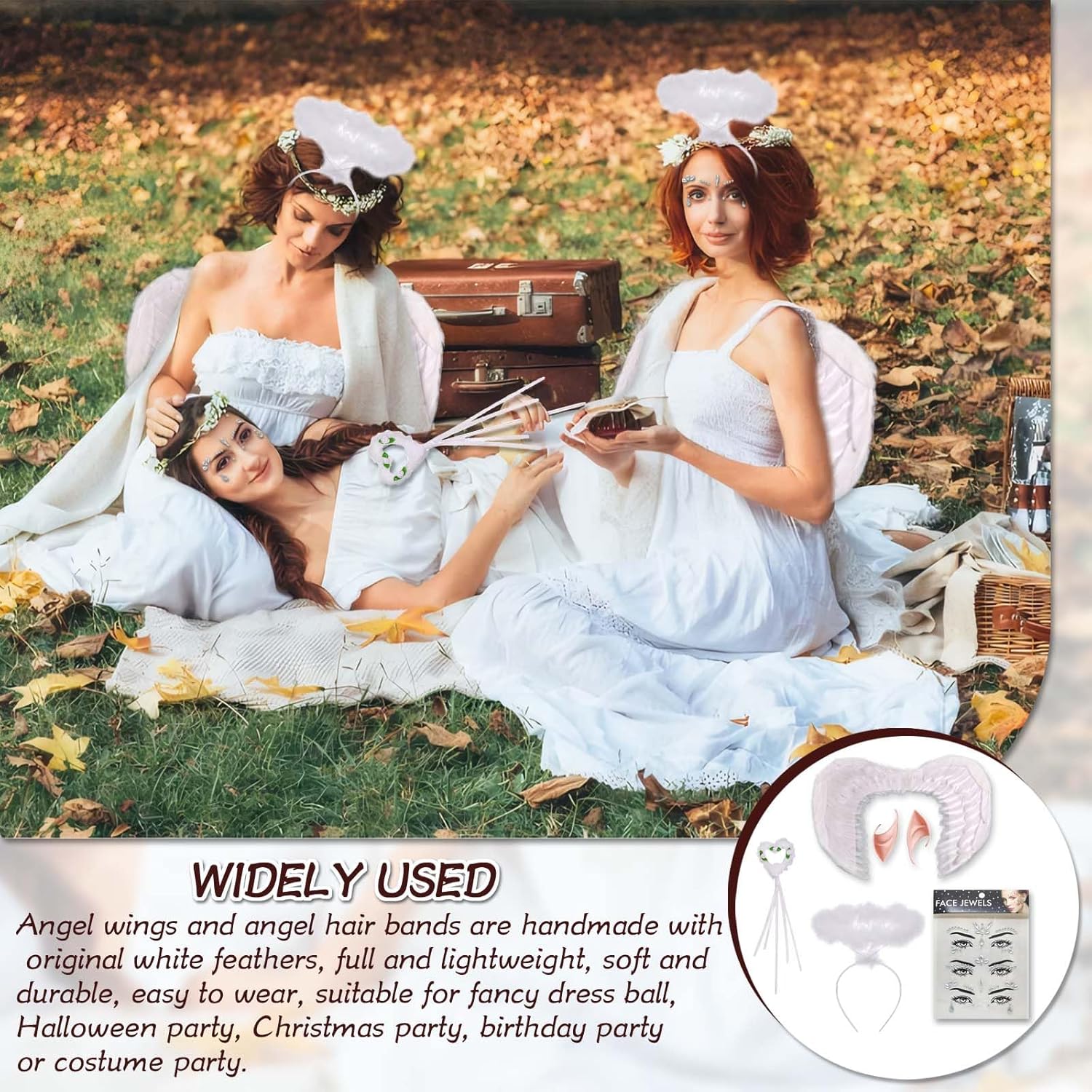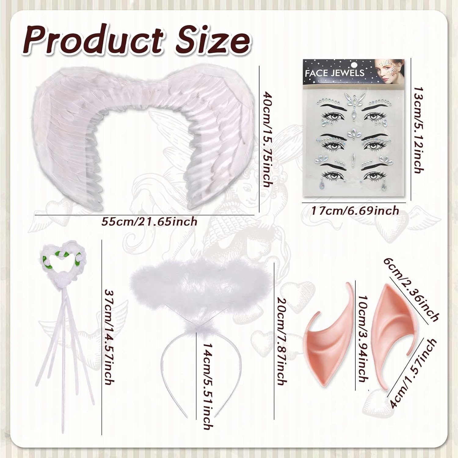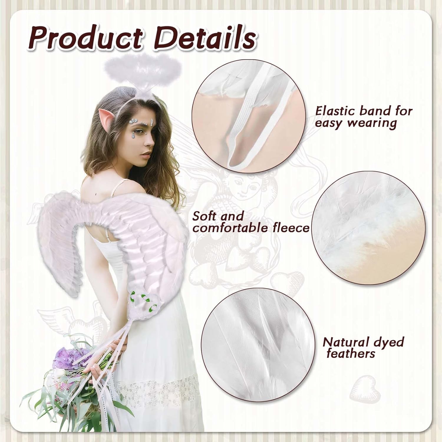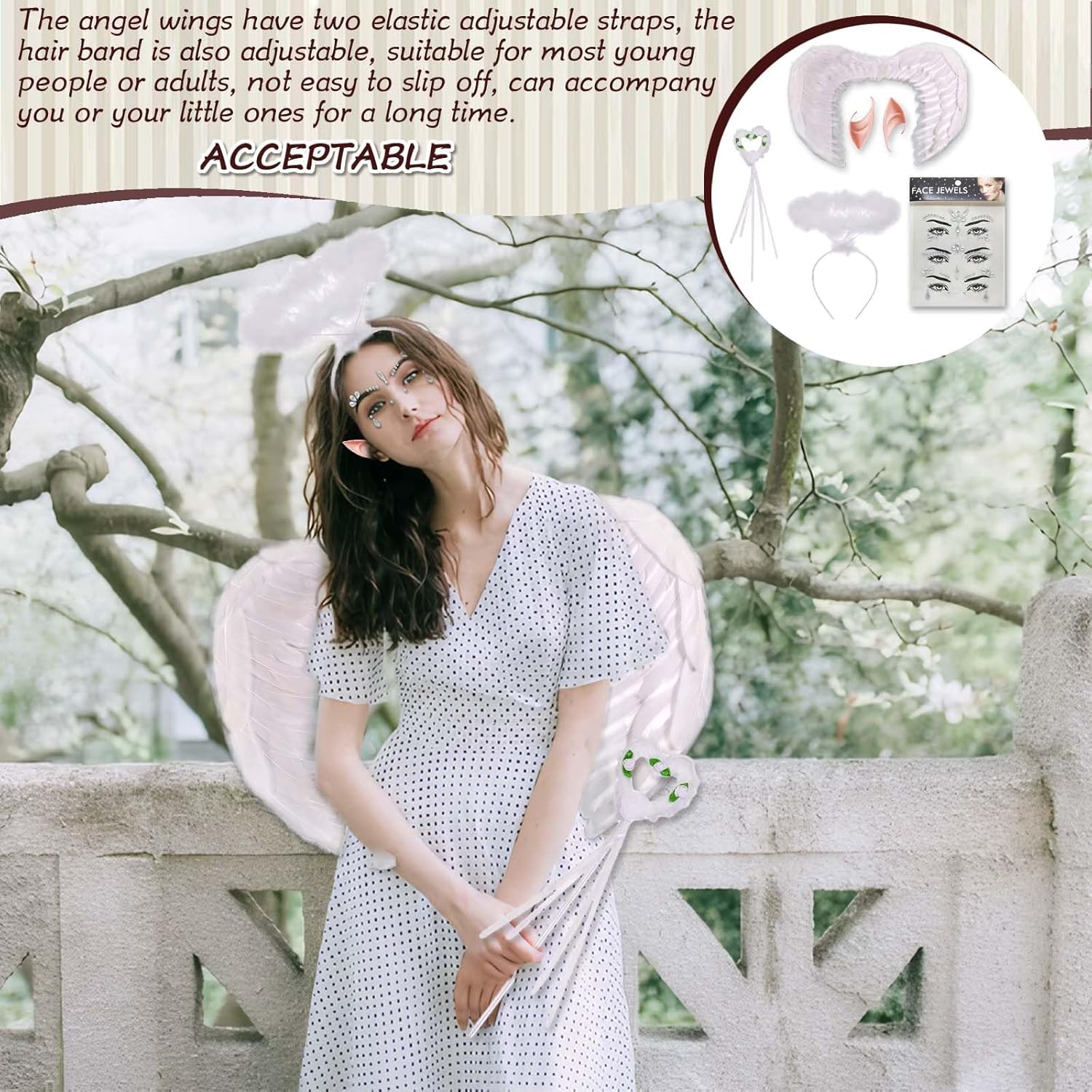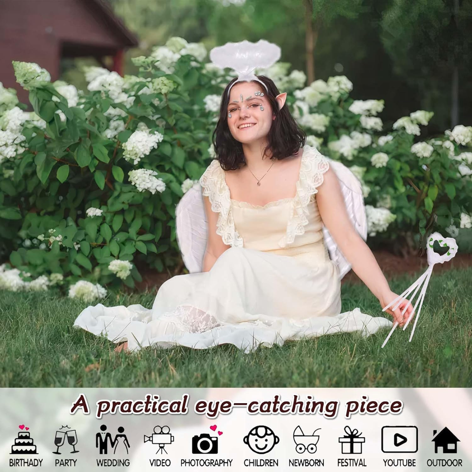 Questo set di costumi da angelo include un paio di ali bianche, un'aureola, una bacchetta magica, un paio di orecchie da elfo di 10 cm e un set di adesivi per occhi 3 in 1.Le nostre ali da angelo hanno due cinghie elastiche regolabili e l'aureola è anche regolabile, il che lo rende adatto alla maggior parte dei ragazzi e degli adulti senza rischiare di cadere. Le ali da angelo sono di dimensioni 55 cm*40 cm, non troppo grandi e non troppo piccole. Sono le ali da angelo perfette e leggere per ragazzi e adulti.Le ali da angelo e l'aureola sono realizzate a mano con vere piume bianche. Sono piene, leggere, morbide, durature e facili da trasportare. Alta Qualità: L'ala d'angelo e l'alone d'angelo sono realizzati a mano con piume bianche originali, piene e leggere, morbide e resistenti, facili da indossare. Regolabile & Confortevole: Le ali hanno due cinghie elastiche regolabili e l'alone è regolabile, adatto alla maggior parte dei bambini o degli adulti, non è facile cadere. Può accompagnare te o tuo figlio per molto tempo. Usi Ampi: Queste bellissime ali d'angelo e set di aureole sono perfette per feste a tema in costume, feste di Halloween, feste di Natale, feste di compleanno, feste in maschera o oggetti di scena per foto. Con queste ali sembri sceso dal cielo.