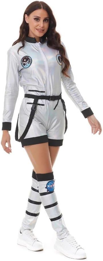 Abbinalo ad una cintura con fibbia per valorizzare la tua silhouette. Un outfit già abbinato è un regalo ideale per i tuoi cari. Adatto per feste di Natale, vigilia di Natale, Halloween, giochi di ruolo, spettacoli, cosplay, abbigliamento da club, mascherate, carnevali, indumenti da notte e altro ancora. Realizzato in poliestere traspirante e delicato sulla pelle, il tessuto premium garantisce un buon comfort e morbidezza durante l'uso. Il body intero da donna è progettato con collo alto, maniche lunghe, cerniera frontale, finiture a contrasto, pantaloncini e vestibilità ampia. Il metallo lucido conferisce un aspetto attraente che ti fa sembrare un astronauta spaziale professionista, il che aggiungerà più divertimento alla festa.