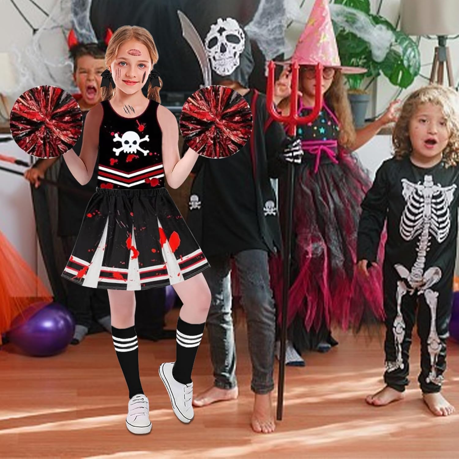 Descrizione prodotto Questo costume da cheerleader di Halloween per ragazze include un top, una gonna, calzini a righe, pompon, fascia per capelli con fiocco e adesivi per tatuaggi che possono essere facilmente creati completamente. Il costume da cheerleader è realizzato in poliestere di alta qualità, morbido ed elastico, traspirante e resistente. Il costume da zombie per bambini in nero, rosso e bianco con elementi scheletrici è una vera attrazione. Il costume di Halloween per bambini è disponibile in due taglie, adatto per ragazze con un'altezza di 120 cm e 130 cm. Il tessuto è elastico, quindi è possibile scegliere anche taglie più piccole. Il costume da cheerleader per bambini è adatto per diverse occasioni come Halloween, feste di compleanno e gare di danza. Colore: come da immagine. Materiale: tessuto. Contenuto: 1 parte superiore + 1 gonna + 1 calzini a righe + 2 pompon + 10 adesivi per tatuaggi. Avvertenze: Misurazione manuale, si prega di considerare un margine di tolleranza di 1-2 cm. A causa dell'illuminazione e dello schermo, il colore dell'articolo reale potrebbe essere leggermente diverso dalle immagini. Grazie per la comprensione. Avviso di sicurezza no