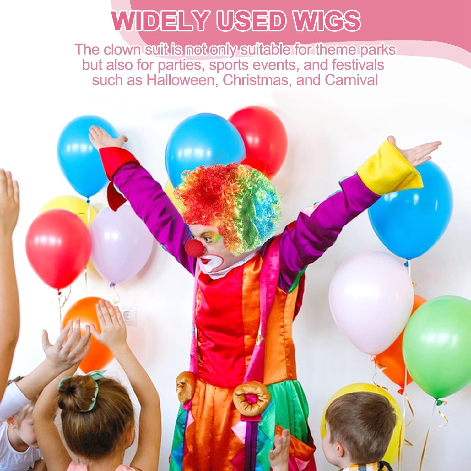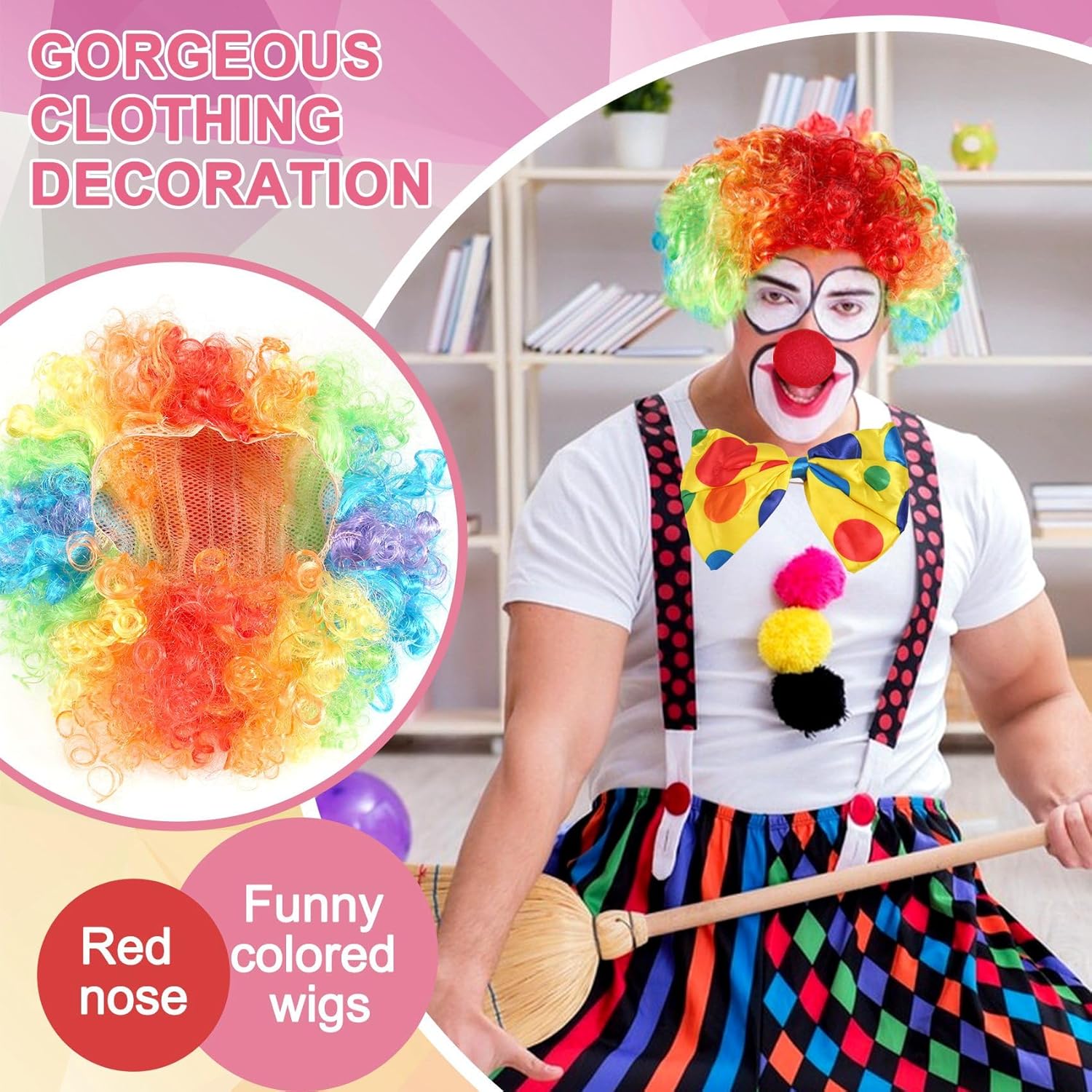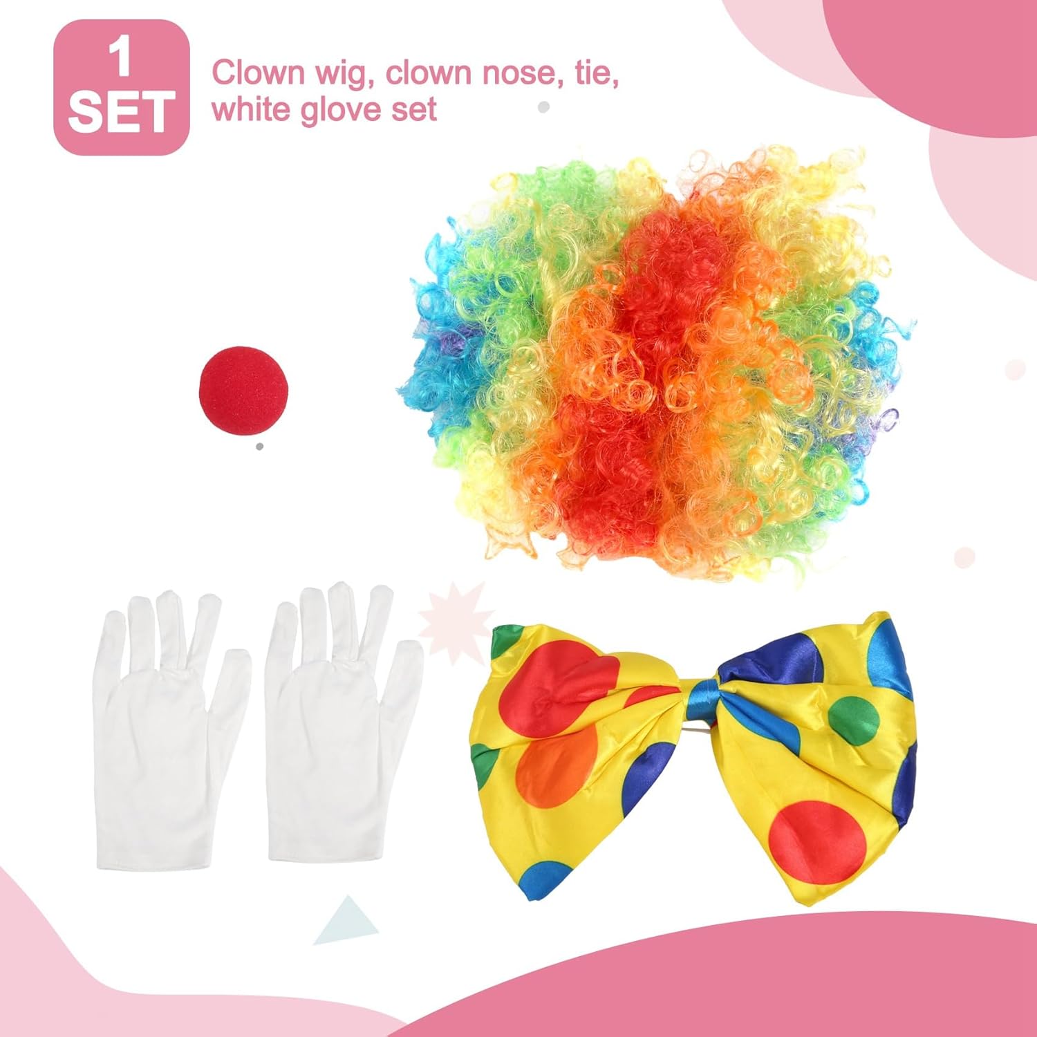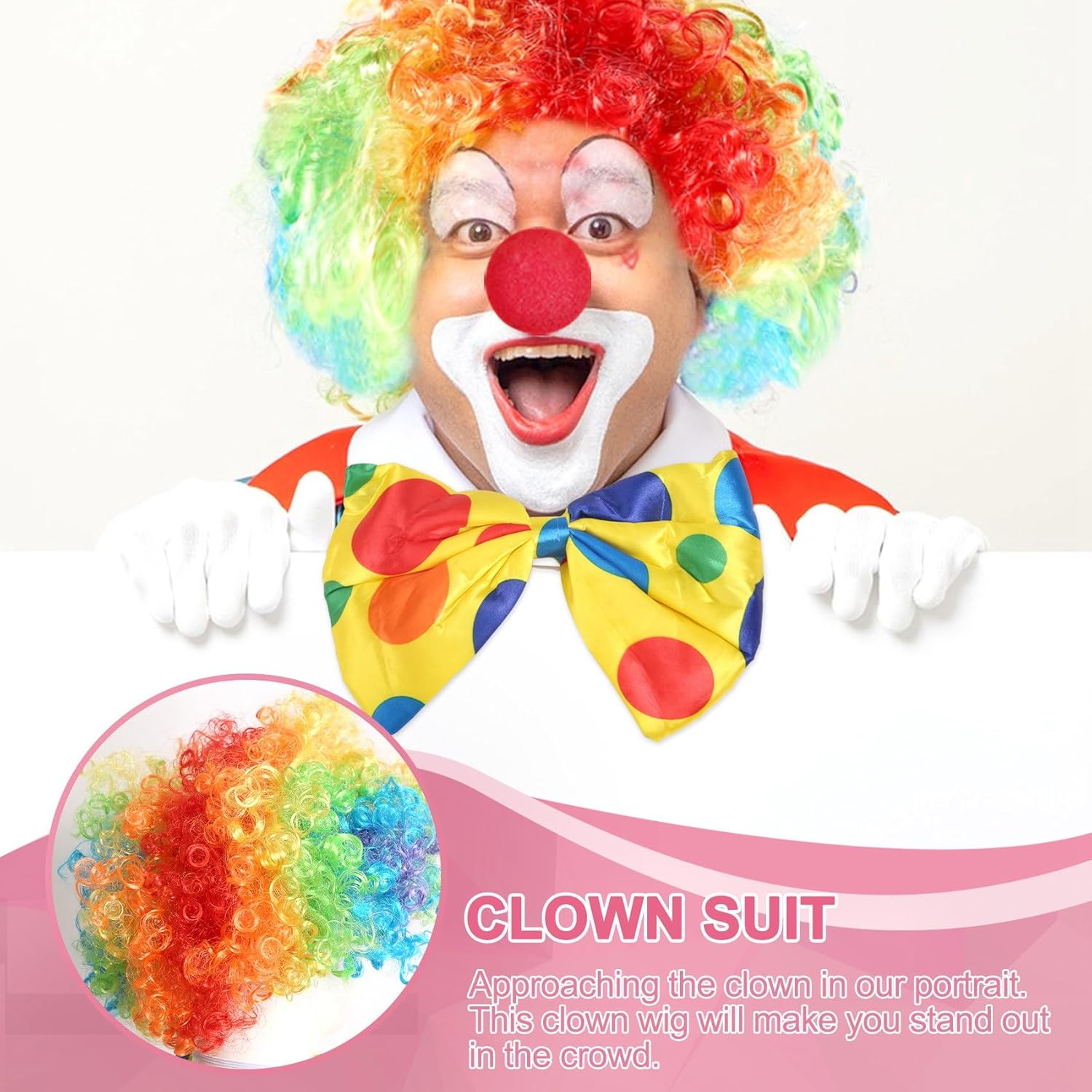 MATERIALE PREMIUM: la nostra parrucca da clown è realizzata in tessuto, morbida e traspirante da indossare. I sono realizzati in cotone, comodi, elastici per adattarsi alla maggior parte delle . Vesti con questi set di costumi da clown, porterai molto divertimento agli altri. COSA RICEVERAI: Ogni confezione contiene una parrucca da clown, un paio di , un naso da clown in schiuma e un papillon. Parrucca da clown: parrucca da clown progettata con capelli e ricci, molto simile al clown nella nostra impressione. Questa parrucca da clown ti farà risaltare tra la folla. AMPIO UTILIZZO: il set da clown non è solo per il a tema, ma anche per feste, sportivi e festival, come Halloween, Natale, Mardi Gras. Un ottimo vestito per te. INFORMAZIONI TAGLIA: la parrucca con è adatta per la maggior parte della testa. La circonferenza della testa può essere fino a 25 pollici. Dopo averlo ricevuto, puoi usare l'asciugacapelli per gonfiare la parrucca e renderla più vivida.