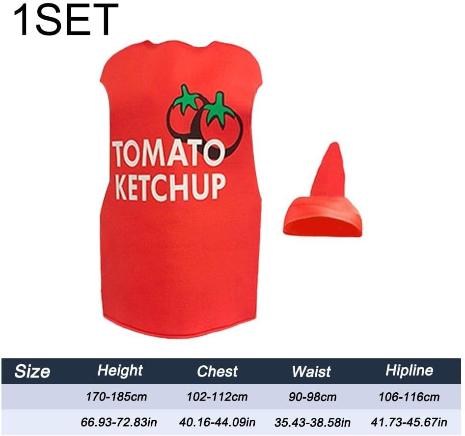 Assapora il condimento più popolare per le feste con questo classico costume da ketchup in schiuma di tessuto. Presenta una tunica rossa monopezzo con "ketchup" stampato sul davanti e un grazioso cappello a becco rosso. Materiale in poliestere di alta qualità, completamente confortevole per una varietà di corpi. Perfetto per feste in costume, feste a tema, costumi in maschera o qualsiasi evento speciale. Sembra una vera bottiglia di salsa! Perfetto per Halloween, spettacoli, feste a tema, cosplay, carnevale, Pasqua, Capodanno e tanto altro.
