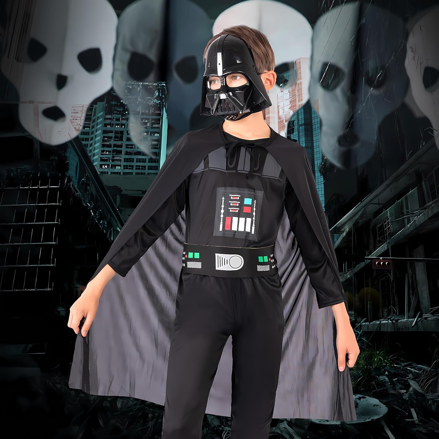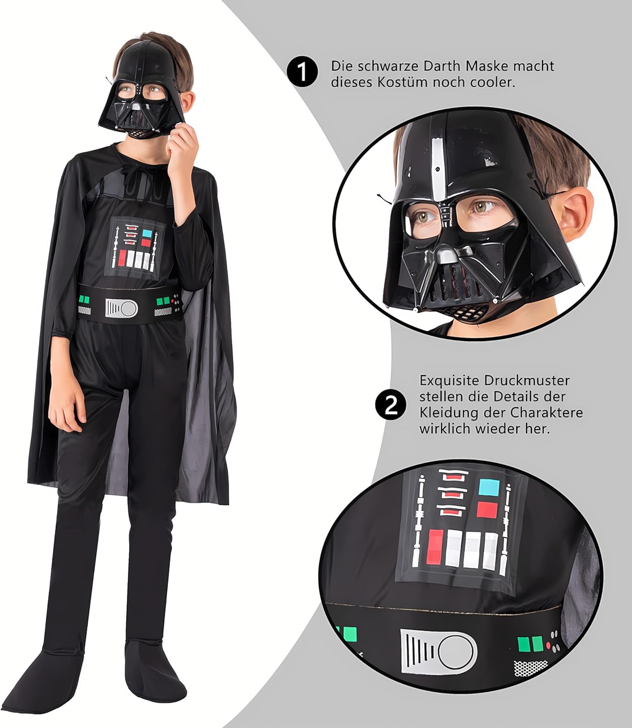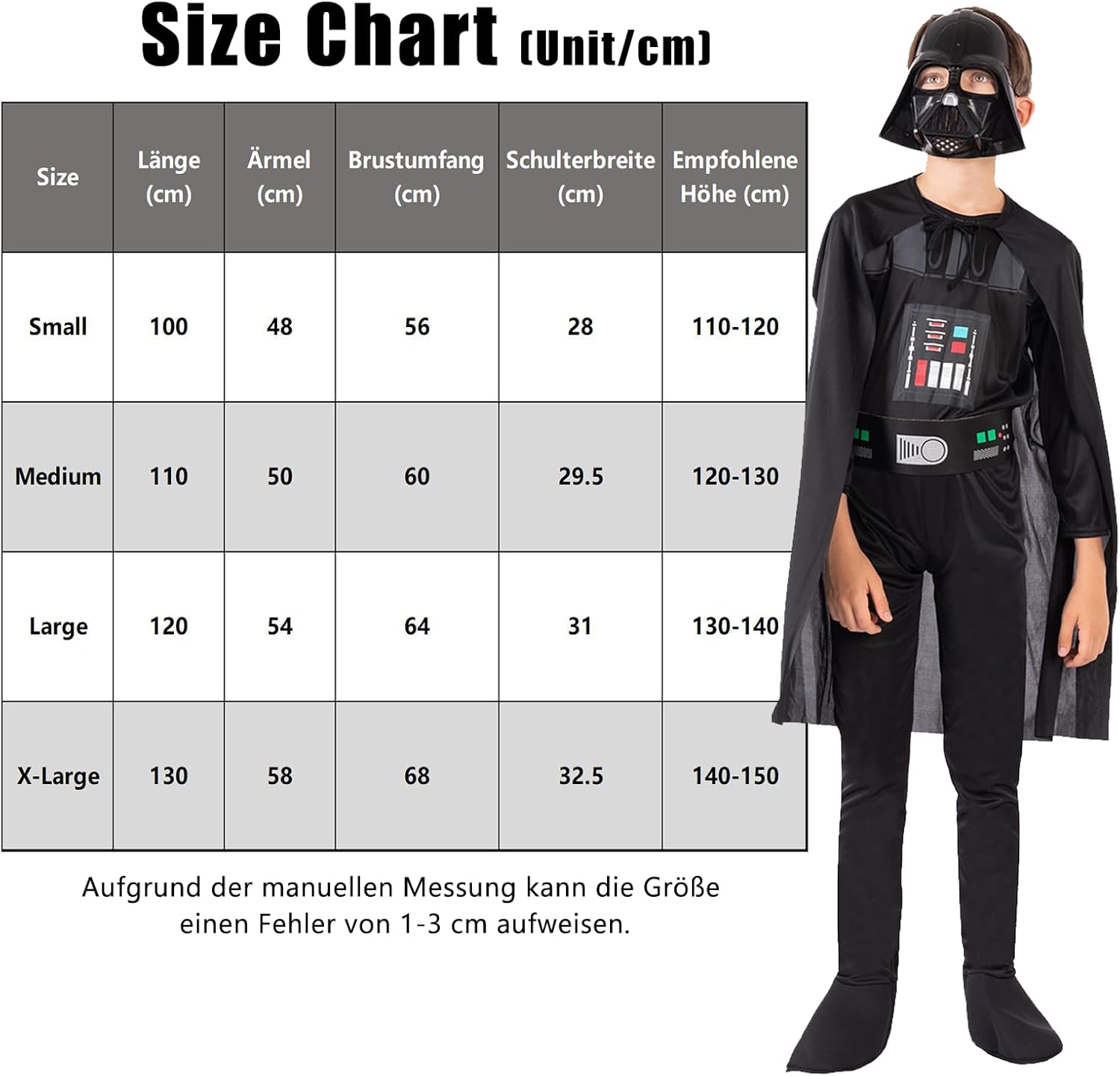 Materiale: tessuto di poliestere sano e confortevole. TAGLIA: puoi scegliere la taglia esatta in base all'età, all'altezza e alla taglia abituale del tuo bambino. UTILIZZO Il costume da Darth Vader per bambini è adatto per molte occasioni, in particolare per eventi di festa come Halloween, carnevale, Natale, Pasqua, eventi scolastici, ecc. I costumi da cavaliere sono regali cosplay ideali per bambini. Precauzioni: Si prega di controllare attentamente la tabella delle taglie prima di acquistare il costume. A causa della misurazione manuale, le dimensioni possono variare di 1-3 cm.