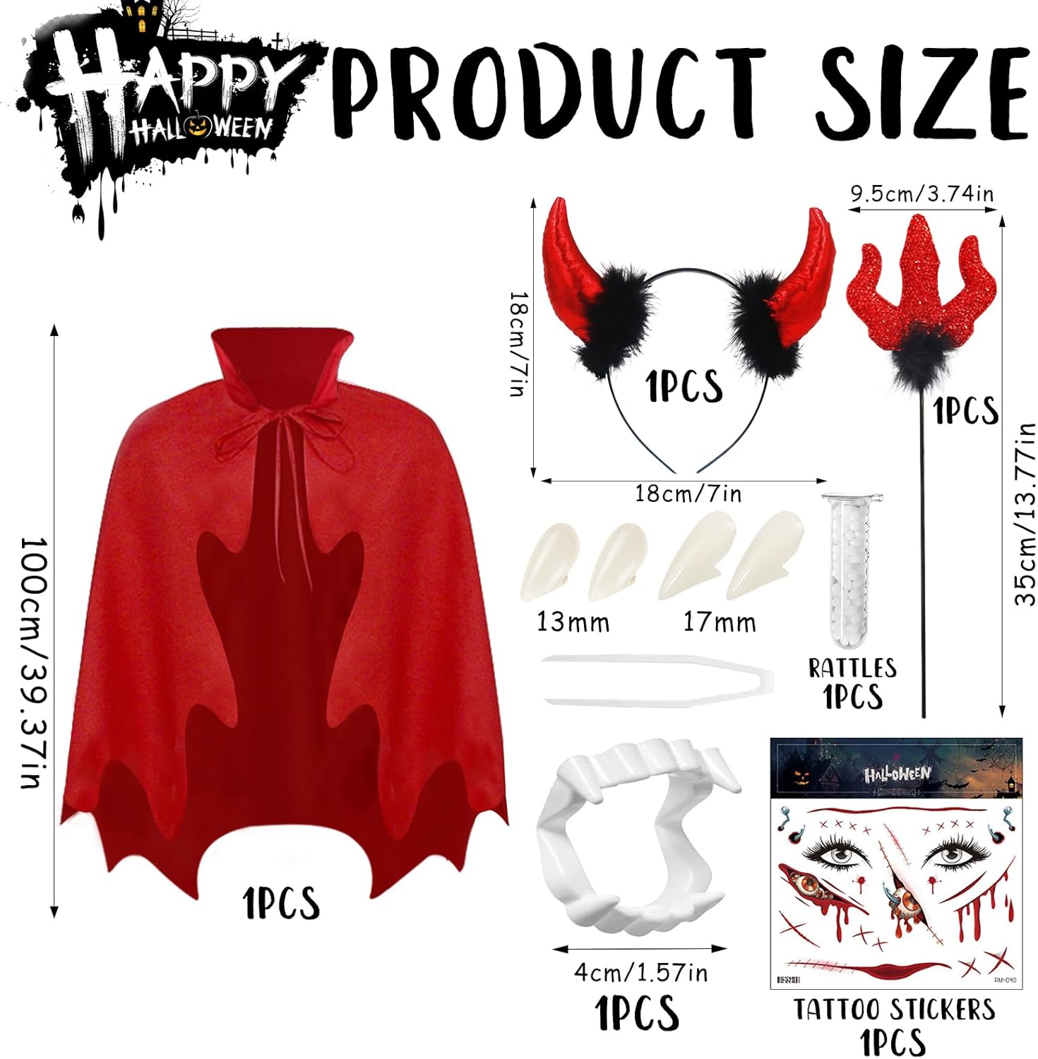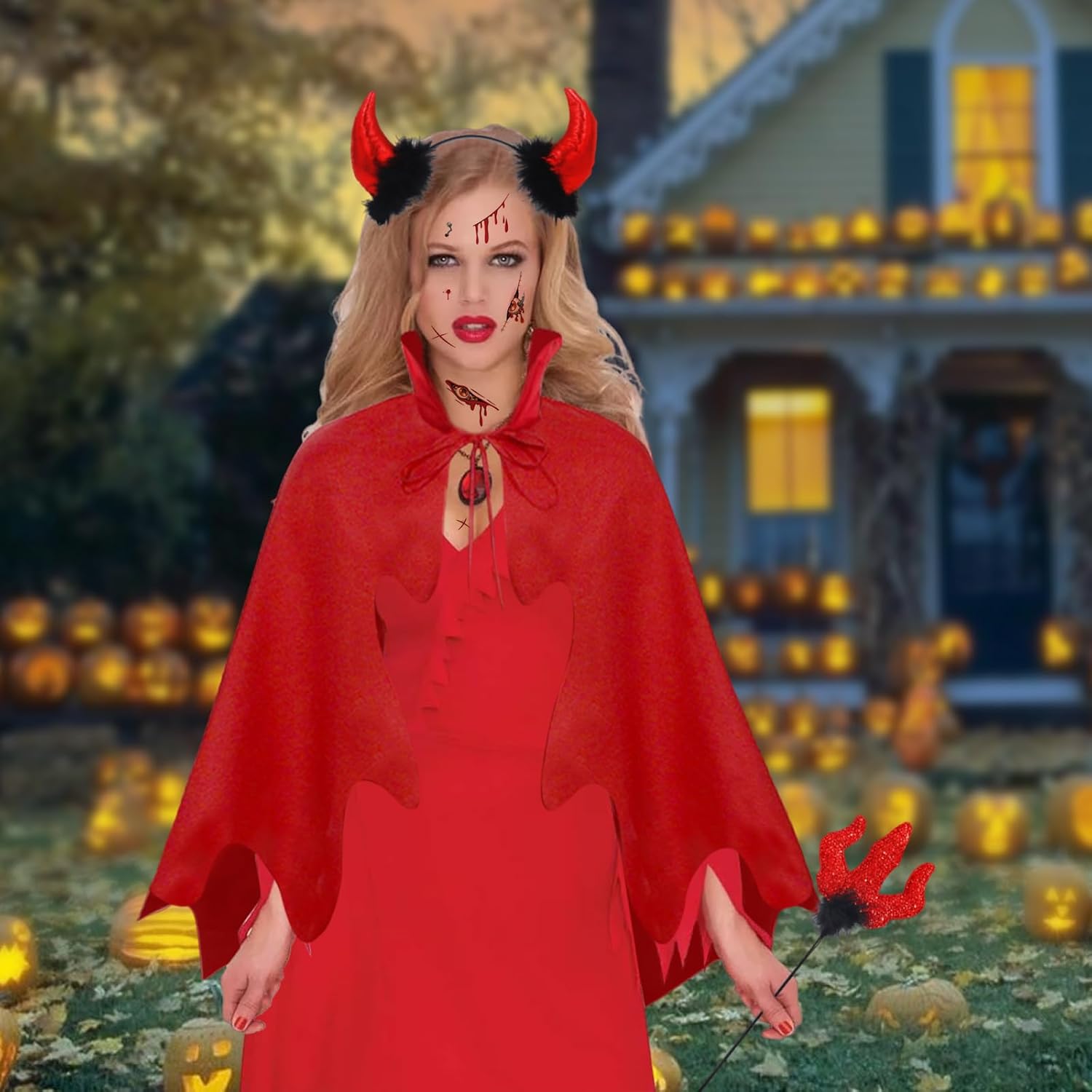 Set di costumi da diavolo: 1 mantello da diavolo da 100 cm con colletto alto, 4 protesi, 1 denti del diavolo, 1 tatuaggio viso di Halloween, 1 forchetta del diavolo, 1 corna da diavolo, gel dentale da 5 g, 1 pinzetta. Trasformatevi in l'ultima seducente demone con il nostro costume da diavolo di Halloween et. Tessuti comodi: il set di costumi da diavolo è realizzato con materiali di alta qualità, delicati sulla pelle e leggeri. Mantello del diavolo rosso Distinguersi dalla folla. Dimensioni del costume da diavolo: questo costume da diavolo con cappuccio è pensato per adulti, la dimensione del mantello del diavolo è lunga 90 cm e si adatta alla maggior parte delle donne. Cappuccio del mantello decorato con corna del diavolo per dare al vostro outfit un ulteriore tocco di fascino diabolico. Facile da indossare: nastri sul collo, basta legarlo al collo, non cadono. Con la forcella da diavolo in dotazione, la patta a occhiello in pizzo con denti da vampiro, ciò che serve per completare il tuo look verruchten. Versatile: il mantello da diavolo con cappuccio, perfetto per feste in costume di Halloween, carnevale, cosplay, vampiro, mago, capo, morte. Mantello del diavolo con cappuccio accessorio set è diventato il centro dell'azione