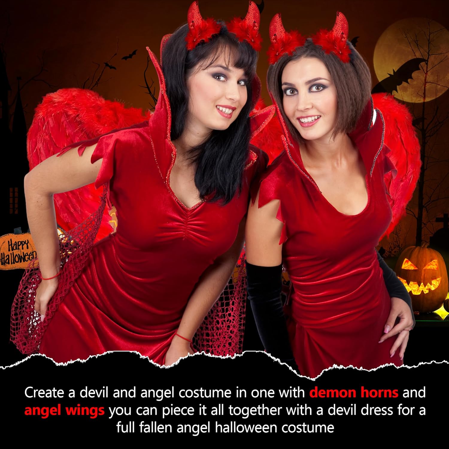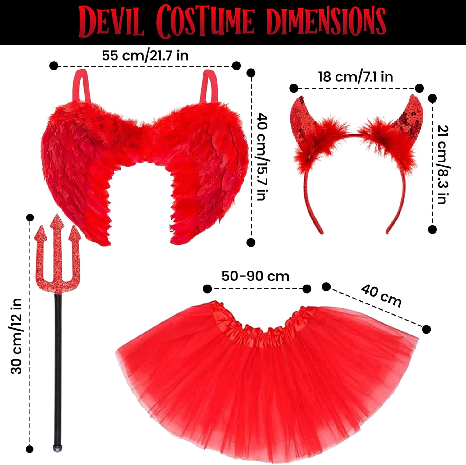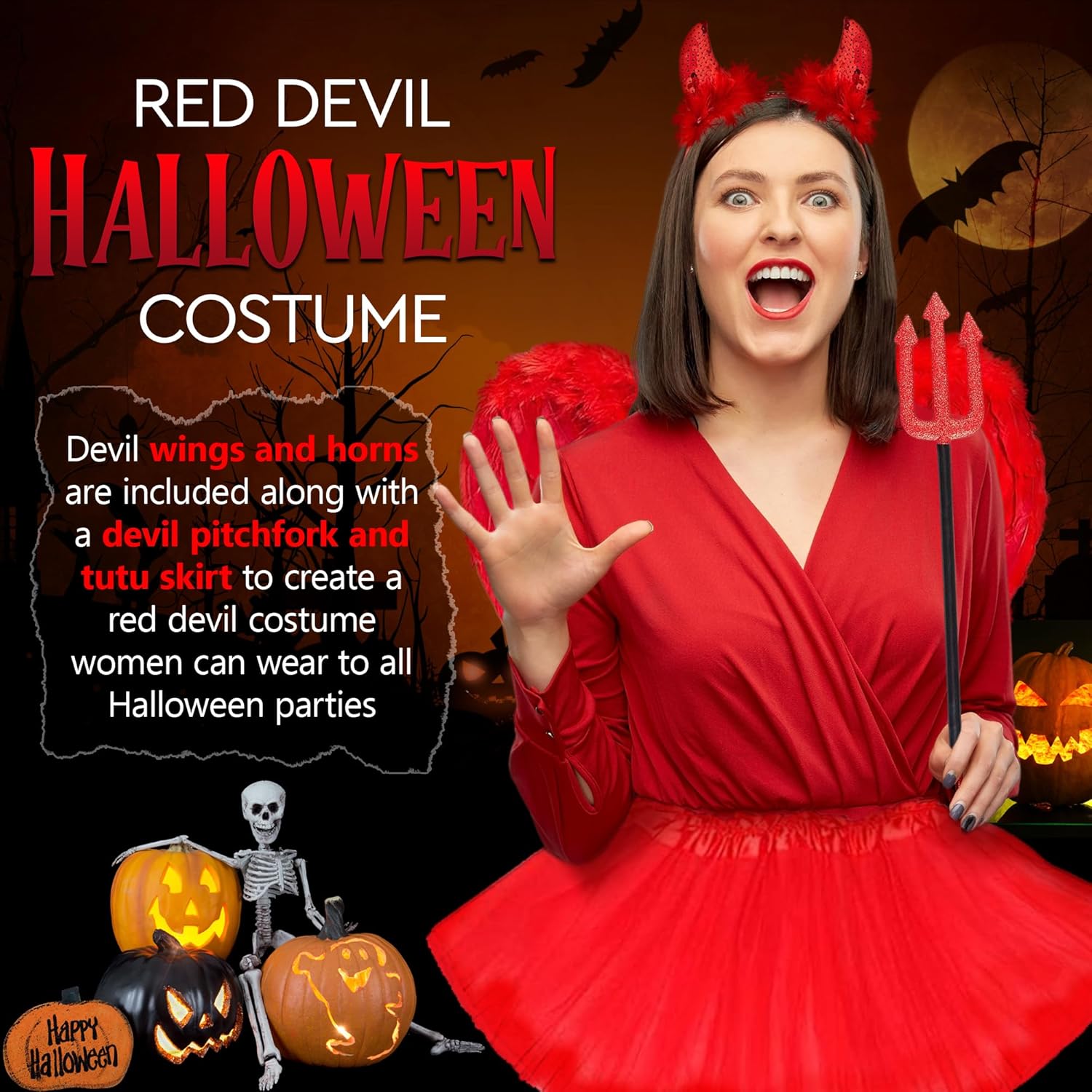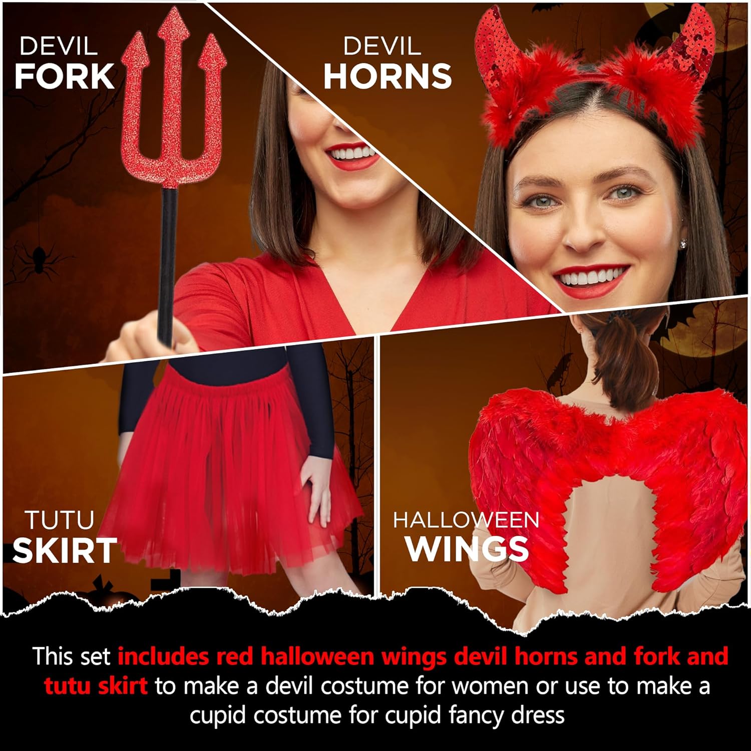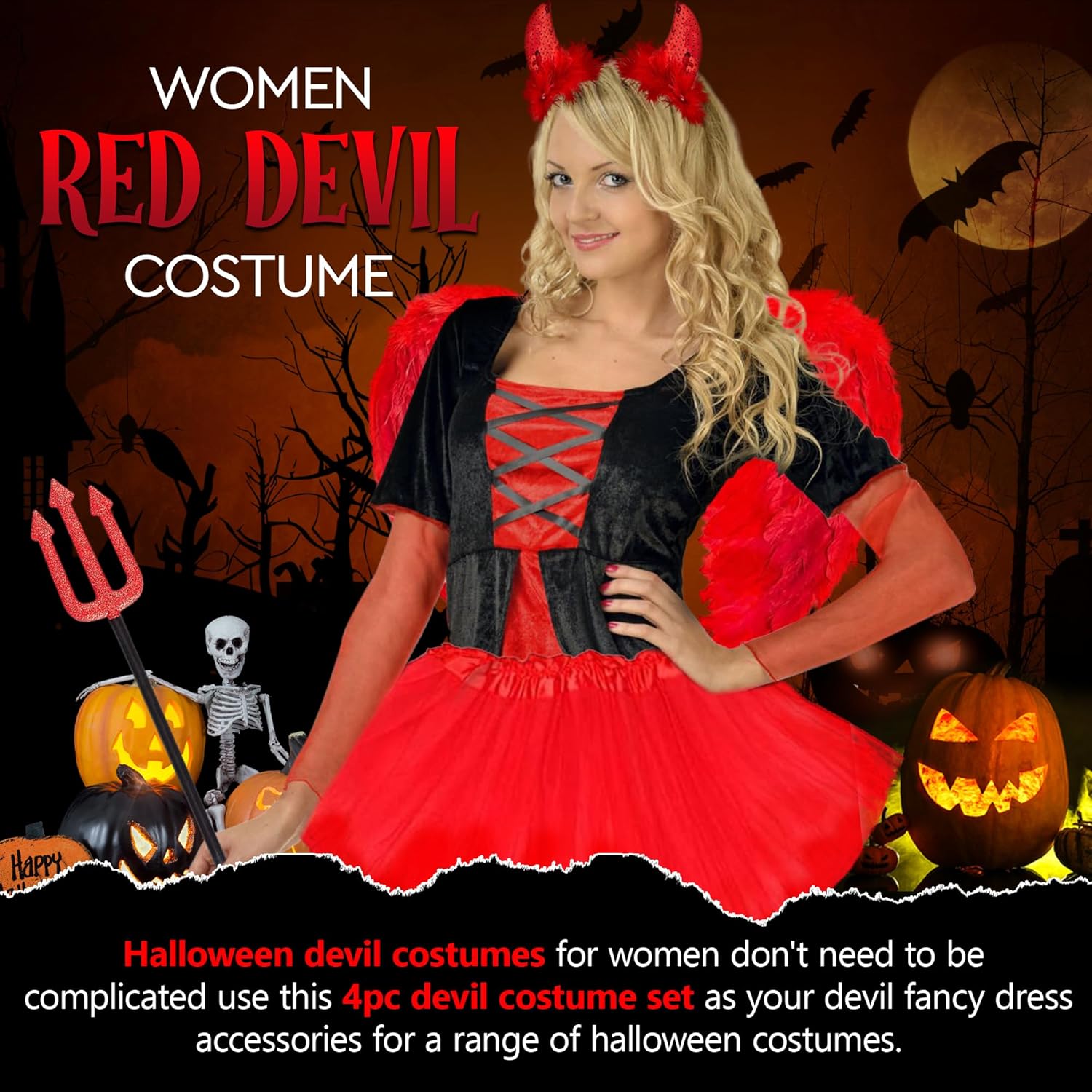Costume da diavolo rosso 4 pezzi - Costume da donna Halloween - Ali da diavolo rosso -Corna diavolo rosso - Tutù con forcone da diavolo - Vestito da diavolo - Costume da diavolo da donna