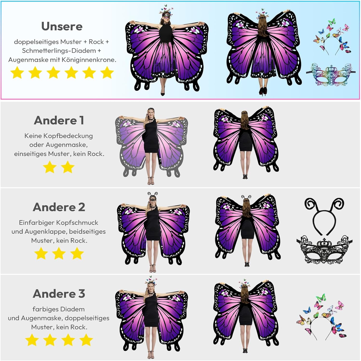 Tolles Kostüm, gut verarbeitet und doppelseitig bedruckt. Haarreif bequem und stabil. Nur die Maske ist absolut nicht zu gebrauchen.