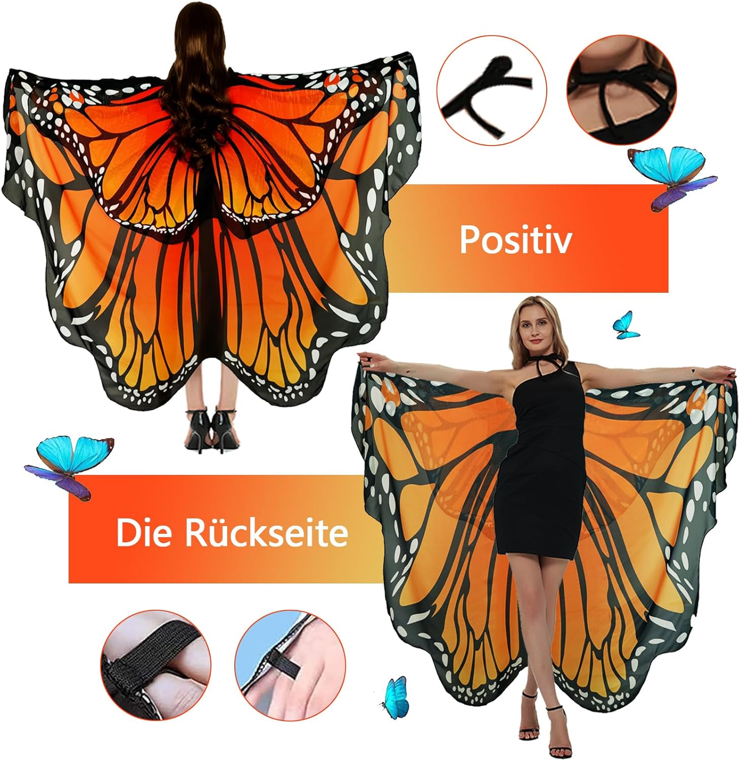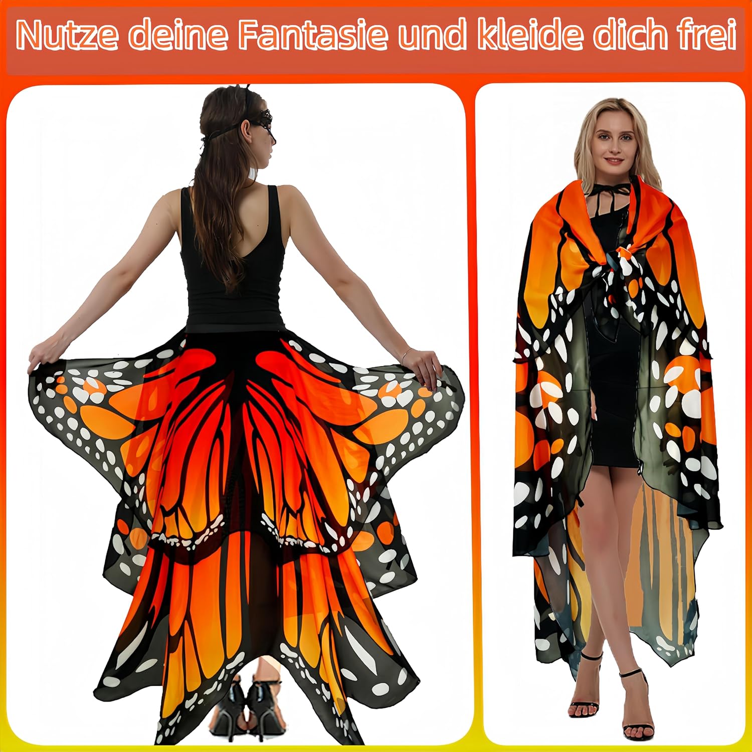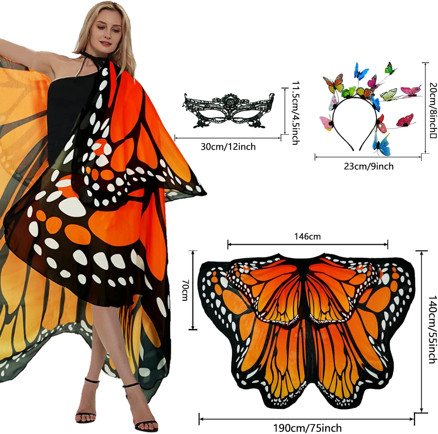 Set di 3 accessori per costume da farfalla: questo costume da farfalla da donna con ali è composto da 1 mantello a farfalla a due livelli per adulti, 1 cerchietto per capelli con farfalla 5D e 1 maschera in pizzo glamour; ali di farfalla per adulti e donne grandi dimensioni: 190 cm x 140 cm, scollo con una dimensione regolabile liberamente di elastici, il costume da farfalla da donna ha una fibbia a mano all'estremità. la fibbia a mano; Può essere utilizzato come abito a farfalla ed è ideale per un costume da donna. Design da donna a due livelli con ali di farfalla: 24 anni l'ultimo costume da farfalla da donna con rivestimento a doppio strato, design modellante da donna, in morbido tessuto chiffon delicato sulla pelle, traspirante; costume a doppio strato farfalla da donna con modellazione unica, lo strato superiore delle piccole farfalle può essere indossato in una varietà di possibilità, può essere utilizzato come sciarpa, sciarpa di seta, accessori per il collo e altri usi decorativi. Più dinamico, bello e affascinante. Combinazione perfetta e ricca: questo set di 3 pezzi di alta qualità per capelli maschera farfalla costume è composto da 14 farfalle regolabili liberamente a forma di farfalla in diverse forme 5D, una bella e affascinante maschera da regina in pizzo morbido e un mantello a farfalla che può essere utilizzato in combinazione o singolarmente; questo costume da farfalla per adulti è di farfalla ispirato alla natura, e le forme e i modelli dell' sono leggeri e belli come le ali della farfalla. Facile da indossare e da togliere: questo costume da farfalla con ali da donna è inoltre leggero e occupa poco spazio, in modo che si adatti facilmente in una borsa. Queste ali di farfalla per adulti sono facili da indossare e togliere. Basta indossare il colletto, poi avvolgere il passante elastico intorno alle dita, agitare delicatamente le braccia, e il morbido mantello a farfalla per adulti vola come le ali di una farfalla e ti farà sembrare un bellissimo costume da fata delle farfalle. Occasioni multiple: questo bellissimo set di 3 cappelli da donna con ali di farfalla a due livelli è perfetto per costumi di carnevale da donna, costume da carnevale da donna, costume da carnevale da donna, farfalle e adulti, costume da pappagallo da donna, festa di carnevale, feste in spiaggia, accessori per danza, gite all'aperto, servizi fotografici, feste in casa e Mascherata. Può anche essere regalato come regalo unico per amici, familiari, colleghi.