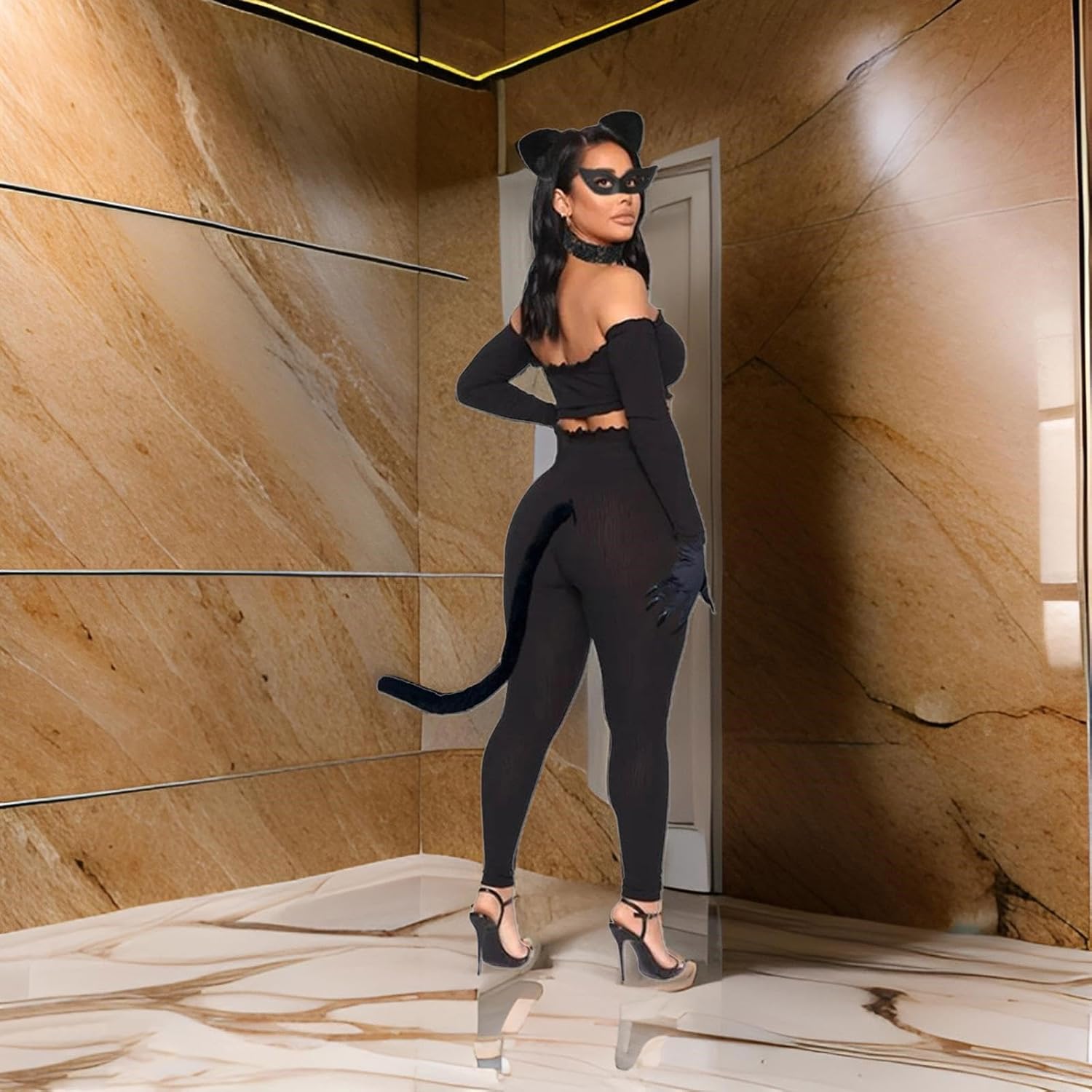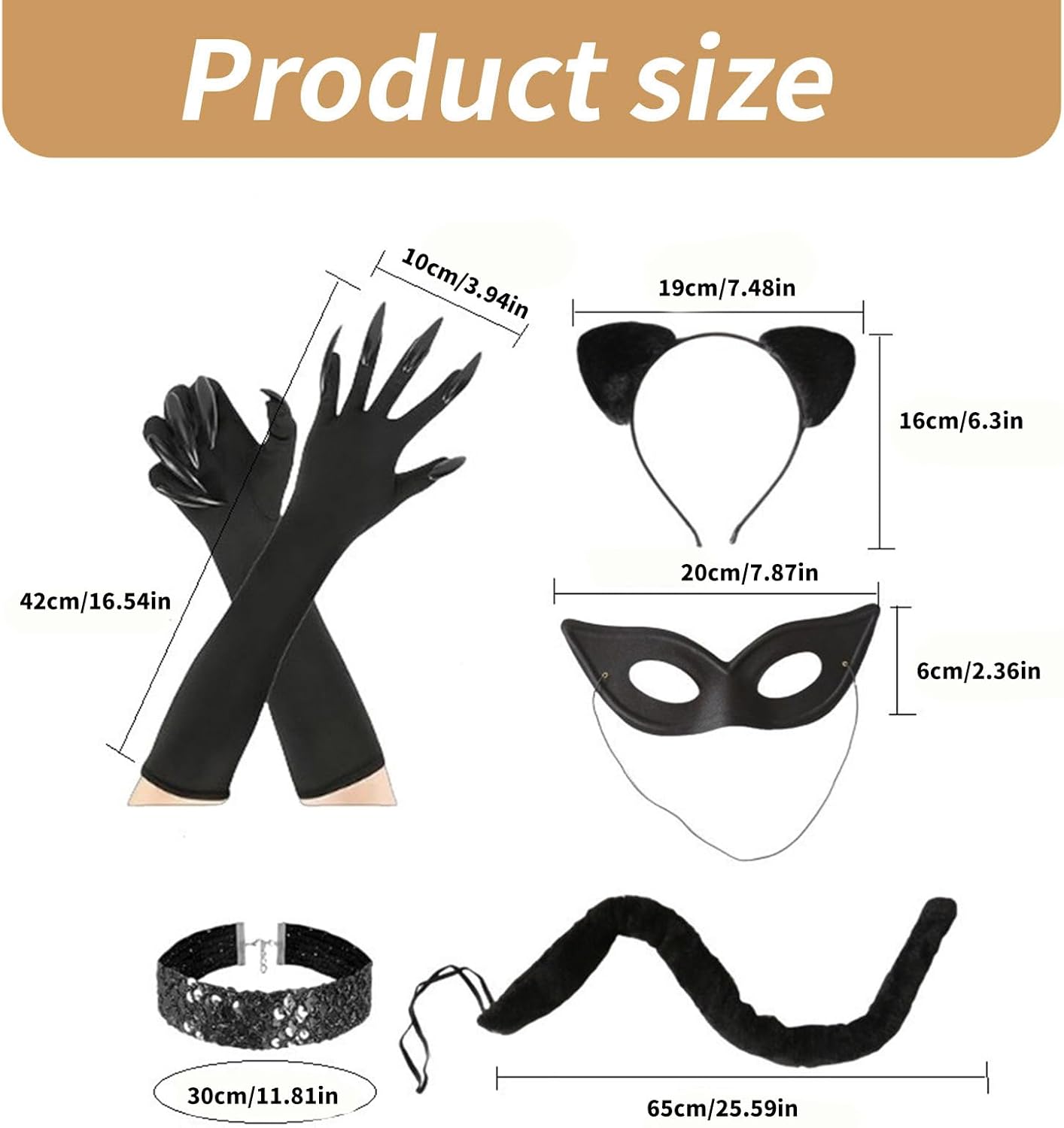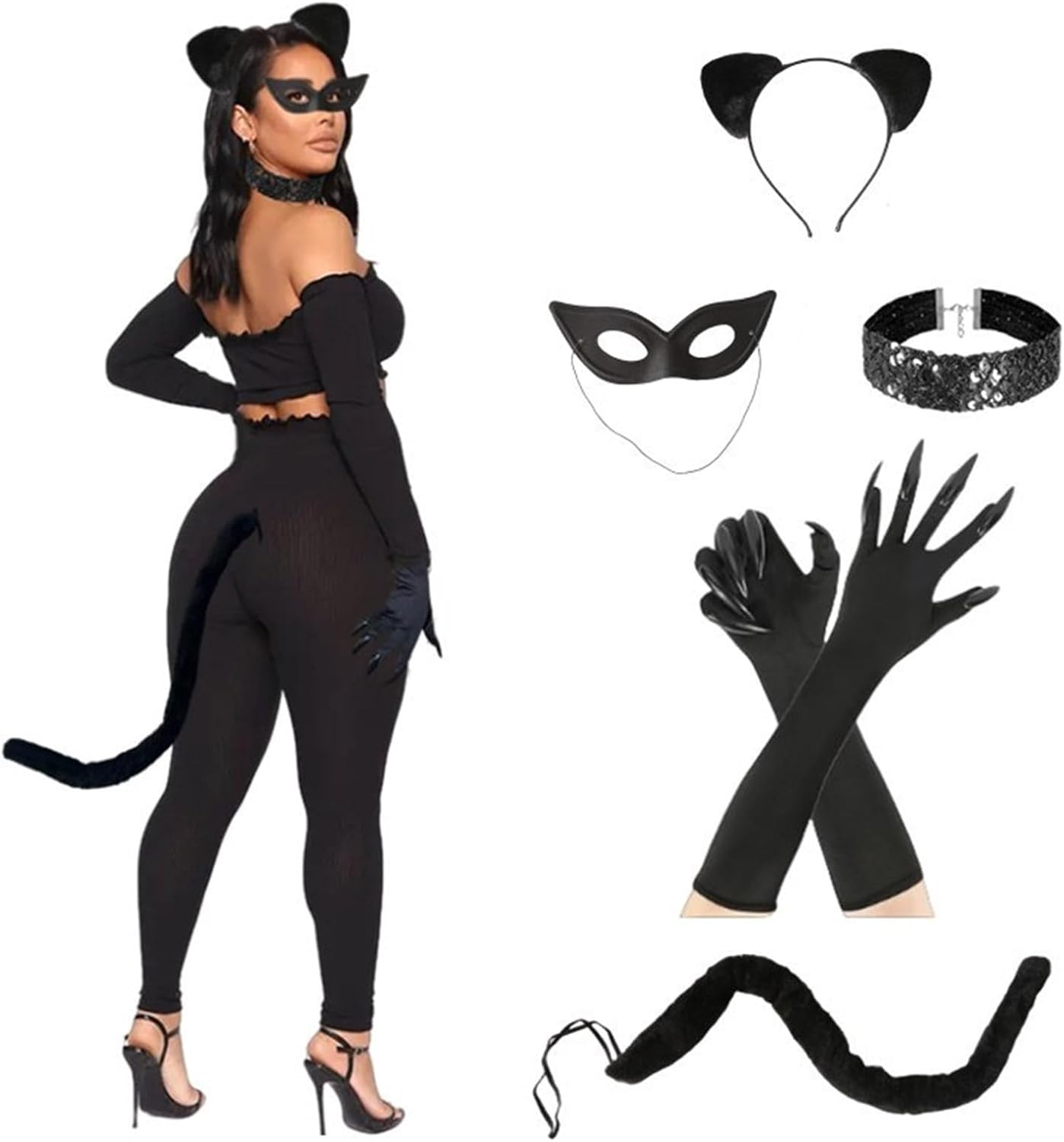 Costume da gatto per Halloween, set con orecchie di gatto, fascia per capelli, guanti con artiglio di gatto, coda di gatto, collana girocollo per gatti neri Caratteristiche: Il nostro set di costumi Catwomen è un ottimo partner per Halloween, feste cosplay e altre occasioni. La coda con fascia elastica, che può regolare le dimensioni ed è adatta per la maggior parte delle persone. Il vestito può soddisfare le vostre esigenze per feste in maschera. Con il set costume di Halloween Catwomen, puoi vestirti come un Catwomen, renderti felice. Il costume per gatti di Halloween da donna è un regalo per la tua famiglia, amico e può anche essere utilizzato come un ottimo oggetto di scena. Specifiche tecniche: Componente: Panno Dimensioni: come da immagine. La confezione include: 1 set di costume da donna Catwoman. Nota: Considerare un margine di errore di 1-3 cm dovuto alla misurazione manuale. A causa della differenza tra i diversi monitor, l'immagine potrebbe non rispecchiare il colore reale dell'articolo.