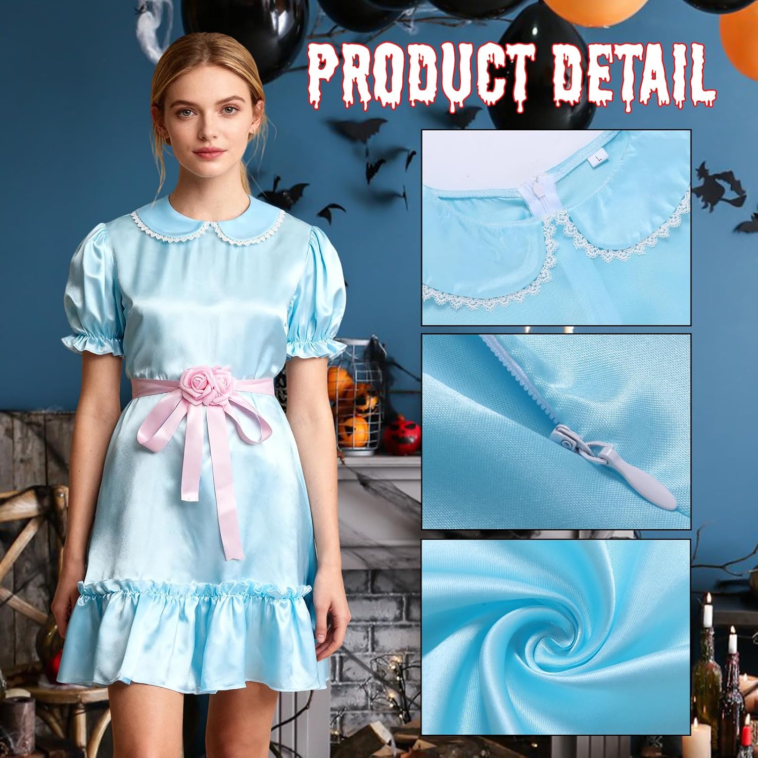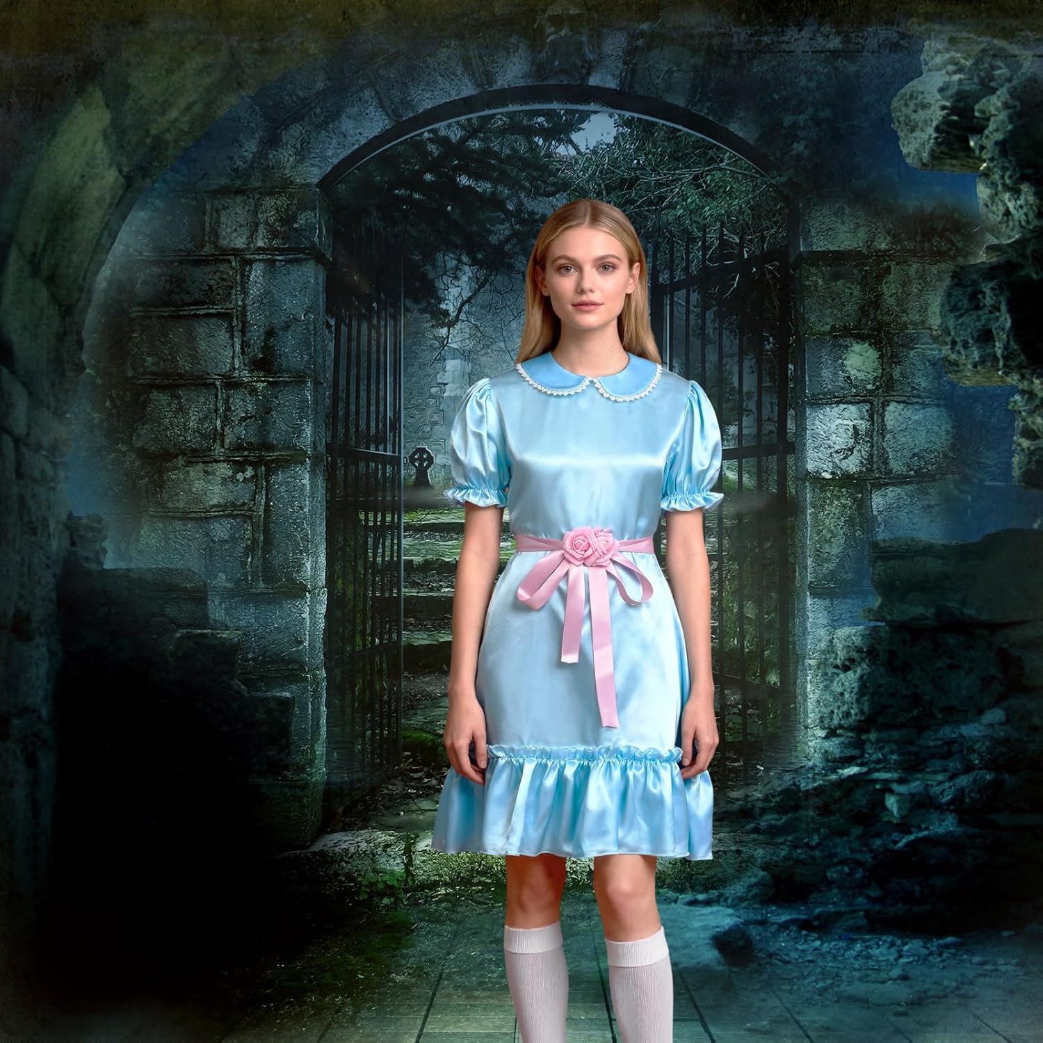 In our household, Halloween isn't so much an evening as it is a full-blown season. By the time the 31st arrives, we've already been knee-deep in fake blood, spooky decorations, and monster theme tunes - and we keep the fun going well into November. The decorations stay up until the Christmas ones take over on the 1st of December, and we have multiple parties in that time. It's a bit of a family tradition now, and who am I to argue with tradition? Especially when there's a child involved who's quite convinced zombies are for life, not just for Halloween. So, naturally, I was looking for a costume that could help to see me through this extended spooky period - something fun, a bit eerie, but still flattering. And this baby blue dress really delivered. It's clearly inspired by a certain iconic horror film (you know the one - long hallways, creepy twins, "forever and ever"), and it leans just the right amount into that reference. Instantly recognisable to those in the know, but still subtle enough to feel stylish rather than silly. The colour is lovely - a soft, glossy baby blue with a satin-like sheen that gives it a slightly surreal, doll-like quality. I was genuinely impressed by the fabric, which feels smooth and cool to the touch and looks far more polished than your average costume. The puffed sleeves and two-tier ruffled skirt give it some shape and movement, and the overall silhouette is charmingly unsettling in that sweet-but-sinister way. Perfect for this kind of look. I wasn't entirely sure about the collar - a bit too prim and proper for my taste - but the lace detailing is well done and fits the aesthetic. The ribbon belt was probably the one element that felt a little on the cheaper side, but it serves its purpose, and the two rose clips that come with it were actually higher quality than expected. They help pull the look together and give it a more finished feel. Fit-wise, it was slightly snug but not uncomfortably so. I managed to get it on and off quite easily thanks to the generous zip at the back. And most importantly, it's comfortable. I could wear it all evening without itching, adjusting, or plotting my escape after an hour. That alone makes it a winner in my books. A little unexpected bonus was the face paint set included - red, white, and blue. I'm still not quite sure how that ties in thematically, but it's certainly useful. I imagine it could be used to ghostify the look further, or add a little gore if you wanted to go full horror. Either way, it's a thoughtful inclusion and adds a bit of extra value. And speaking of value - at £21.99, I think it's very good. You get the dress, socks, accessories, and the paint, all in a package that looks and feels far better than many budget costumes. In fact, it's a shining example of how far these kinds of pieces have come. I remember years ago trying on costumes that felt like they'd fall apart if you sneezed in them. This one? It feels pretty well made. In short: it's eerie, it's elegant, and it's weirdly wearable. A great buy for anyone who likes their Halloween with a touch of vintage horror and a hint of satin. And especially for someone who's a fan of a certain author, like yours truly.