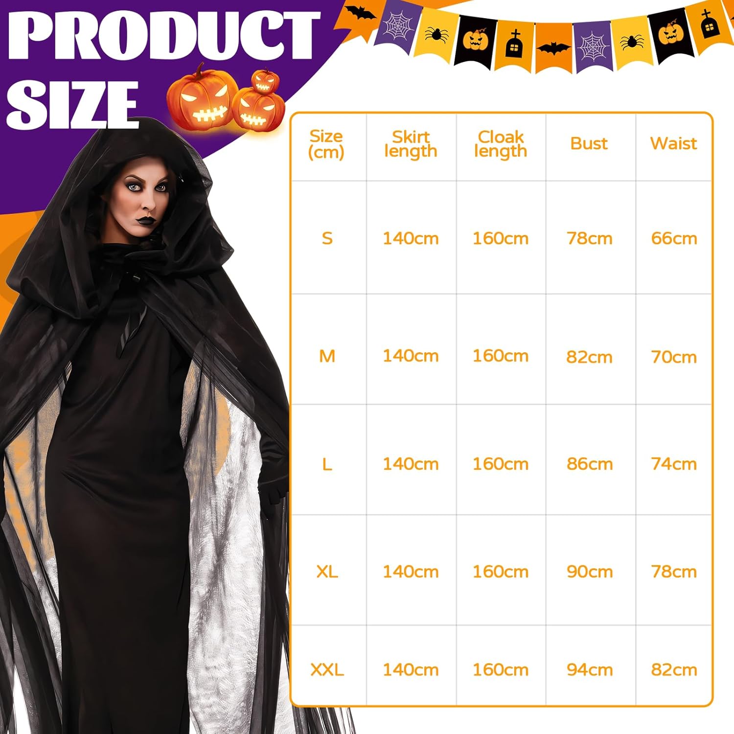 Descrizione prodotto Specifiche: Nome del prodotto: costume di Halloween Sposa fantasma Materiale: poliestere. Dimensioni: Lunghezza abito: 140 cm, lunghezza mantello 160 cm. S: busto 78 cm, vita 66 cm. M: circonferenza petto 82 cm, vita 70 cm. L: busto 86 cm, vita 74 cm. XL: busto 90 cm, vita 78 cm. XXL: busto 94 cm, vita 82 cm. Peso: 650 g Contenuto della confezione: mantello, vestito, guanti Avviso di sicurezza Non adatto per l'uso da parte di bambini di età inferiore a 3 anni