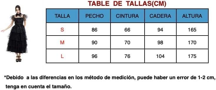 Costume da mercoledì addams donna, abito mercoledì Famiglia Addams Cosplay uniforme per Halloween Carnevale MATERIALE: costume mercoledì addams donna adolescente è realizzato in poliestere, morbido e traspirante, comodo da indossare INCLUDE: vestito e cintura DIMENSIONI: vestito addams cosplay mercoledì per adolescenti e donne. Si prega di selezionare la taglia giusta con la tabella delle taglie. OCCASIONE: Costume la famiglia addams è perfetta per partecipare a conferenze di cartoni animati, carnevali, giochi di ruolo natalizi, giochi di ruolo, feste a tema, abbigliamento, feste di compleanno, fotografia, spettacoli, ecc. ATTENZIONE: le misure specificate sono della persona, non del costume. In caso di dubbio, si prega di selezionare la taglia superiore, perché la taglia è piccola.