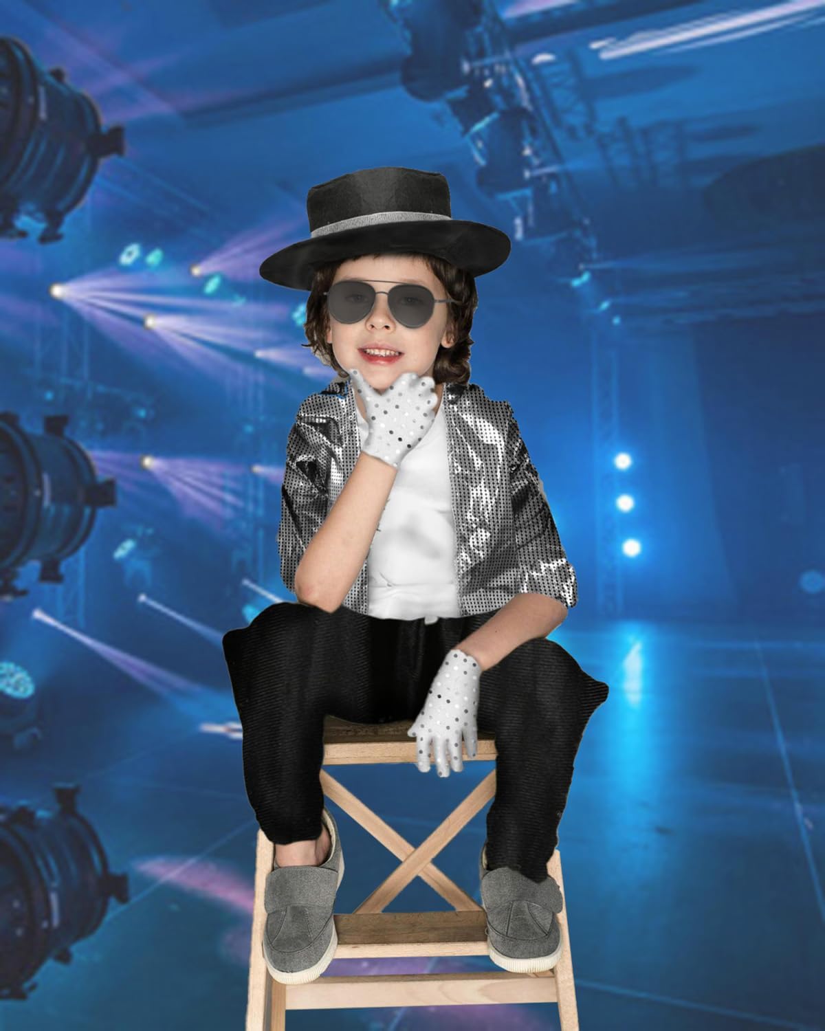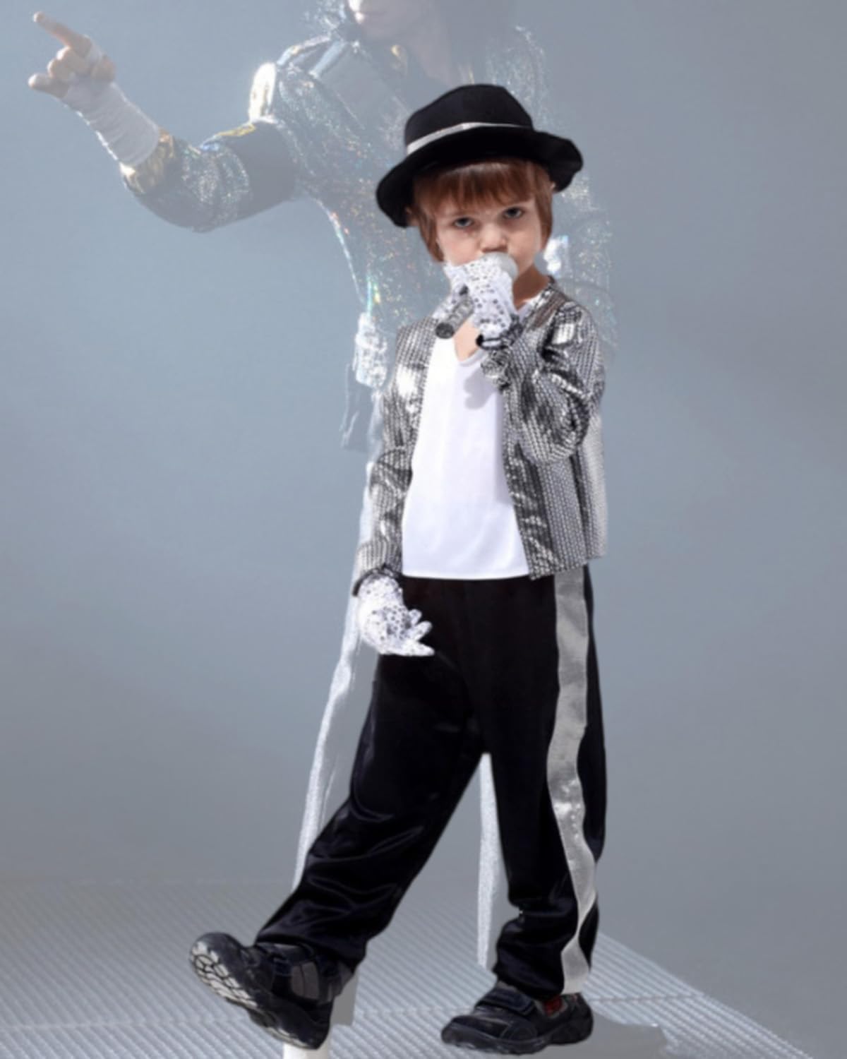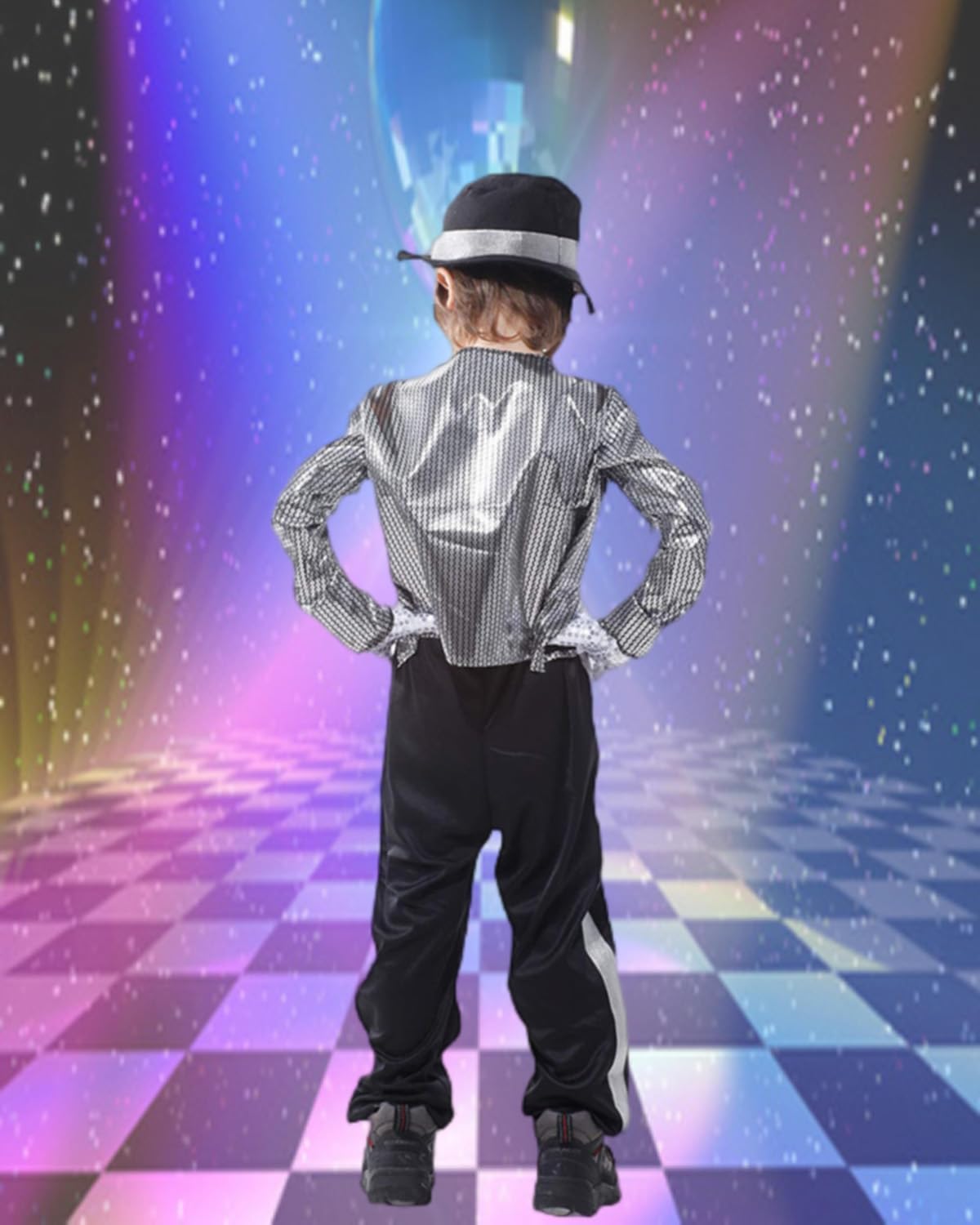 Costume unisex da Super Star Michael, per ragazzi, Pop King, colore: argento scintillante, con cappello, occhiali da sole, guanti per carnevale, scuola, spettacoli, discoteca, danza, cosplay, feste 1. Kit costume MJ: top + pantaloni + cappello + occhiali da sole + guanti. 2. Materiale: poliestere. 3. Colore: nero e argento. 4. Ci sono 4 diverse taglie disponibili per ragazzi e ragazze, si prega di fare riferimento alla nostra tabella delle taglie nella foto prima di ordinare