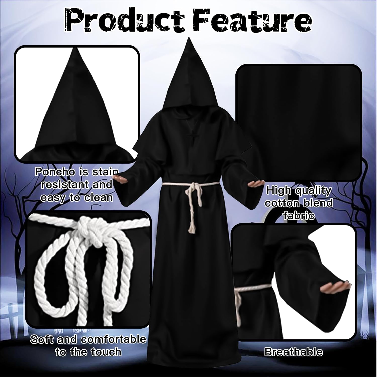 Caratteristiche del prodotto: 1. Genere illimitato: il design unisex rende questo abito da monaco con cappuccio adatto sia a uomini che a donne. Semplice ed elegante, ripristina lo stile rinascimentale medievale. 2. Aggiunta di un'atmosfera horror: il mantello del costume da monaco è in colori classici, non facilmente visibile al buio. L'orologio può aggiungere un'atmosfera horror durante il festival e lasciarti un ricordo profondo. Specifica: Materiale: poliestere, cotone, legno Dimensioni confezione: 28,5 x 17 x 5,6 cm (11,22 x 6,69 x 2,02 pollici) Colore nero Peso: 580,00 grammi (1,28 libbre) Il prodotto include: 1 vestaglia 1 mantello 1 collana con croce 1 cordino Avviso: 1. Misurazione manuale, la dimensione è leggermente errata, per favore capisci. 2. A causa delle diverse impostazioni dello schermo, il colore potrebbe essere leggermente diverso, l'immagine è solo di riferimento. Servizio: Ci impegniamo a fornire ai nostri clienti prodotti affidabili e di alta qualità. Se non sei soddisfatto di qualcosa, contattaci e lo risolveremo immediatamente.