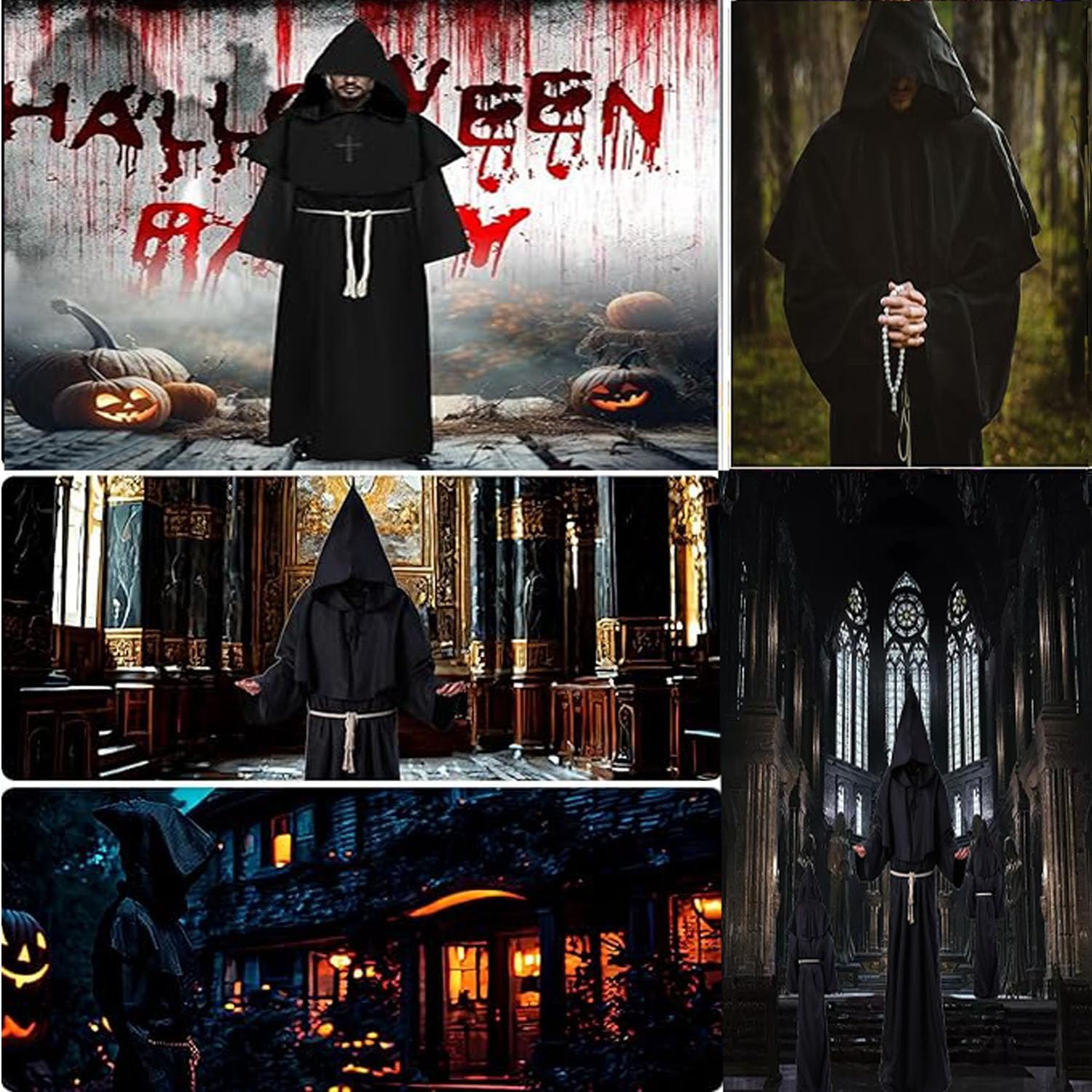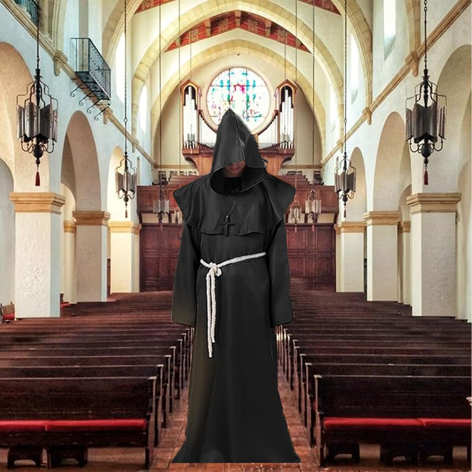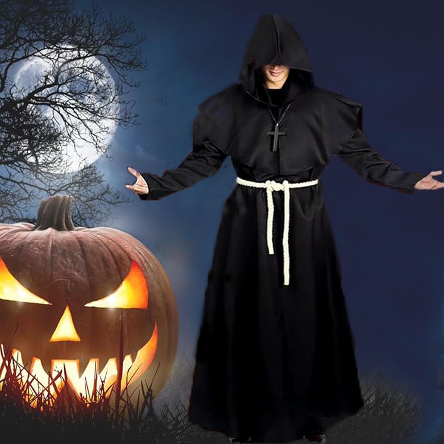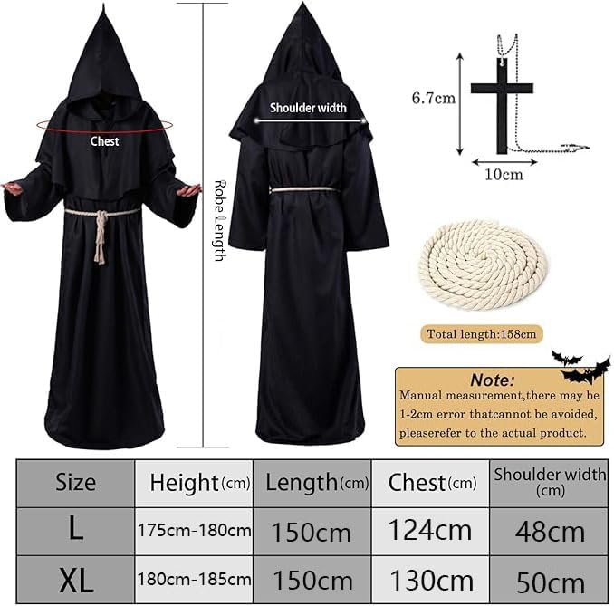 Descrizione prodotto Descrizione prodotto TaiXinYuly Costume da monaco medievale con cappuccio, costume da monaco medievale, abito rinascimentale, costume da monaco medievale per adulti - veste lunga con cappuccio + croce in legno. Caratteristiche del prodotto: 1. Il costume da monaco presenta un design oversize con una corda in vita per indossarlo e toglierlo facilmente, e la cintura inclusa può rendere la veste più stretta per adattarsi a una varietà di taglie, adatta sia a uomini che a donne. 2. I costumi da monaco sono realizzati in poliestere morbido e confortevole, resistente, resistente al colore, morbido e confortevole e innocuo per la pelle e la salute. 3. Adatto per Halloween, costumi cosplay, carnevali, costumi di scena, feste in costume, feste a tema, balli, ecc. Specifiche: Nome del prodotto: Costume da monaco Materiale: 100% poliestere Colore: Nero Dimensioni: come mostrato Il prodotto include: 1 x accappatoio 1 x mantello 1 x collana con croce 1 x cordino Avviso di sicurezza NO