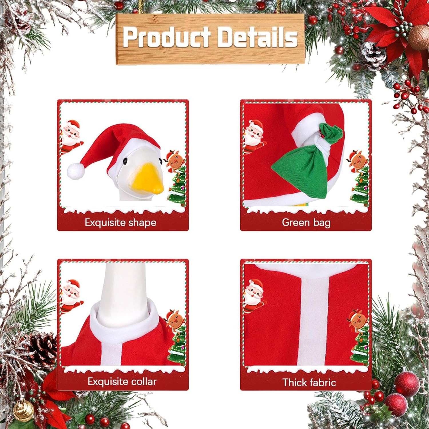 Migliora le vacanze all'aperto: progettati per migliorare le aree esterne, questi abiti a tema natalizio creano una calda atmosfera festiva, rendendo il tuo portico pronto per le celebrazioni delle vacanze Ricca estetica festiva: aggiunge ricchezza visiva al tuo arredamento esterno includendo un set completo di abiti natalizi, garantendo un look festivo accattivante e coeso per le tue oche portico con ogni elemento accuratamente realizzato Elegante stile festivo: realizzato appositamente per statue di oche da 58,4 cm, questo vestito combina un look elegante con una vestibilità esatta, migliorando il fascino generale delle tue decorazioni stagionali senza sforzo Tessuto robusto e morbido: realizzato in eccellente tessuto di poliestere, offre una sensazione morbida ma robusta, progettata per resistere a un uso a lungo termine mantenendo il suo fascino festivo e prestazioni affidabili Ampie applicazioni: migliora il giardino, il patio e le feste, adatto per compleanni, fidanzamenti e riunioni di vacanza, ampiamente applicabile elevando l'estetica stagionale all'aperto con design creativi