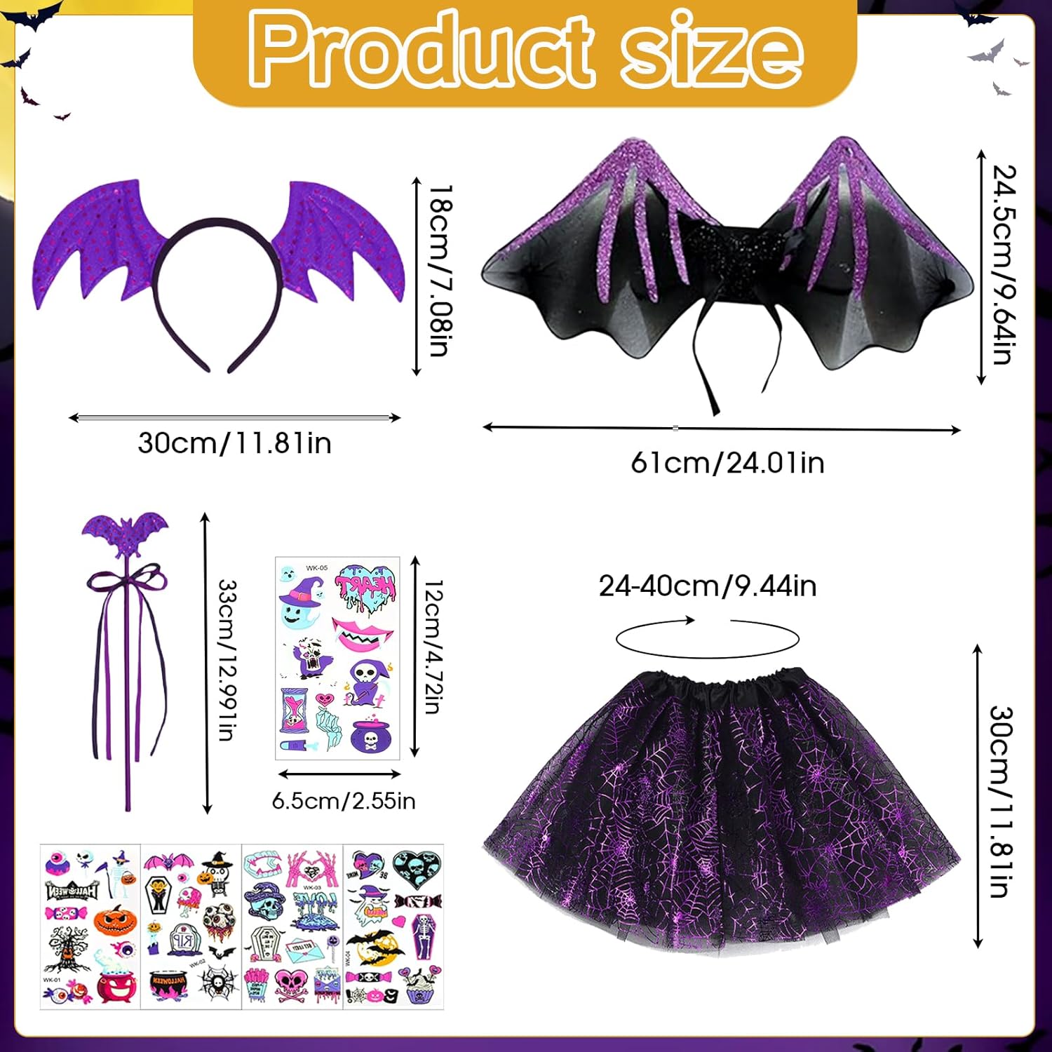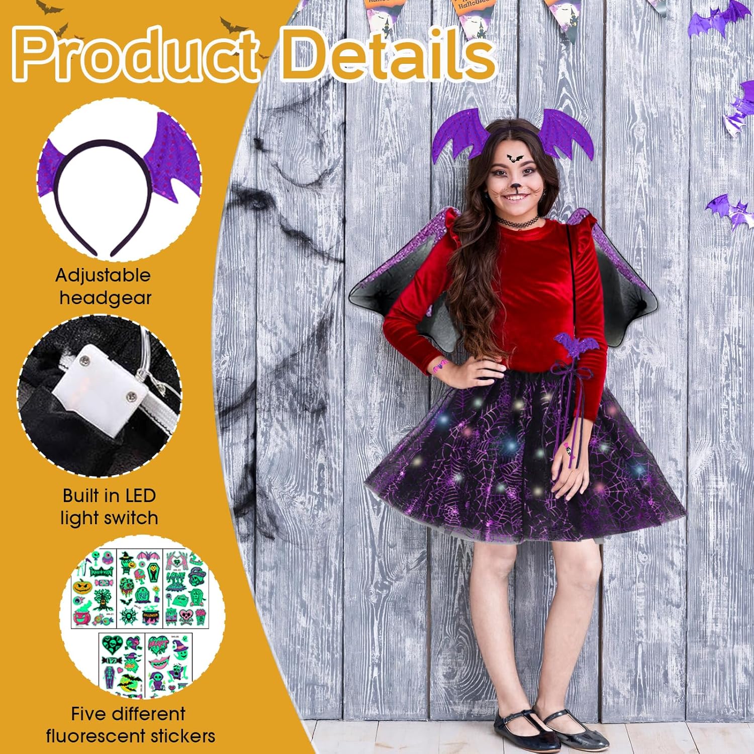 Descrizione prodotto Tccydm Halloween Costume da Pipistrello, Costume da Strega per Bambina, 4 Pezzi Halloween Costume da Pipistrello per Bambini con Cerchio per Capelli+Gonna Tutù+Ali+Bacchetta per Feste, Cosplay e Halloween. Caratteristiche: -Design Premium, Questo costume da pipistrello è realizzato in tessuto morbido e traspirante, offrendo un comfort ottimale per gli eventi serali. -Con il suo design unico e gli elementi carnevaleschi, è un costume da pipistrello classico, bello e divertente per bambini, bambine e bambini. -Facile da indossare, queste ali da pipistrello hanno le dimensioni perfette per i bambini e sono facili da indossare e togliere. -Questo costume da pipistrello per bambini presenta un look creativo e unico che attirerà l'attenzione di qualsiasi bambina a qualsiasi festa di Halloween. Specifiche: Materiale:tulle di poliestere Colore: Come mostra l'immagine Dimensioni: Come mostra l'immagine Lista di imballaggio: 1 * Tiara 1 * Bacchetta Magica 1 * Ali 1 * LED tutù 5 * Adesivi Fluorescenti Nota: ➤ Si prega di consentire una leggera differenza di dimensione a causa della diversa misurazione manuale. ➤ A causa della luce e della differenza di impostazione dello schermo, il colore dell'articolo potrebbe essere leggermente diverso dalle immagini. Avviso di sicurezza No