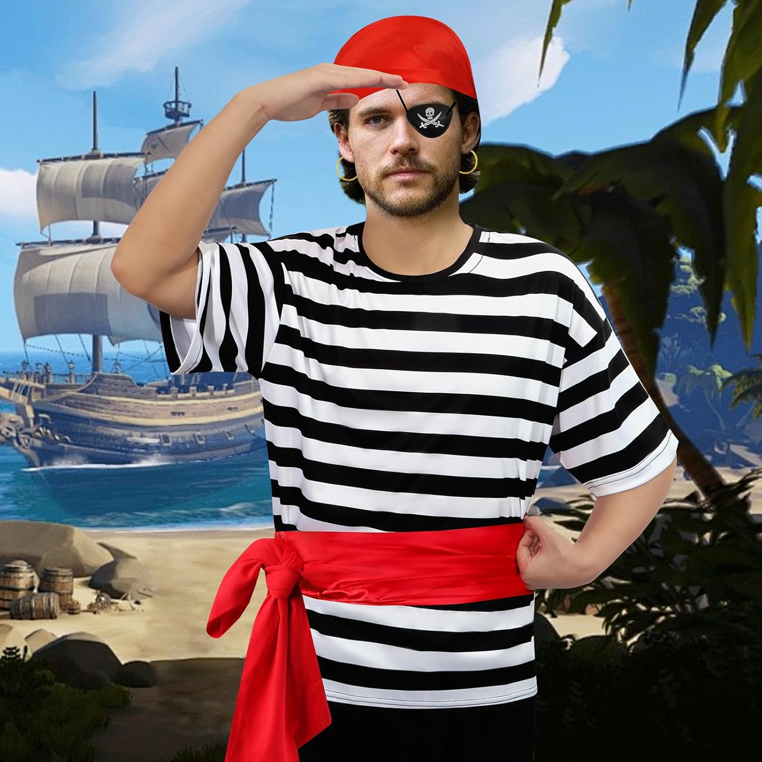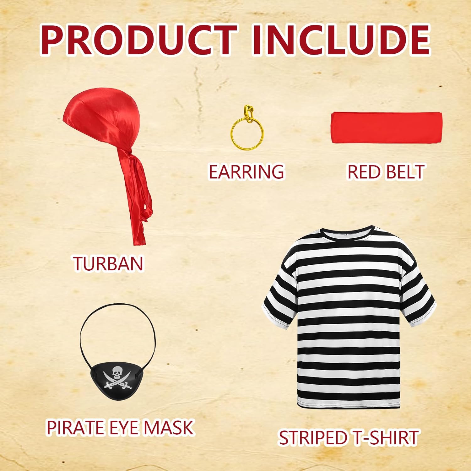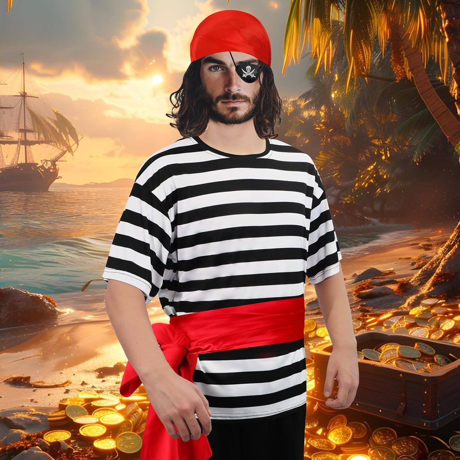 Descrizione prodotto Questo set di costumi da pirata comprende 5 articoli: 1 top a maniche corte a righe bianche e nere, 1 bandana rossa, 1 cintura di raso, 1 benda sull'occhio da pirata e 1 paio di orecchini. Questo set presenta caratteristiche strisce bianche e nere, che lo distinguono dalle altre combinazioni di colori. La maglia a maniche corte a righe bianche e nere è lunga circa 70 cm, il che la rende adatta alla maggior parte delle persone. La vita misura circa 200 cm e può essere regolata per adattarsi avvolgendo la vita. La maglia a maniche corte a righe bianche e nere è realizzata in tessuto morbido e traspirante. Il cappuccio e la vita sono realizzati in raso, liscio, confortevole e di colore brillante. La benda sull'occhio ha un cordino elastico per indossarla facilmente. Questo costume da pirata presenta un originale design a strisce nautiche, completato da accessori a tema pirata come la bandana, la benda sull'occhio, la cintura e gli orecchini. Indossalo e immergiti in un'avventura nautica, emanando un elegante fascino da pirata. Questo costume è perfetto per vari eventi tra cui feste pirata, cosplay, feste in crociera, feste in maschera, carnevali, Halloween, feste di compleanno ed eventi a tema pirata. È anche un regalo premuroso per la famiglia e gli amici, rendendolo un'ottima scelta per ogni occasione. Avviso di sicurezza n
