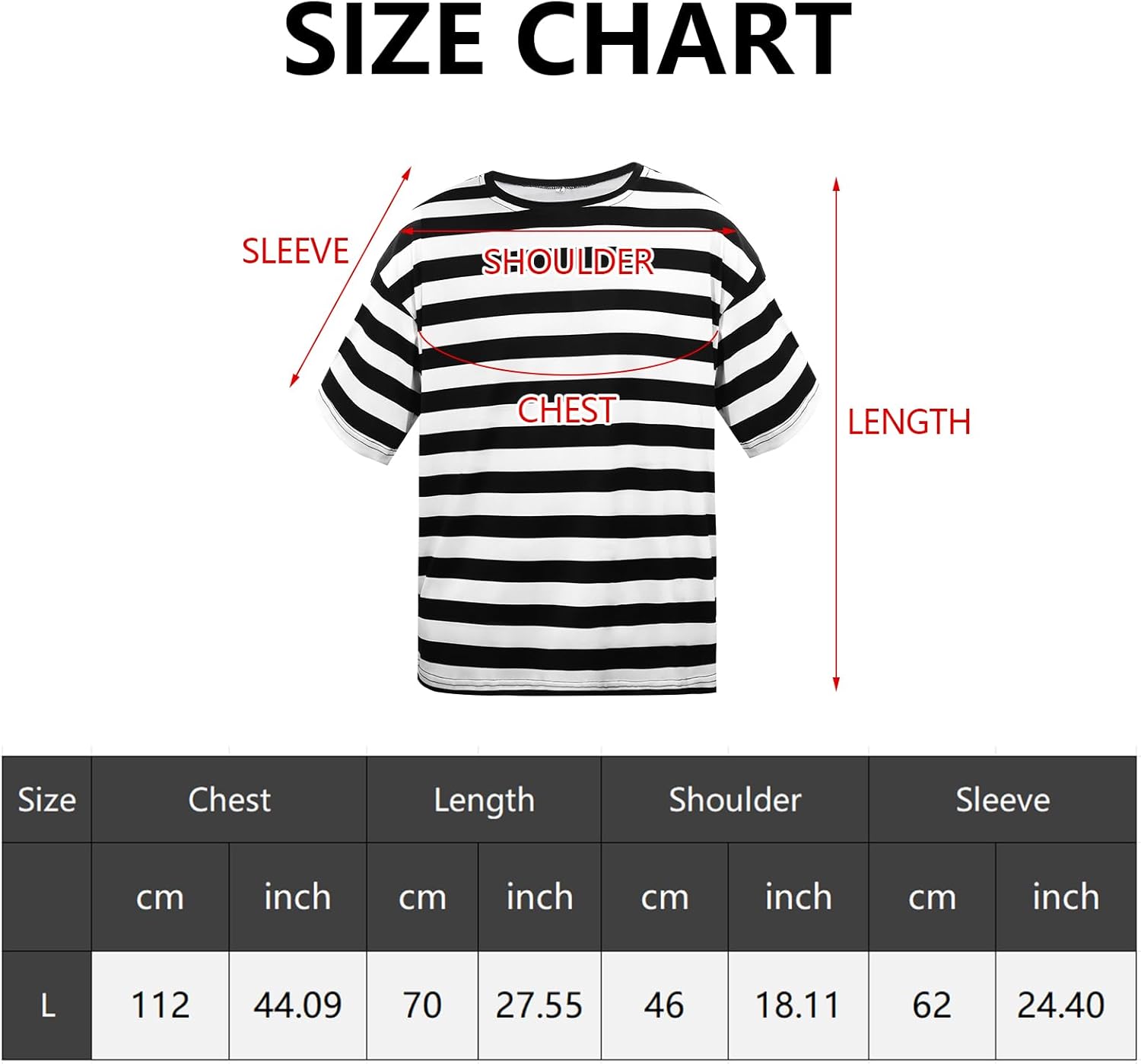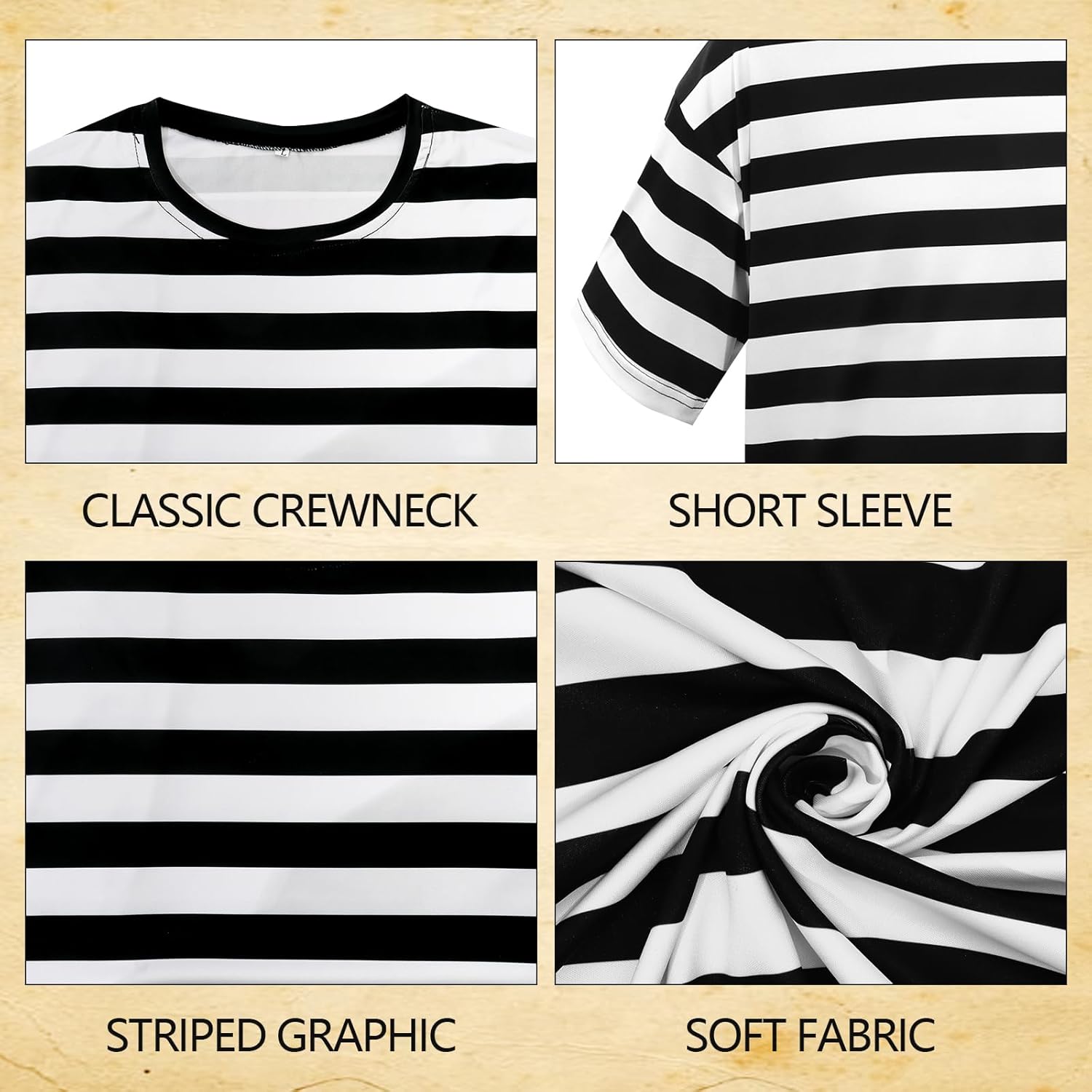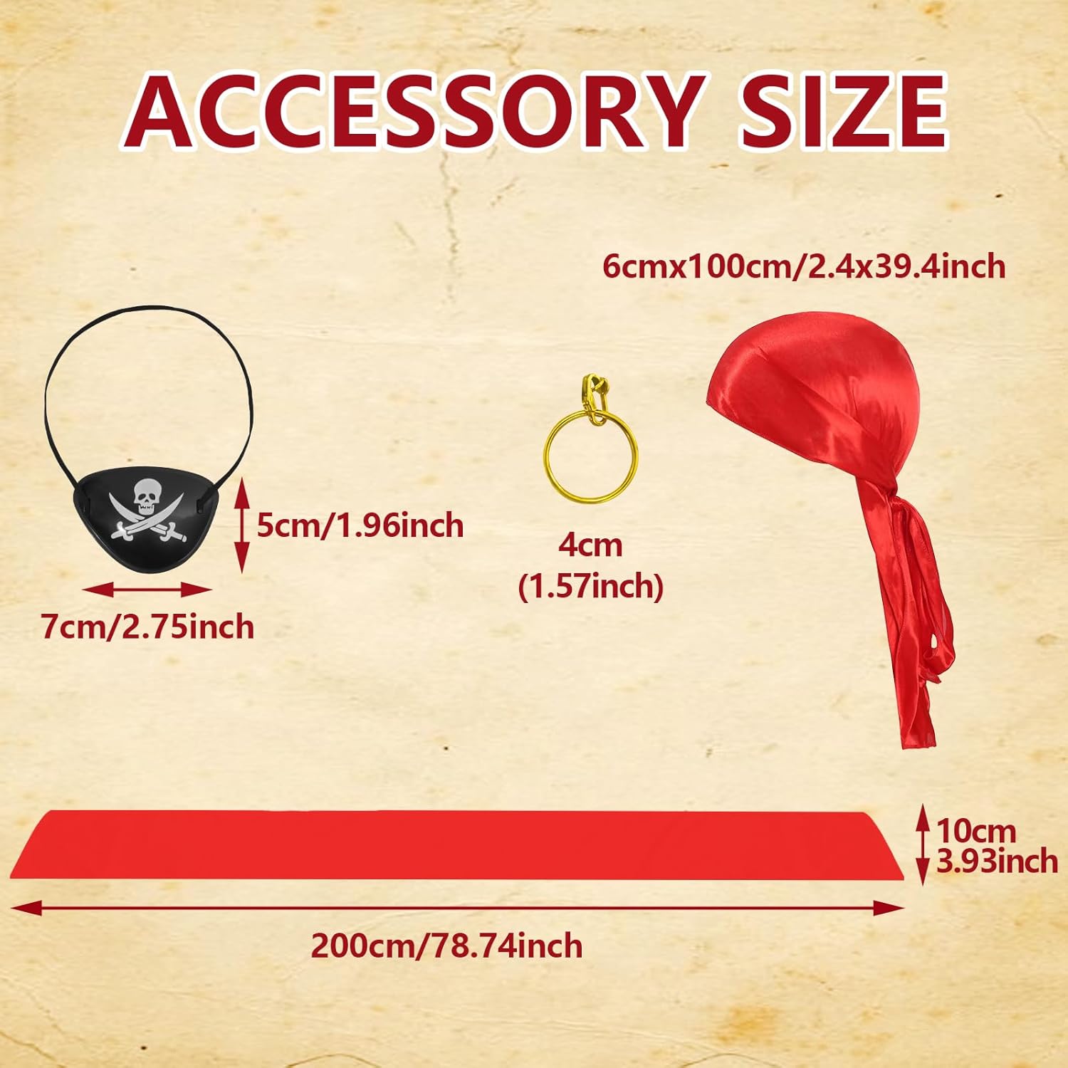 Descrizione prodotto Questo set di costumi da pirata comprende 5 articoli: 1 top a maniche corte a righe bianche e nere, 1 bandana rossa, 1 cintura di raso, 1 benda sull'occhio da pirata e 1 paio di orecchini. Questo set presenta caratteristiche strisce bianche e nere, che lo distinguono dalle altre combinazioni di colori. La maglia a maniche corte a righe bianche e nere è lunga circa 70 cm, il che la rende adatta alla maggior parte delle persone. La vita misura circa 200 cm e può essere regolata per adattarsi avvolgendo la vita. La maglia a maniche corte a righe bianche e nere è realizzata in tessuto morbido e traspirante. Il cappuccio e la vita sono realizzati in raso, liscio, confortevole e di colore brillante. La benda sull'occhio ha un cordino elastico per indossarla facilmente. Questo costume da pirata presenta un originale design a strisce nautiche, completato da accessori a tema pirata come la bandana, la benda sull'occhio, la cintura e gli orecchini. Indossalo e immergiti in un'avventura nautica, emanando un elegante fascino da pirata. Questo costume è perfetto per vari eventi tra cui feste pirata, cosplay, feste in crociera, feste in maschera, carnevali, Halloween, feste di compleanno ed eventi a tema pirata. È anche un regalo premuroso per la famiglia e gli amici, rendendolo un'ottima scelta per ogni occasione. Avviso di sicurezza n