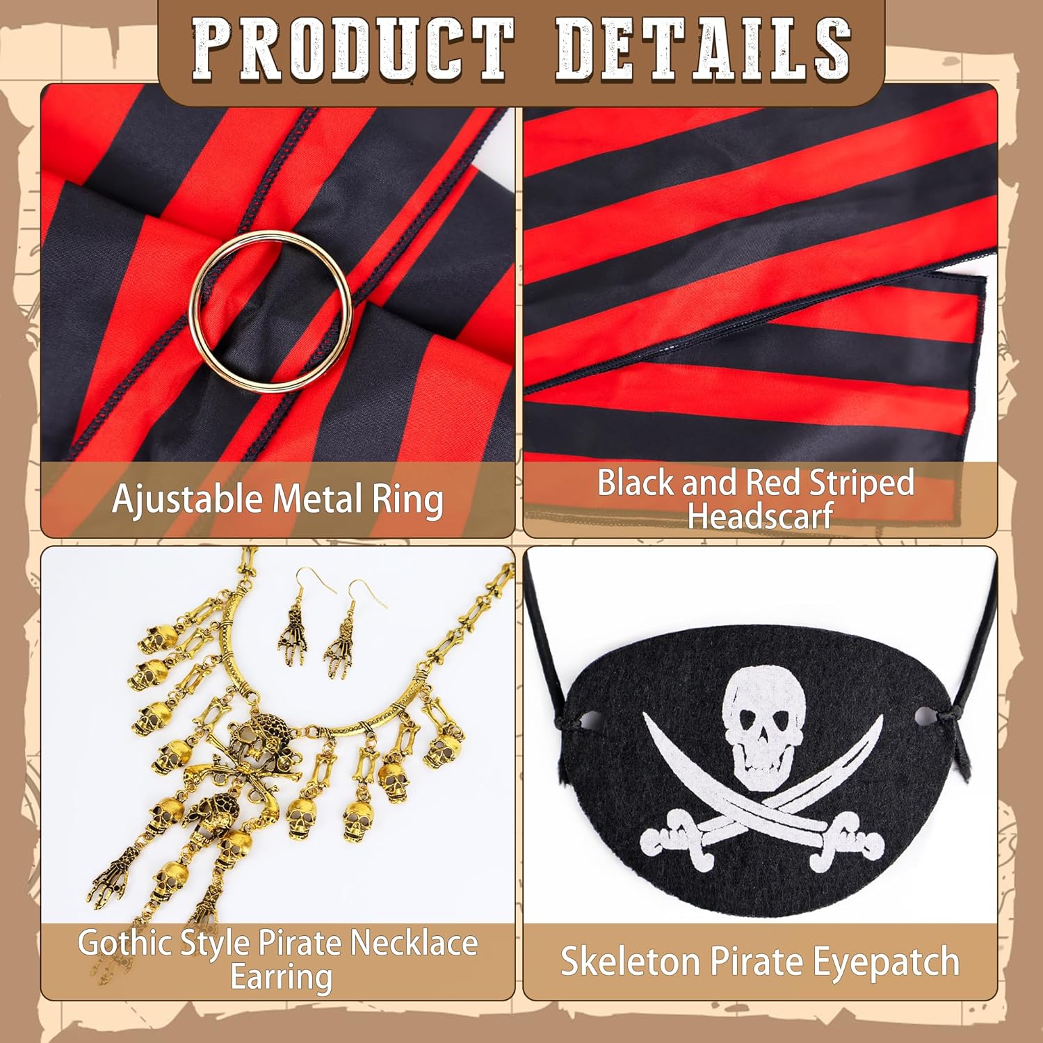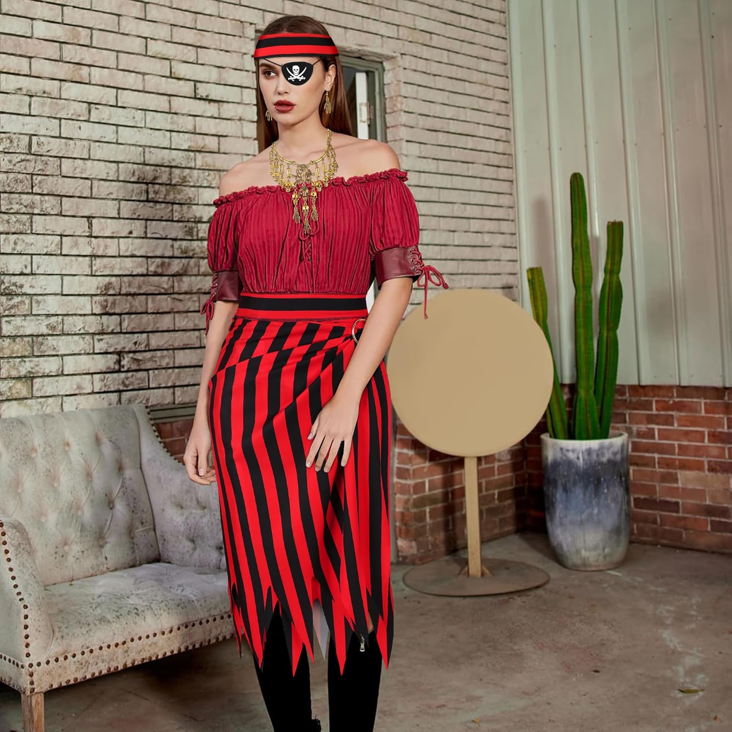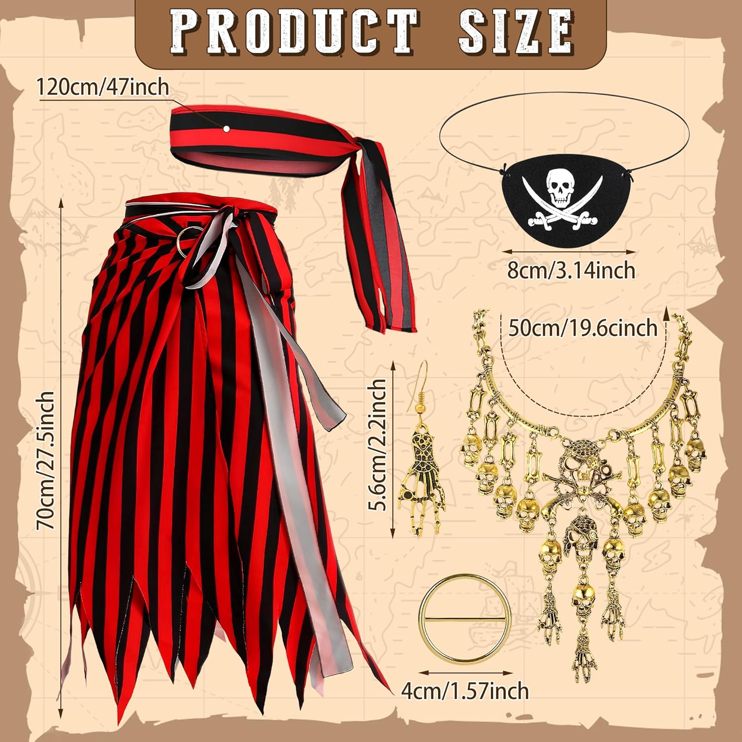 Costume da pirata da donna, accessori per costume da pirata, set di accessori da pirata, con gonna da pirata, sciarpa, collana, orecchini e benda per gli occhi, per Halloween, cosplay, feste